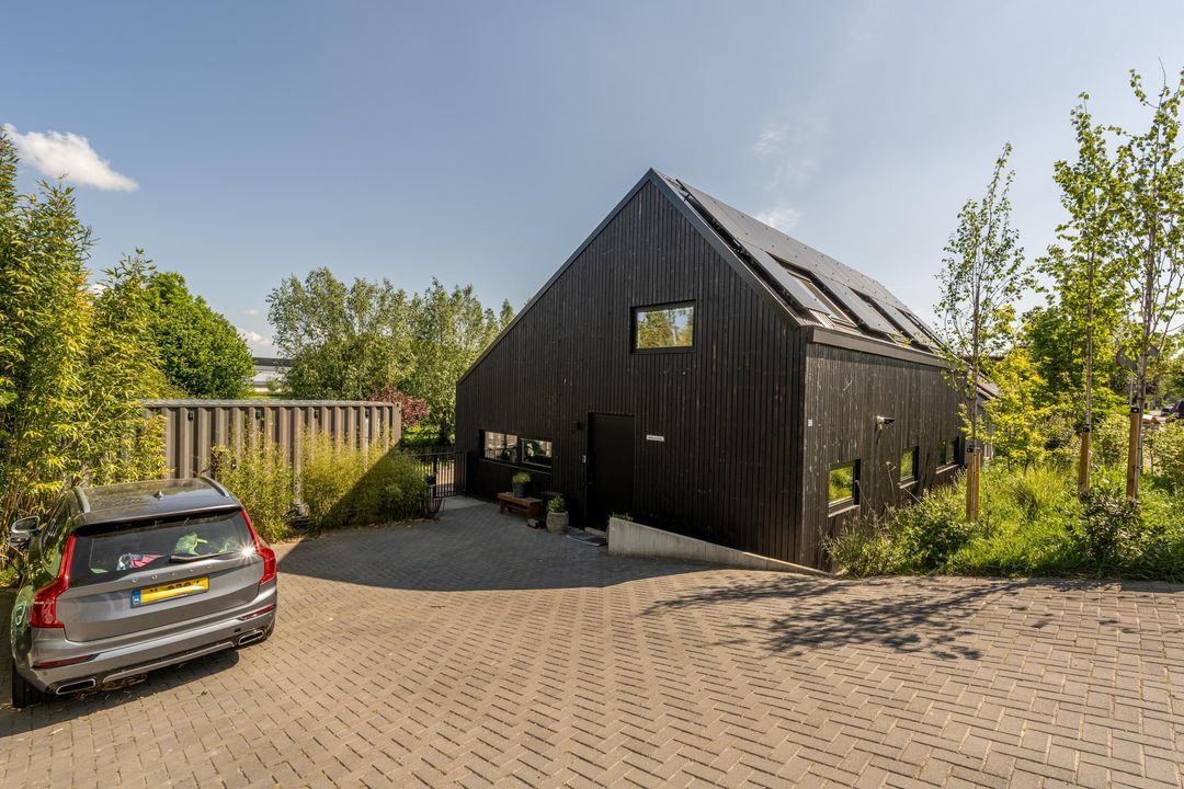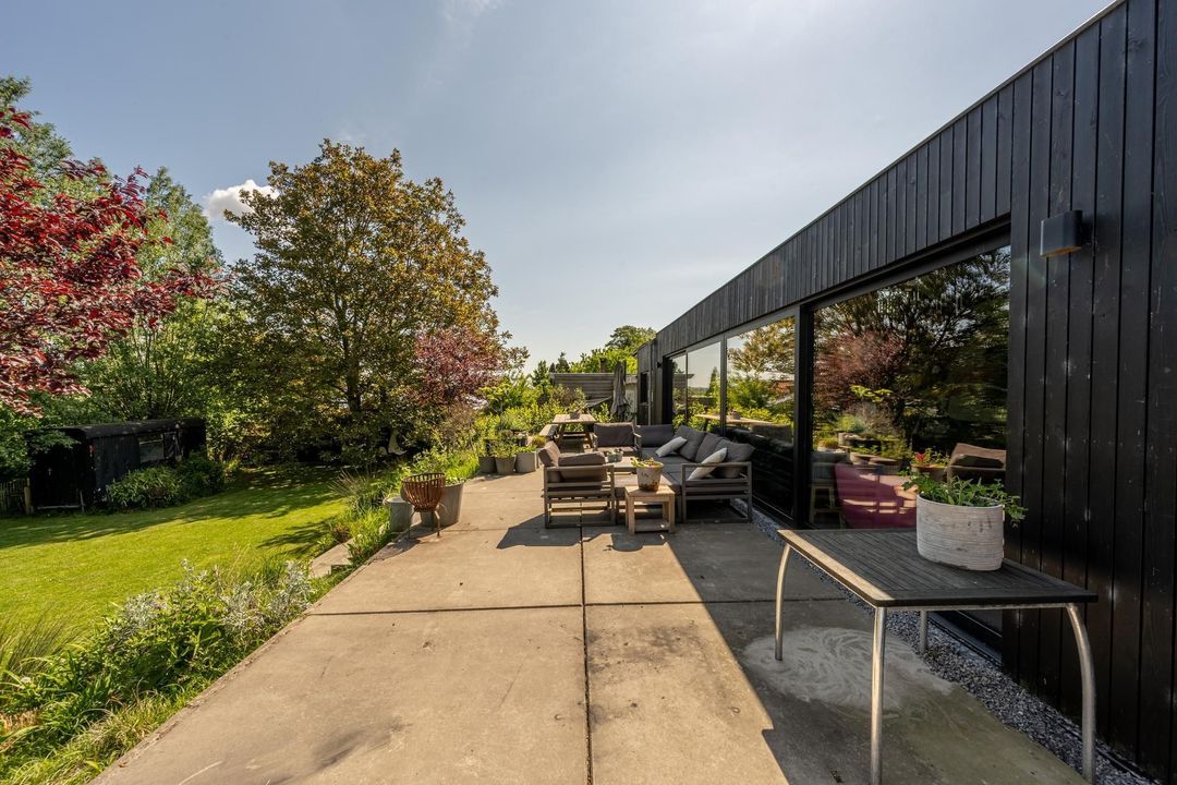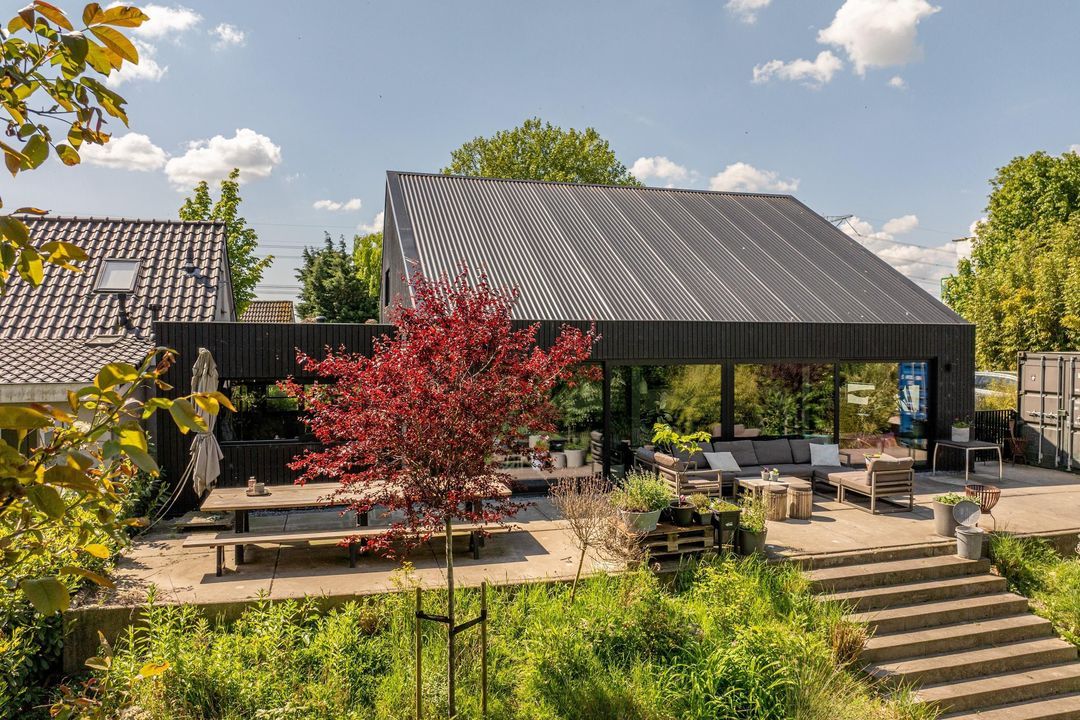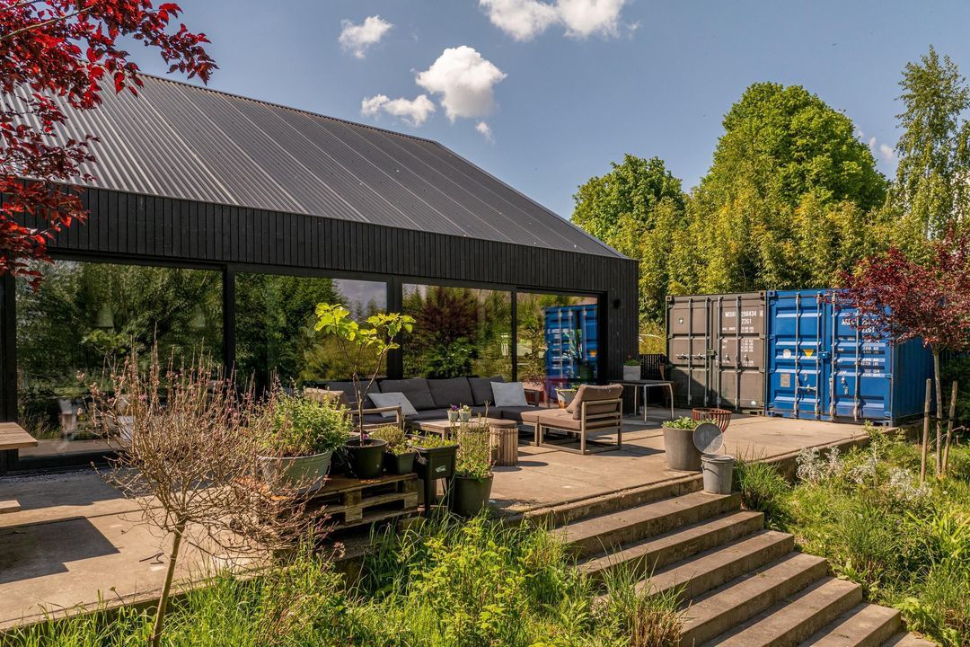 De woning is aan de buitenzijde voorzien van zwarte aluminium dakpanelen, zwarte aluminium kozijnen, zwarte houten wandafwerking en heeft aan de achterzijde over de volle breedte een royaal betonnen terras en in de tuin een pipowagen en twee externe bergingen in de vorm van losstaande zeecontainers. Vanaf het betonnen terras stap je via een brede betonnen trap de lager gelegen riante achtertuin in met veel gras en weelderig groen. Op eigen terrein zijn naast de woning meerdere auto’s te parkeren.