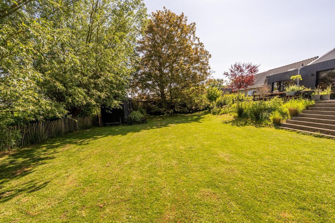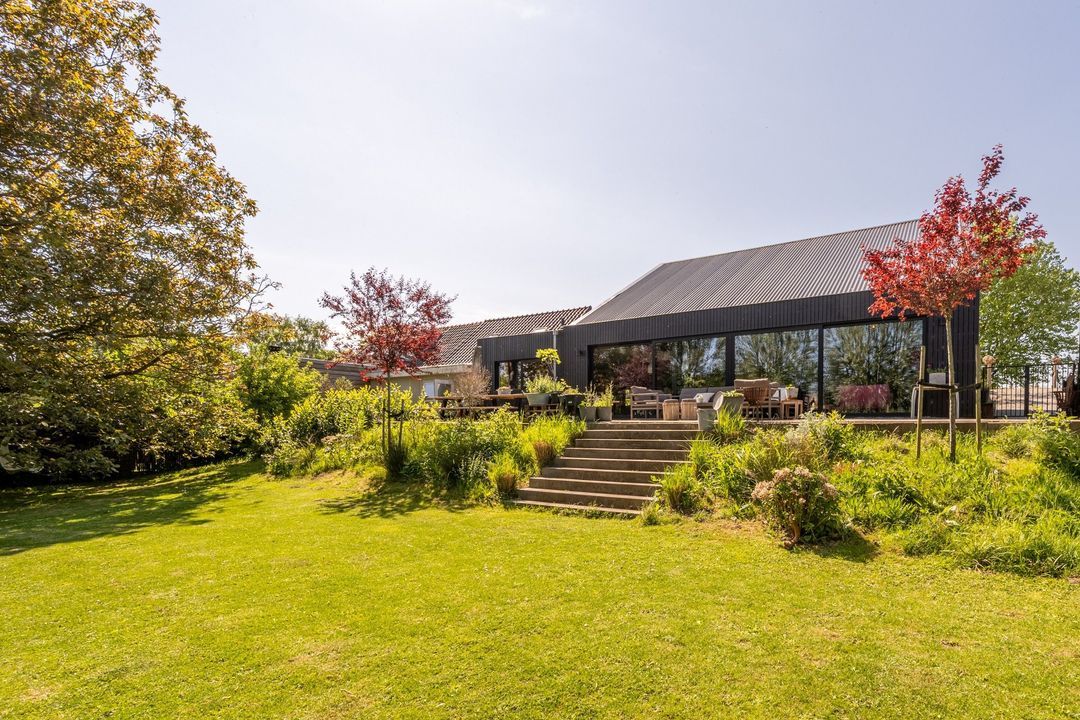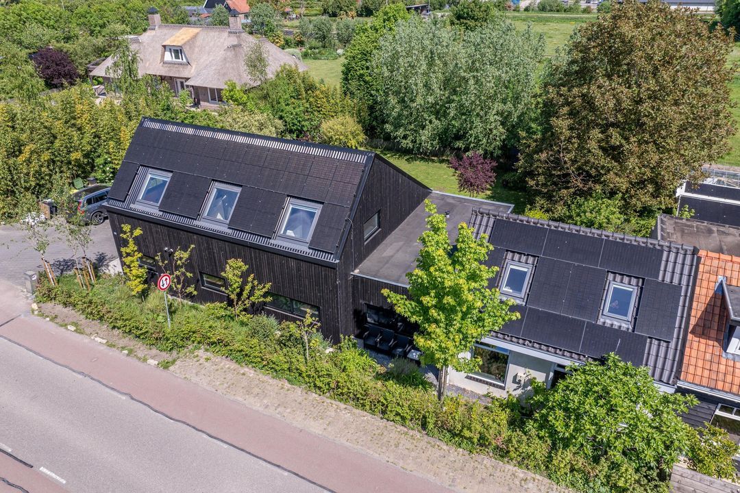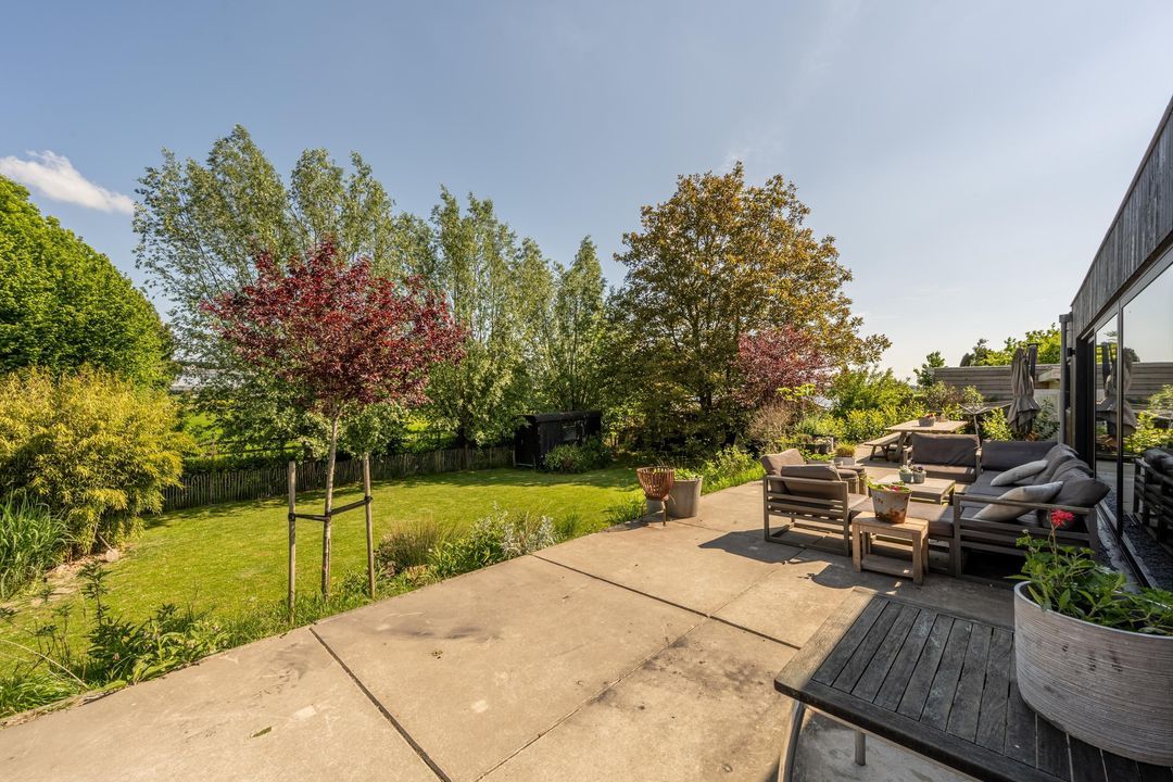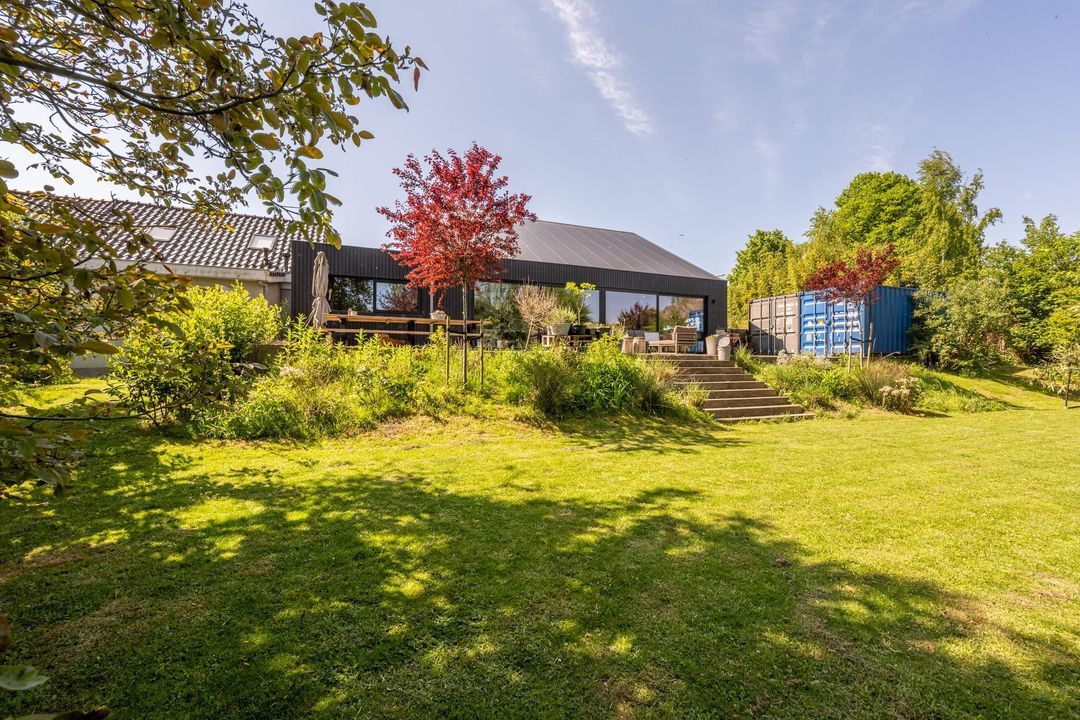 De woning is aan de buitenzijde voorzien van zwarte aluminium dakpanelen, zwarte aluminium kozijnen, zwarte houten wandafwerking en heeft aan de achterzijde over de volle breedte een royaal betonnen terras en in de tuin een pipowagen en twee externe bergingen in de vorm van losstaande zeecontainers. Vanaf het betonnen terras stap je via een brede betonnen trap de lager gelegen riante achtertuin in met veel gras en weelderig groen. Op eigen terrein zijn naast de woning meerdere auto’s te parkeren.