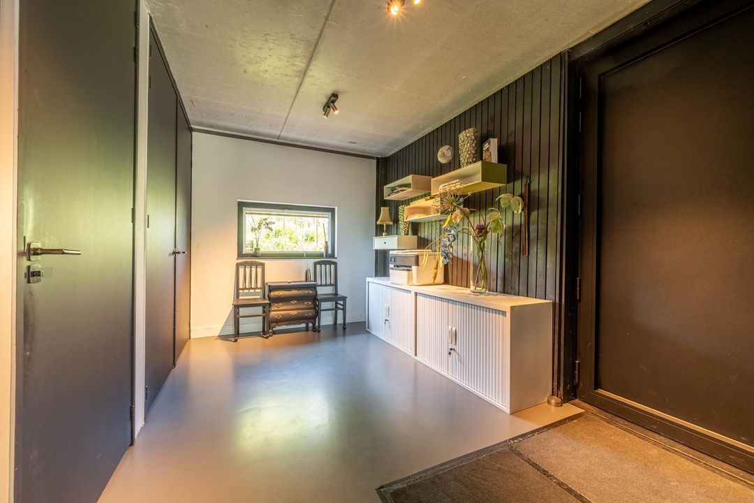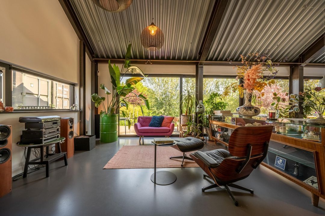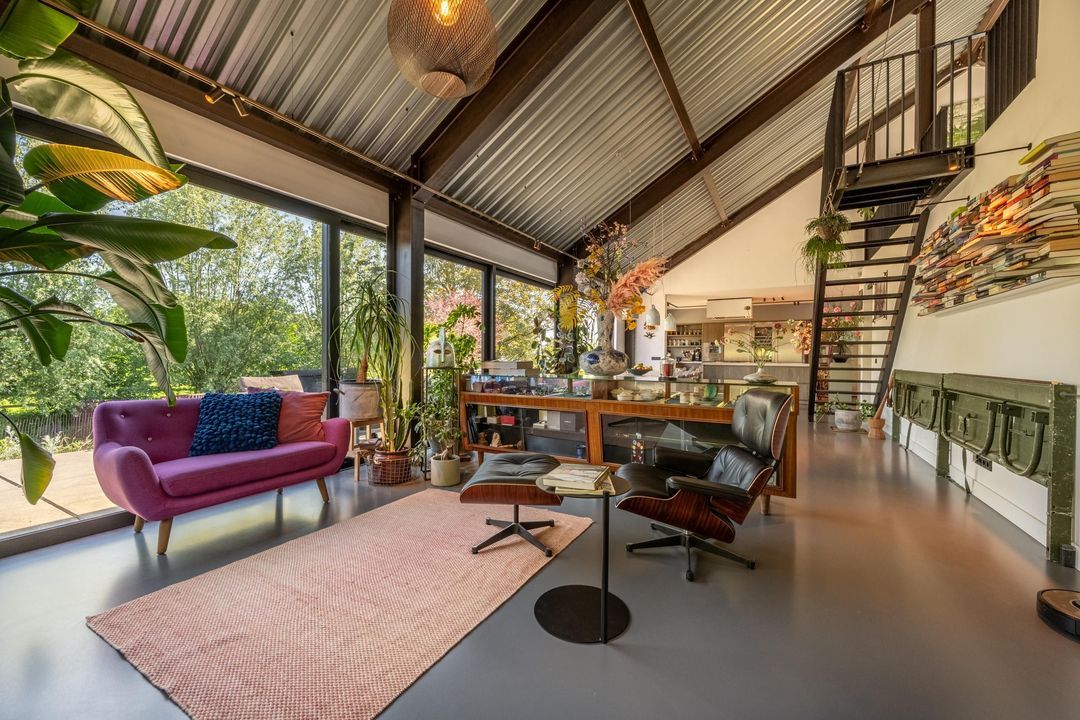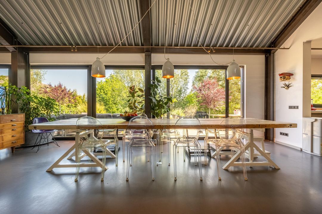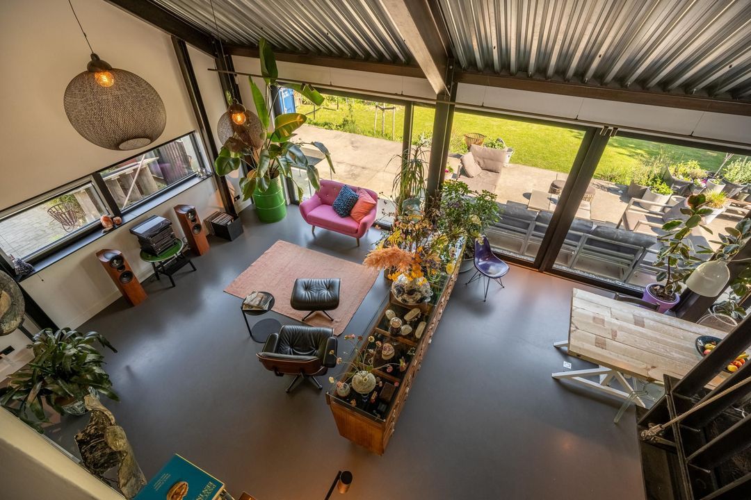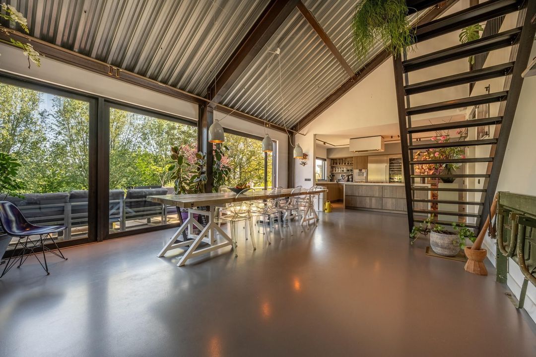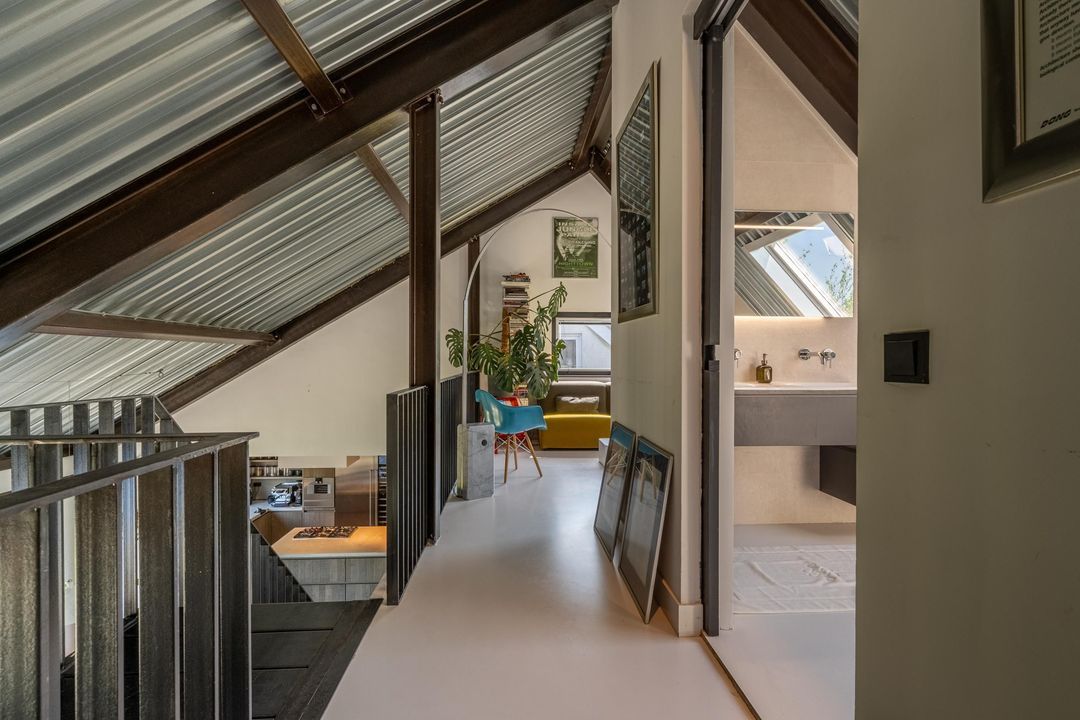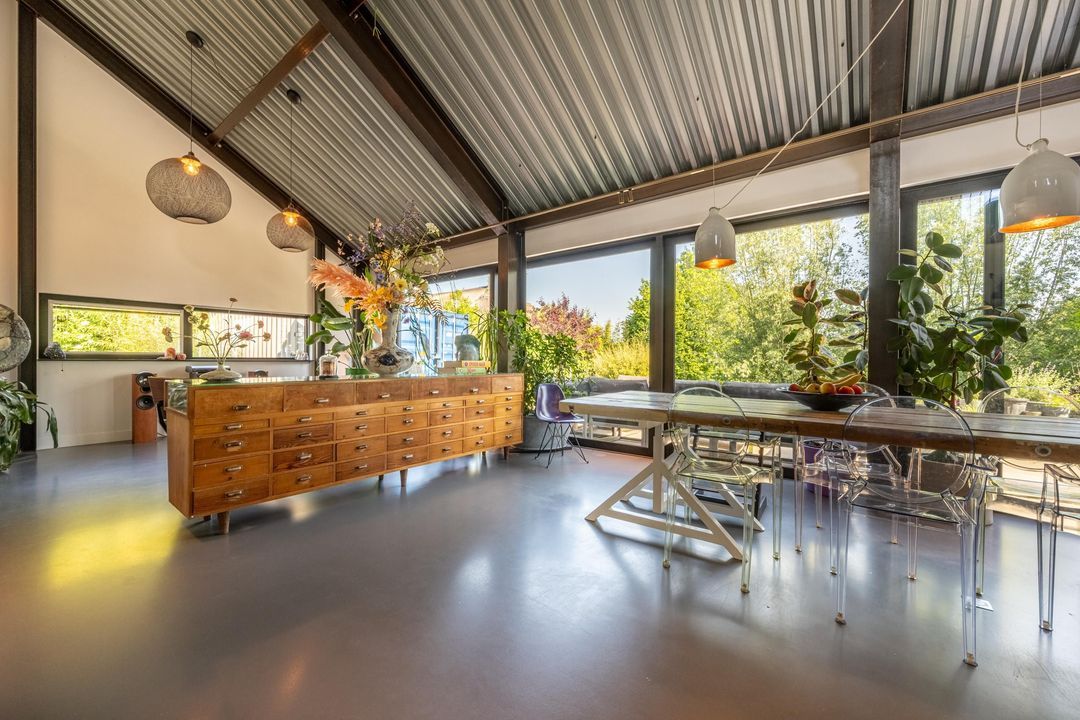 - Fraaie industriële afwerking met stalen spanten, gietvloeren, marmeren wanden, betonnen plafonds en keukenbladen, voornamelijk aluminium en deels houten kozijnen, RVS en aluminium plafond en dakplaten en houten wandafwerking buitenzijde.
