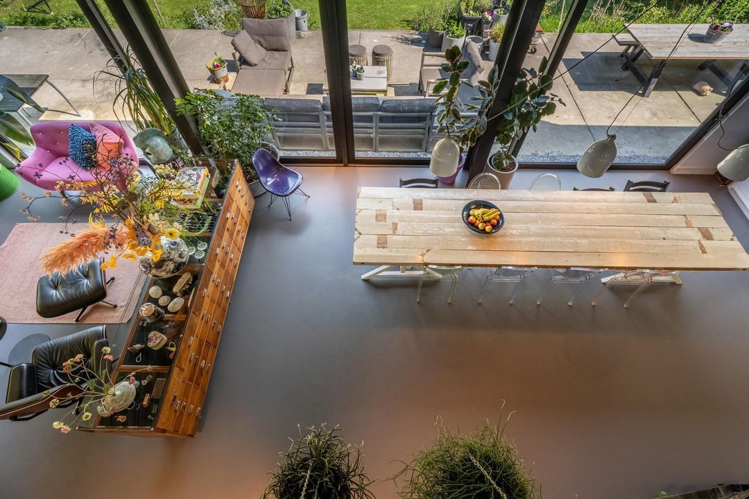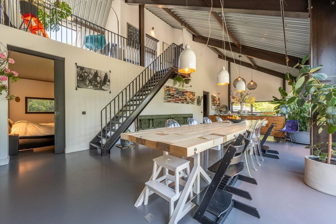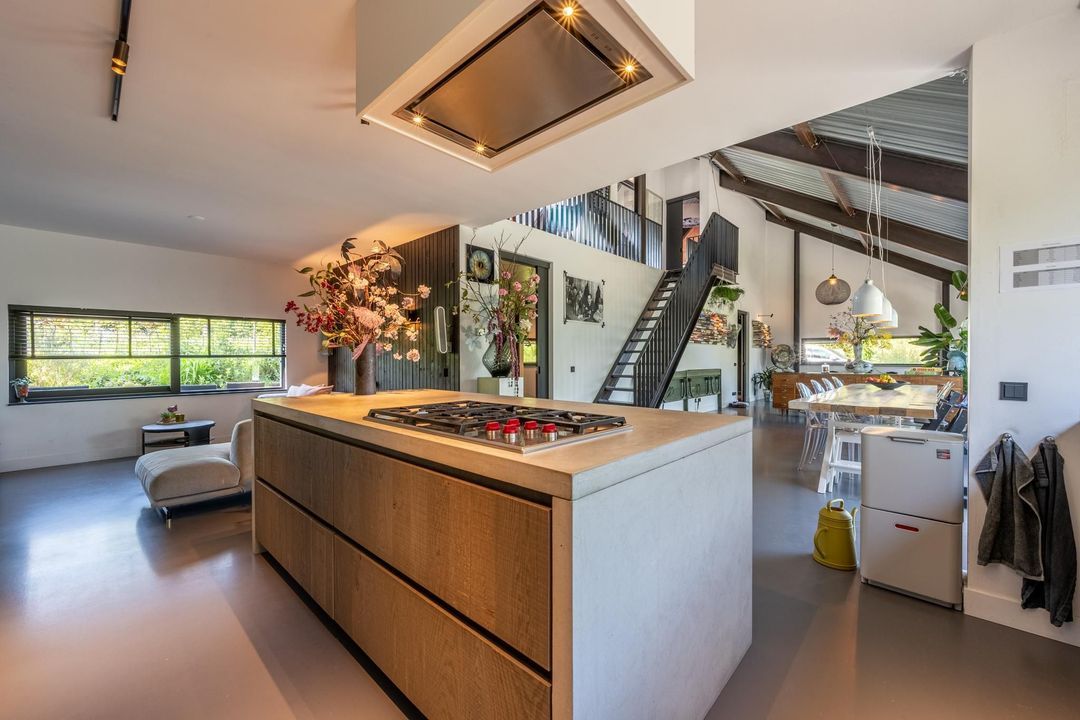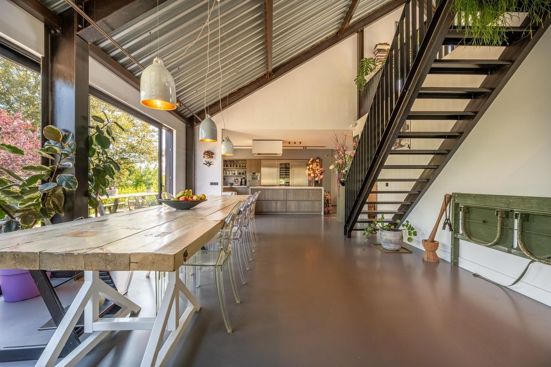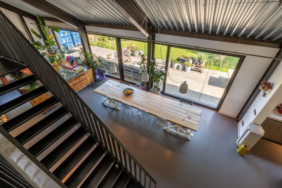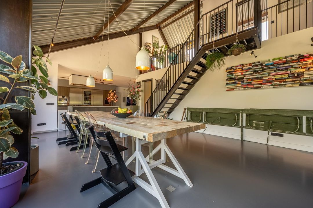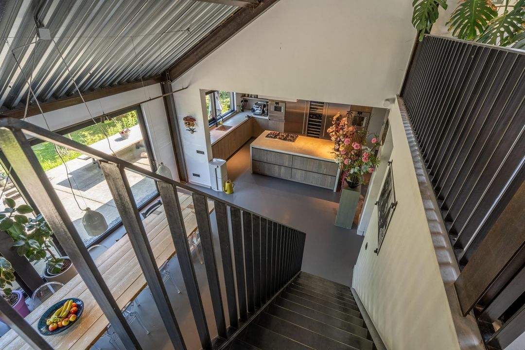De keuken staat in prachtige open verbinding met de rest van het nieuwe woondeel. Hier springen direct de indrukwekkende ruimtebeleving met het hoge plafond, de vide met grote stalen trap en de grote glazen achterpui in het oog, alsmede de industriële afwerking met stalen spanten, gietvloeren, aluminium kozijnen en RVS en betonnen plafonds.