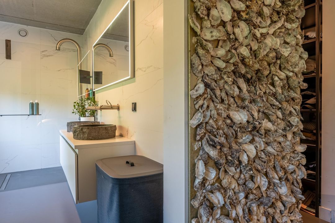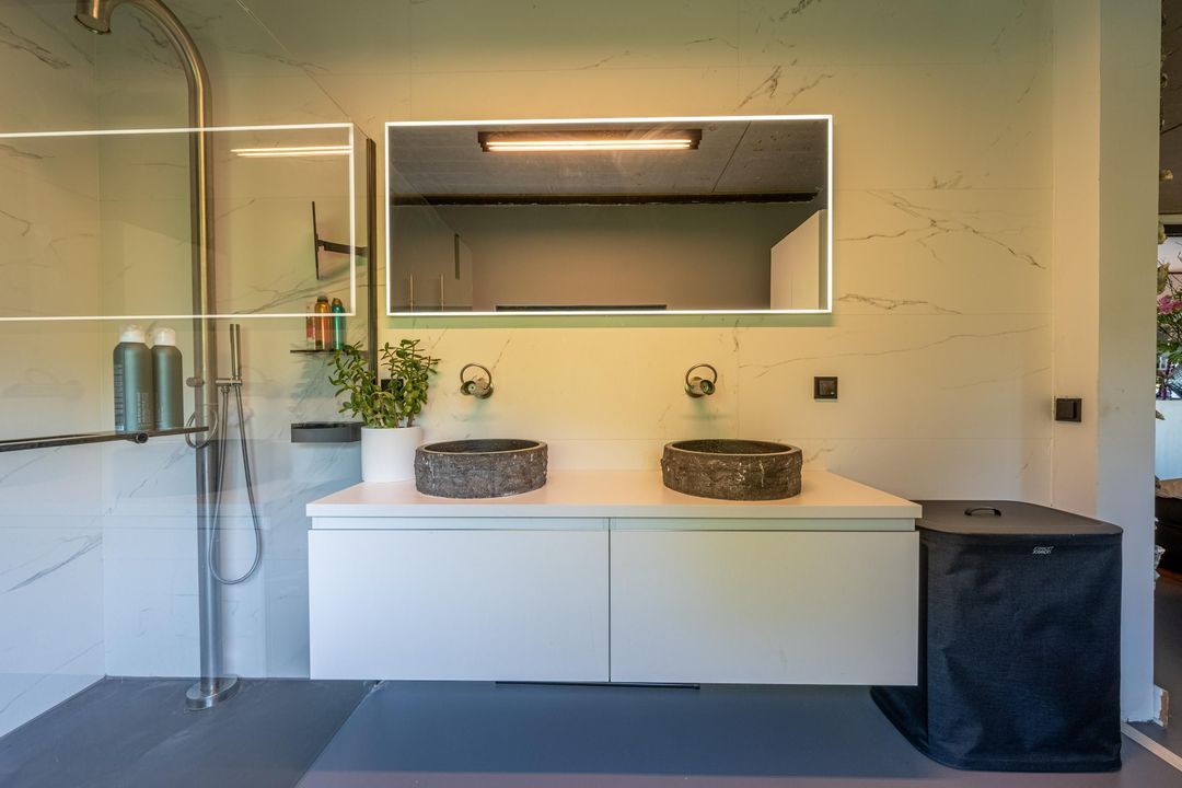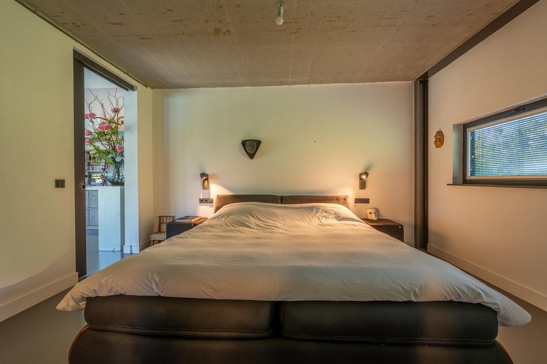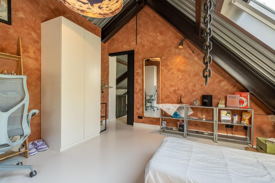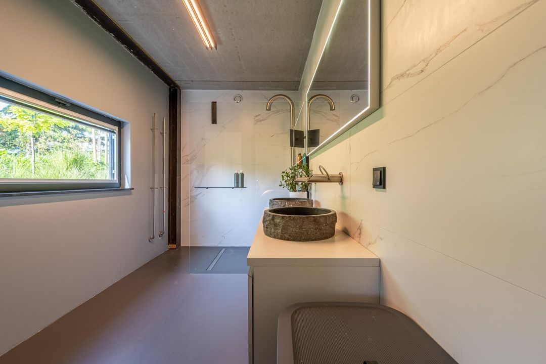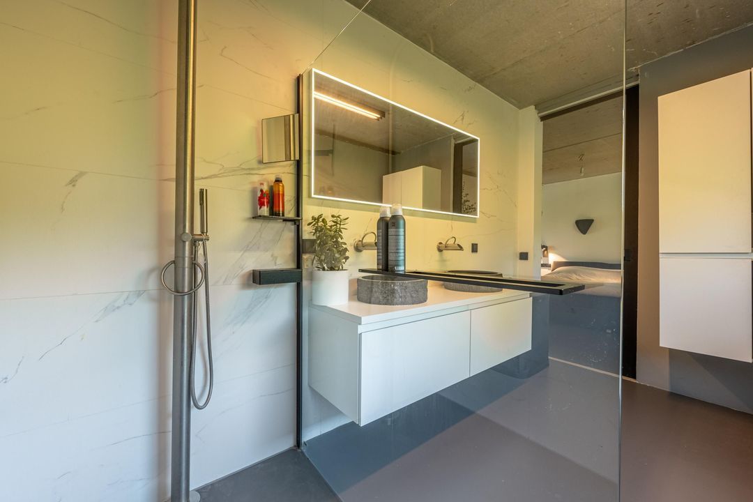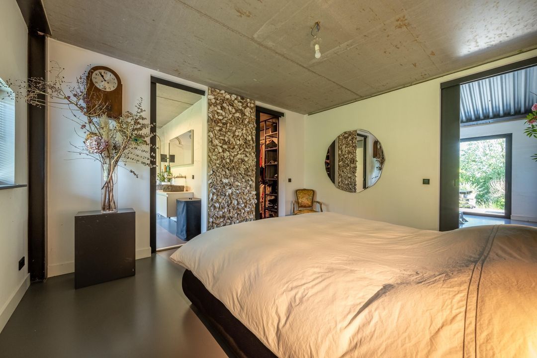 De master bedroom in het nieuwe deel grenst direct aan een eigen inloopkast met fraaie stalen kastenwand en een eigen luxe badkamer met gietvloer, marmeren wanden, een betonnen plafond, dubbele wastafel en riante inloopdouche. De combinatie voelt als een luxe hotelkamer.