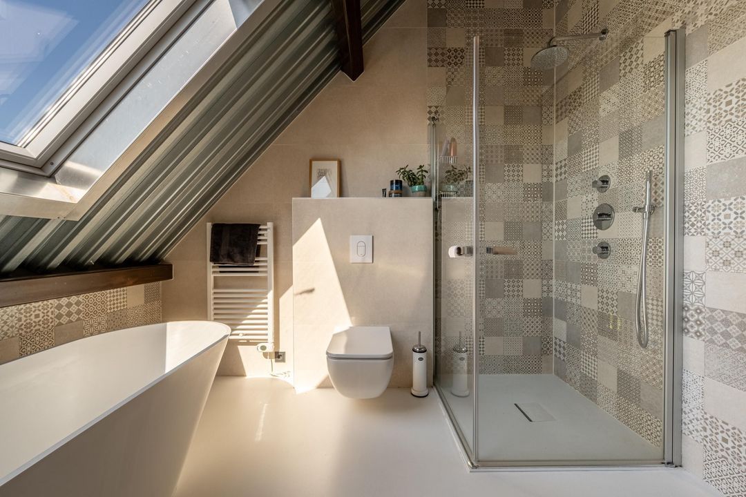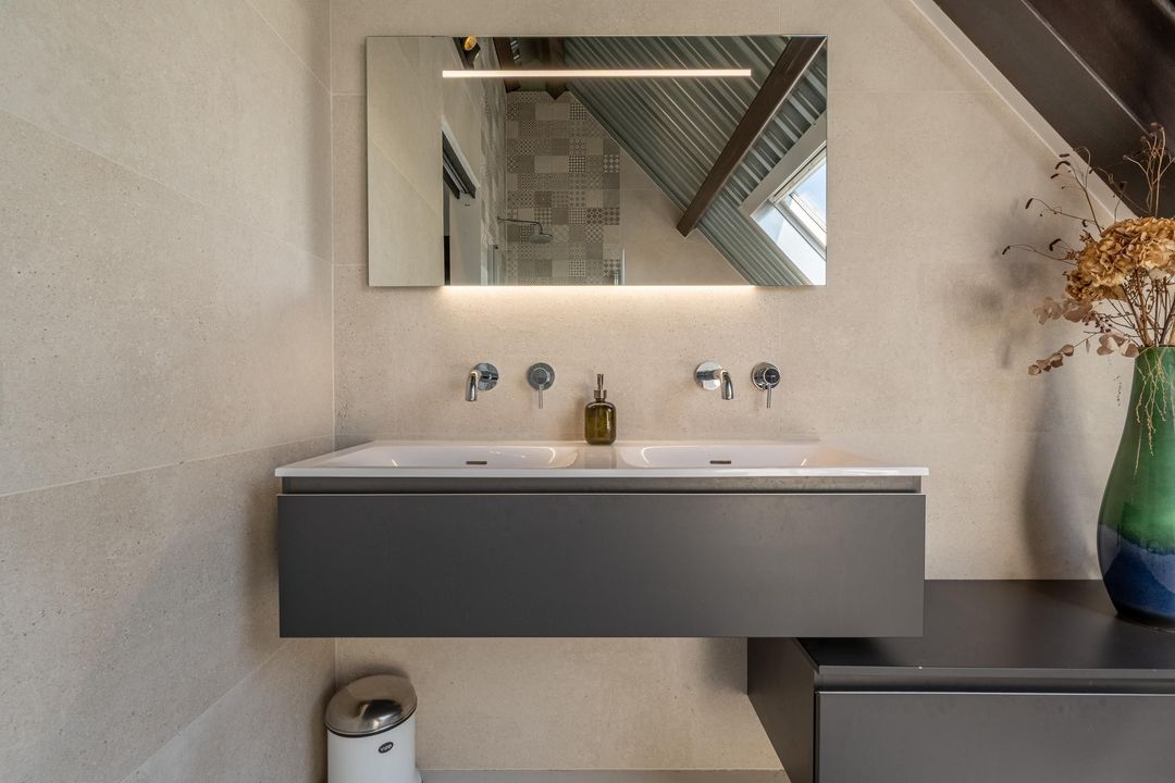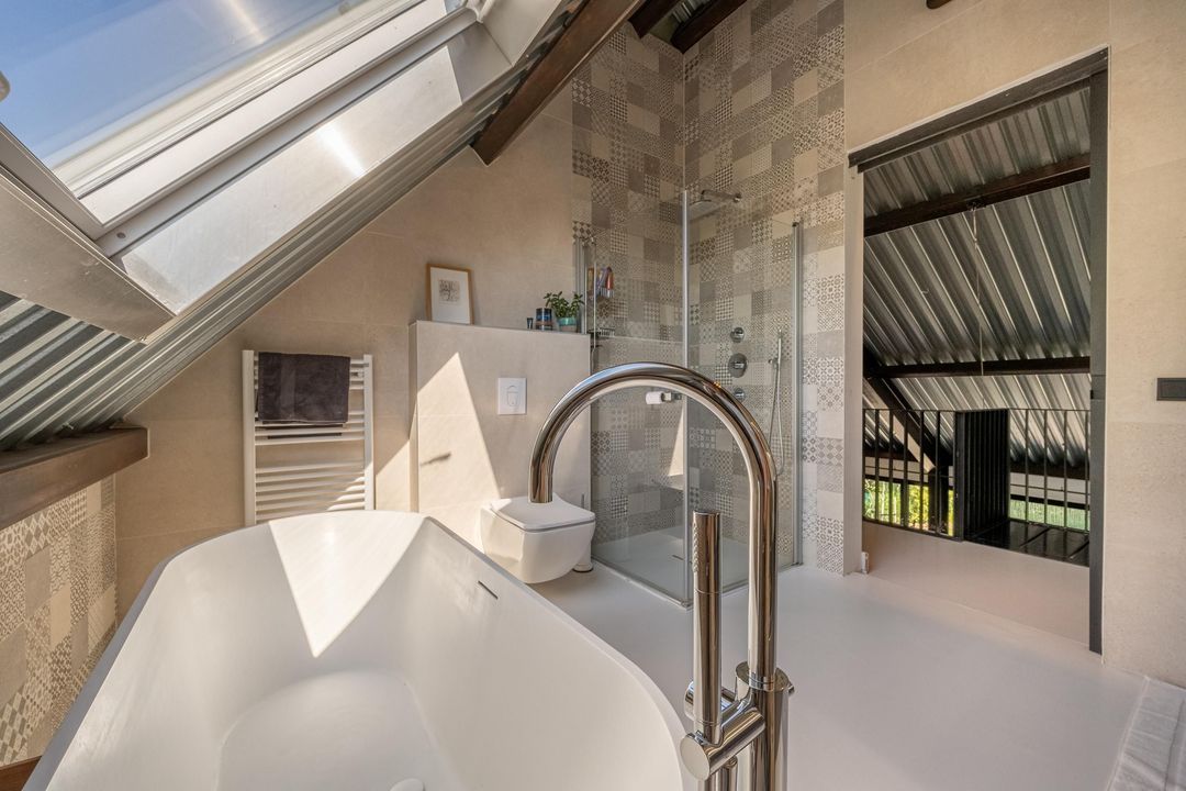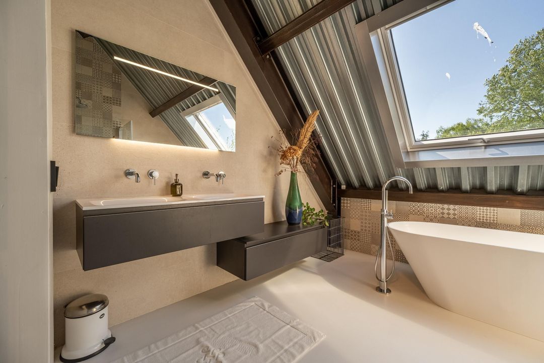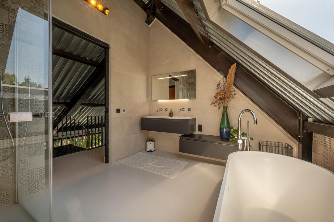 Op de verdieping in het nieuwe gedeelte vind je een zeer fraaie en zeer riante derde badkamer met vrijstaand ligbad, afzonderlijke douchecabine, toilet, elektrische vloerverwarming en sfeervol Ibiza-tegelwerk. Naast de badkamer is een grote slaapkamer aanwezig en aan de andere zijde van de badkamer is nog een open ruimte (vide) aanwezig die nu in gebruik is als gamehoek. Deze ruimte is eventueel eenvoudig als grote extra slaapkameer te benutten door er simpelweg een wand te plaatsen. Ook de riante entree met toilet, meterkast en technische ruimte (met cv en mechanische ventilatie) zijn strak uitgevoerd in dezelfde stijl als de rest van de woning.