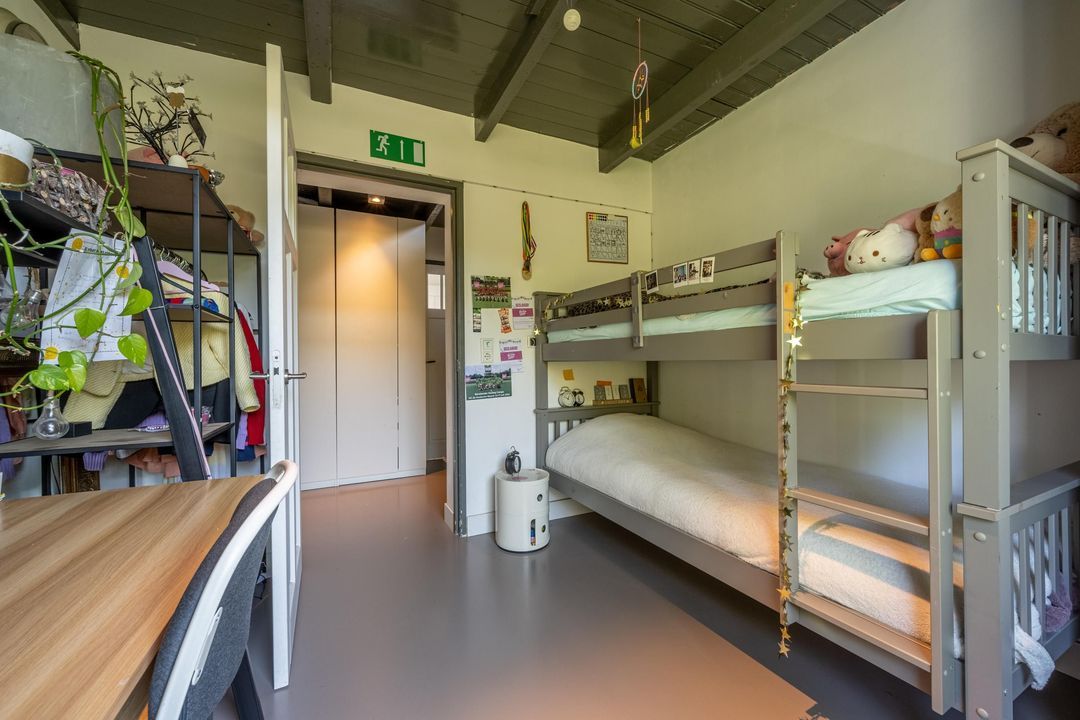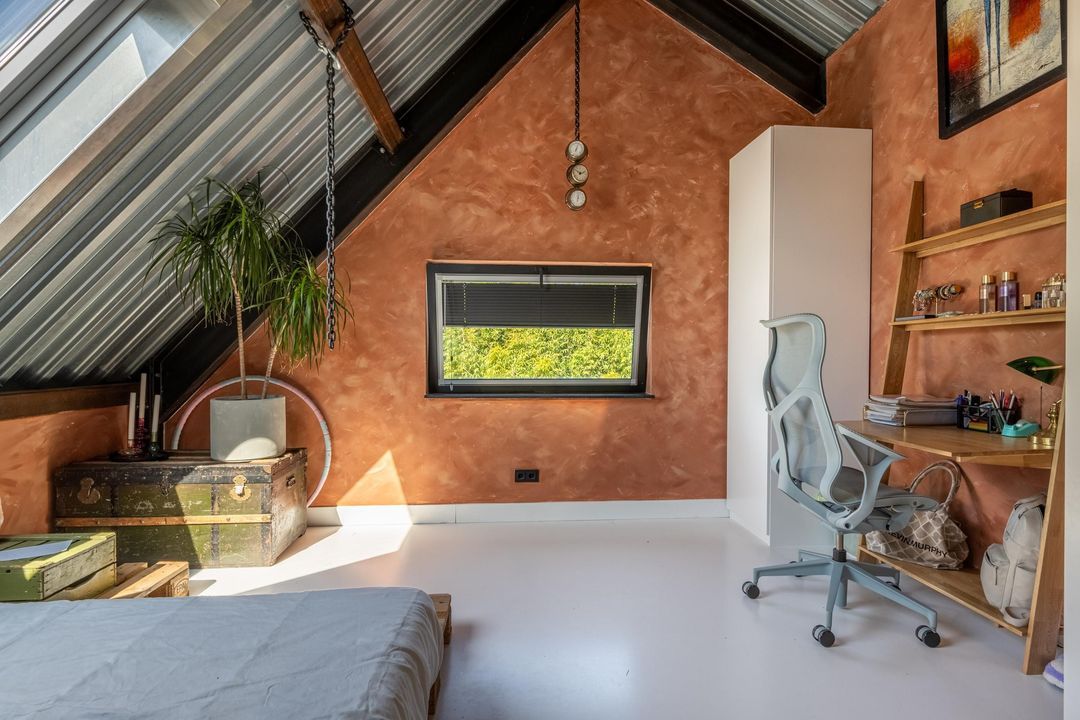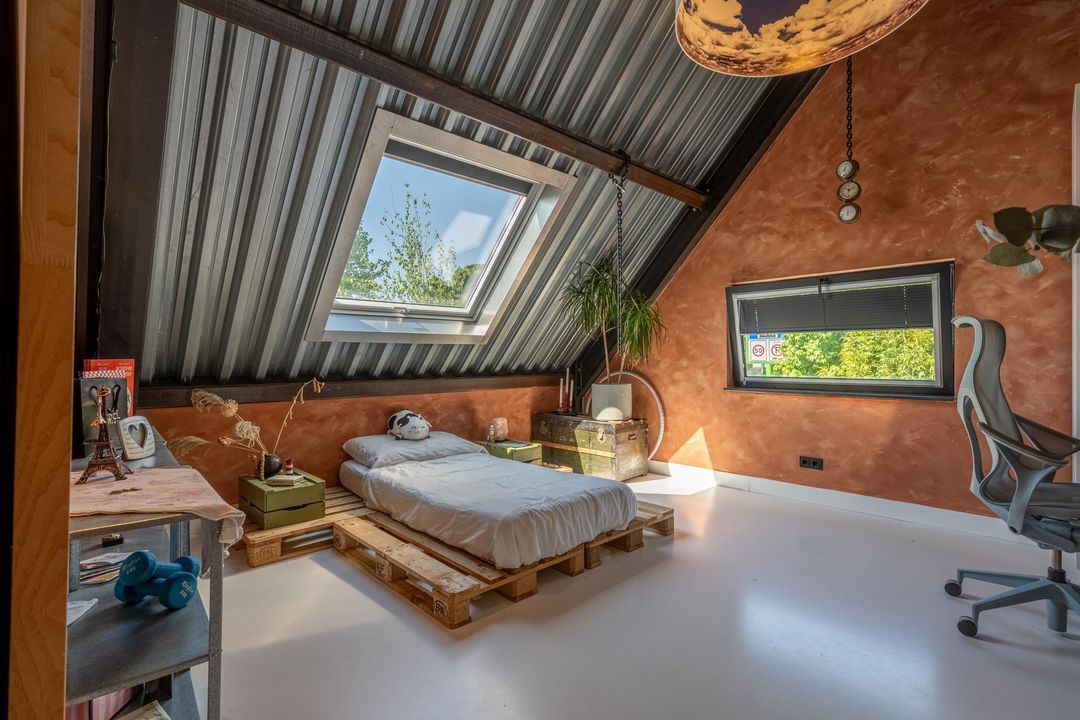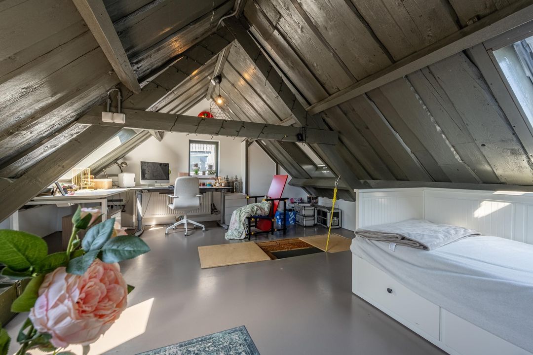 In het oorspronkelijke deel (het oude huis) vind je op de begane grond twee slaapkamers een kleine badkamer en veel bergruimte t.b.v. wasruimte en bijkeuken. De beide slaapkamers en badkamer zijn strak afgewerkt met gietvloer en tripple beglazing waarbij de oude balkenplafonds gelukkig bewaard zijn gebleven, aangevuld met nieuwe sfeervolle paneeldeuren. Een stijlvolle combinatie van oud en nieuw. De verdieping is door middel van een steile spiltrap te bereiken en biedt ruimte aan een mooie lichte zolderkamer met 4 dakramen en is eveneens voorzien van een strakke lichtgrijze vloer en de sfeervolle oude kapconstructie. Overigens is dit dak volledig nieuw geïsoleerd en voorzien van nieuwe pannen (en zonnepanelen).