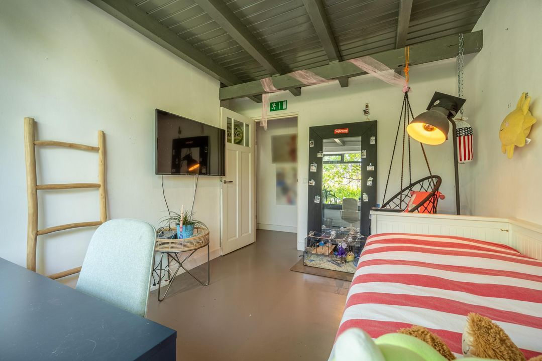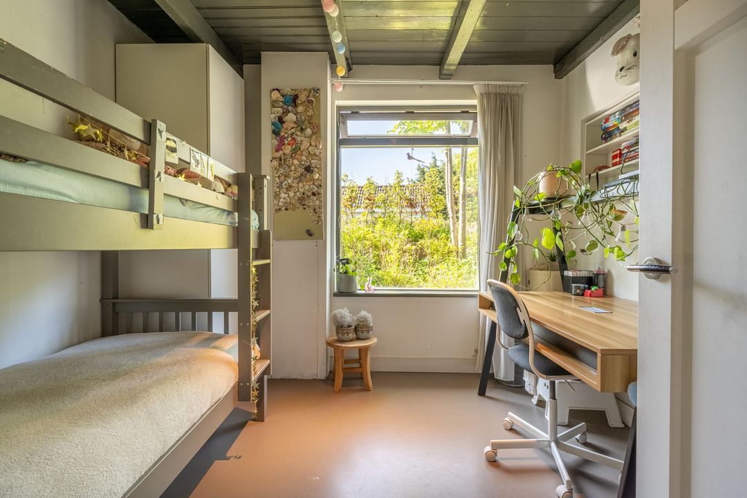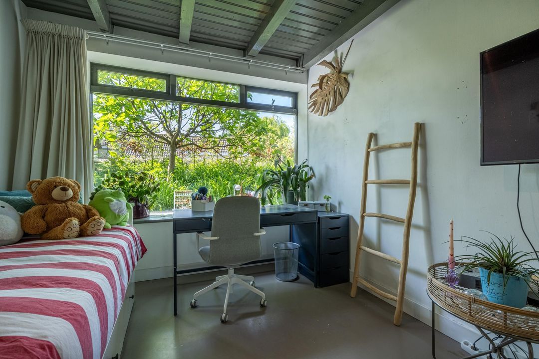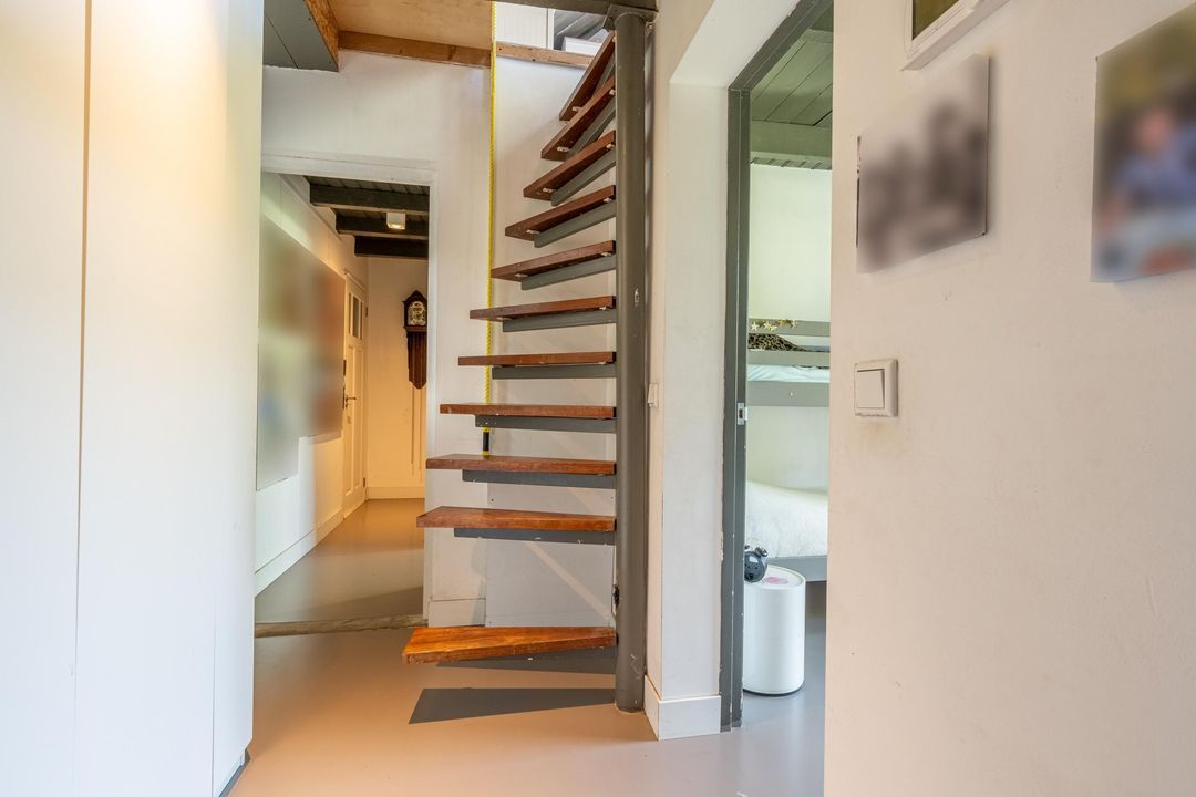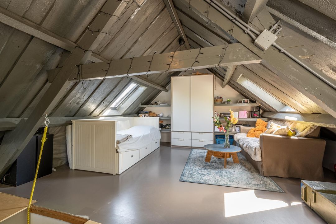 In het oorspronkelijke deel (het oude huis) vind je op de begane grond twee slaapkamers een kleine badkamer en veel bergruimte t.b.v. wasruimte en bijkeuken. De beide slaapkamers en badkamer zijn strak afgewerkt met gietvloer en tripple beglazing waarbij de oude balkenplafonds gelukkig bewaard zijn gebleven, aangevuld met nieuwe sfeervolle paneeldeuren. Een stijlvolle combinatie van oud en nieuw. De verdieping is door middel van een steile spiltrap te bereiken en biedt ruimte aan een mooie lichte zolderkamer met 4 dakramen en is eveneens voorzien van een strakke lichtgrijze vloer en de sfeervolle oude kapconstructie. Overigens is dit dak volledig nieuw geïsoleerd en voorzien van nieuwe pannen (en zonnepanelen).