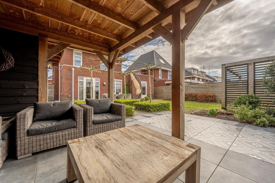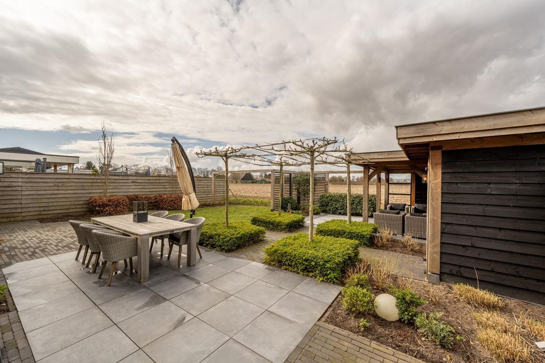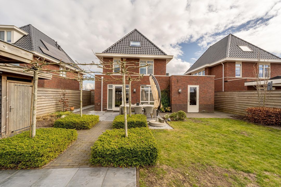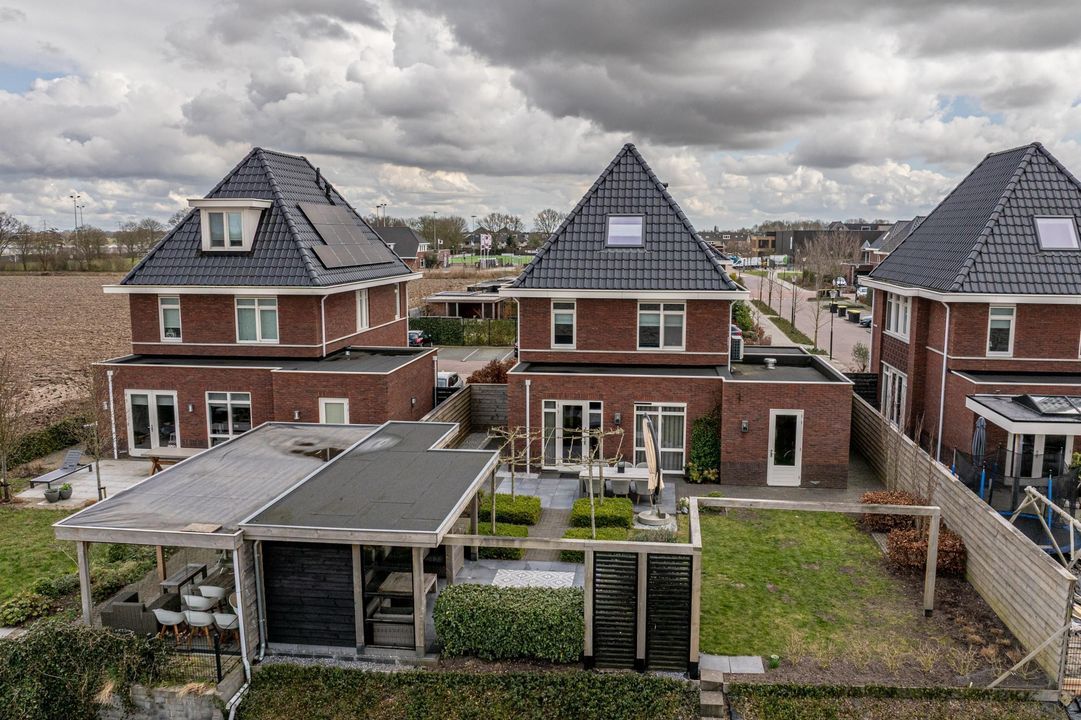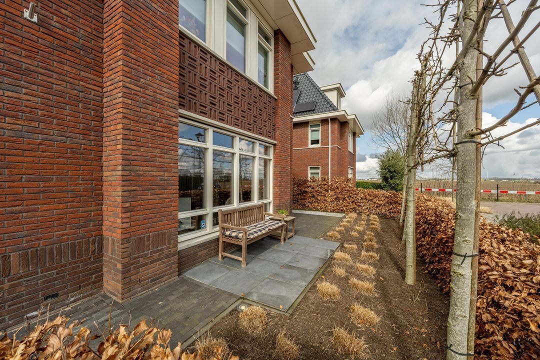 De tuin is fraai aangelegd en biedt meerdere terrassen, een grasveld, sfeervolle tuinverlichting en een fraaie overkapping met gereedschapshok. De ligging aan de rand van de wijk zorgt ervoor dat je hier in volledige rust kunt genieten van het verpletterende uitzicht over de Hoeksche Waardse polder.
