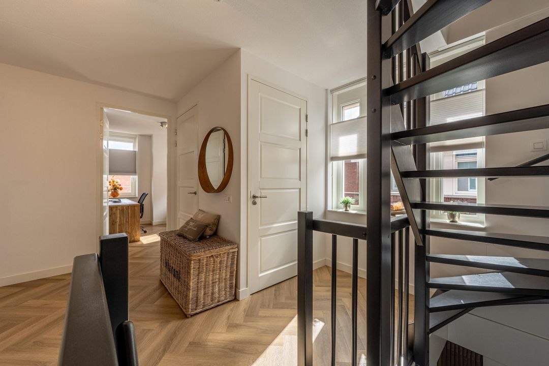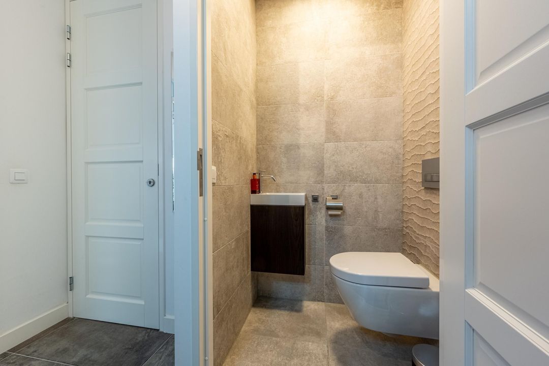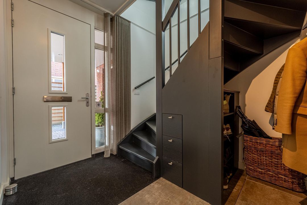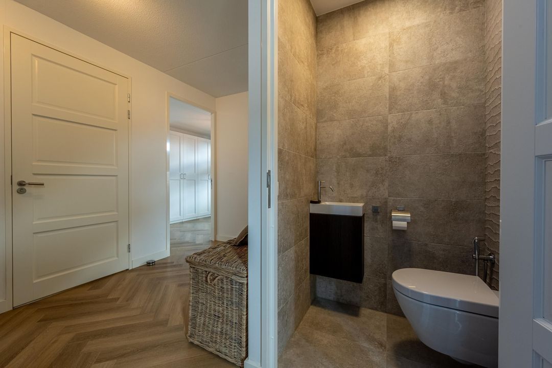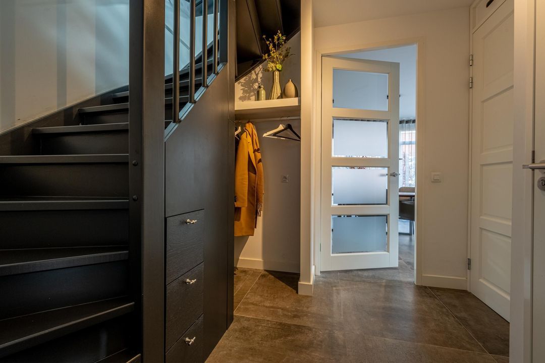 Bij binnenkomst in de royale hal vallen direct de fraaie stompe paneeldeuren met stijlvol beslag en de perfecte afwerking op. De hal biedt toegang tot het moderne toilet, de meterkast en een praktische garderobekast onder de trap.