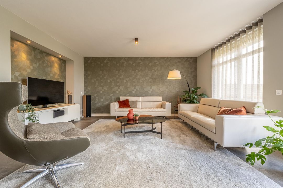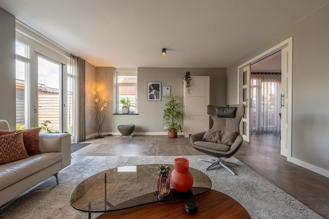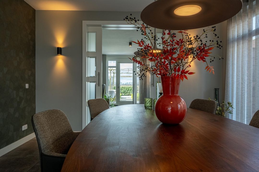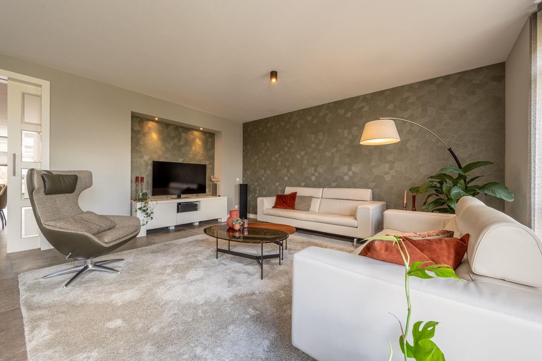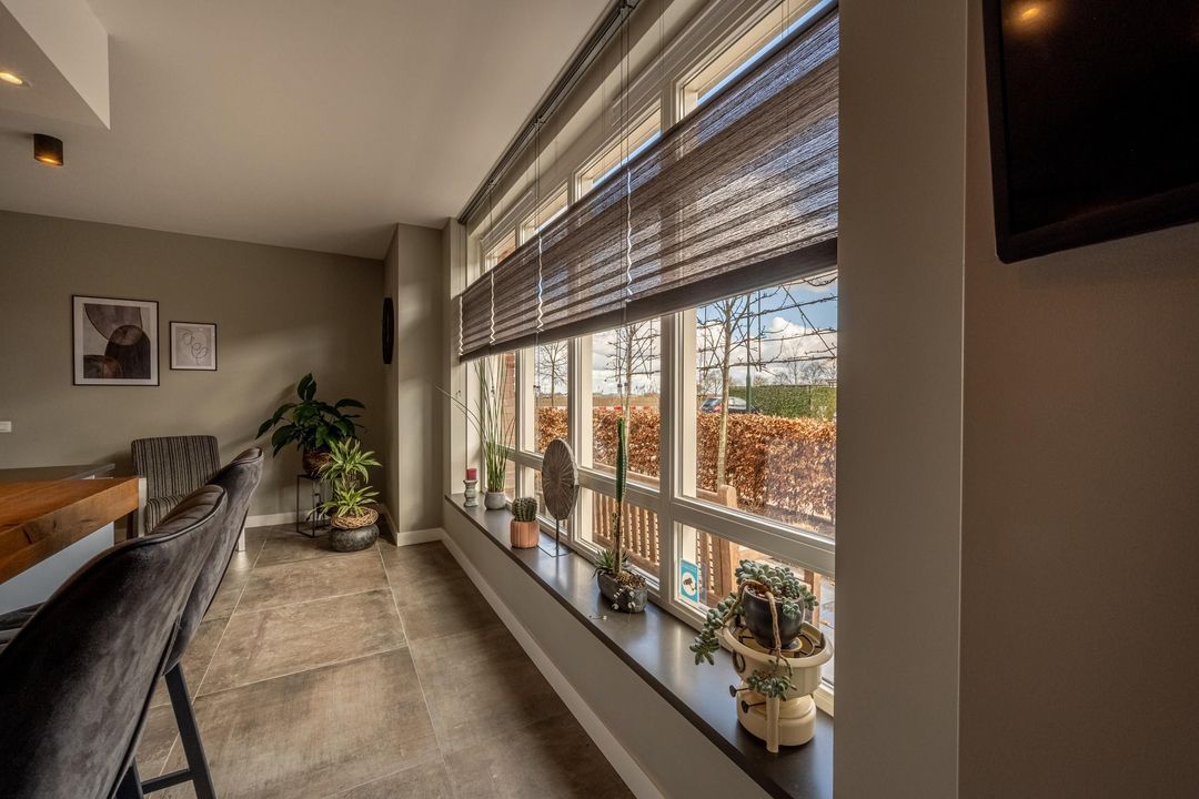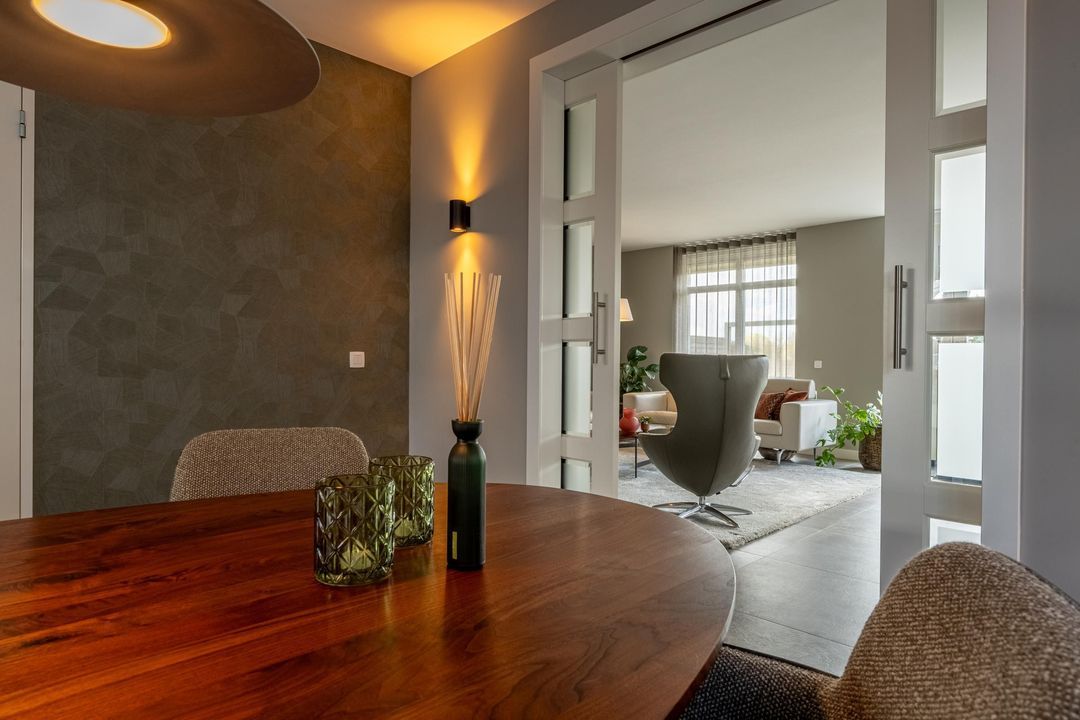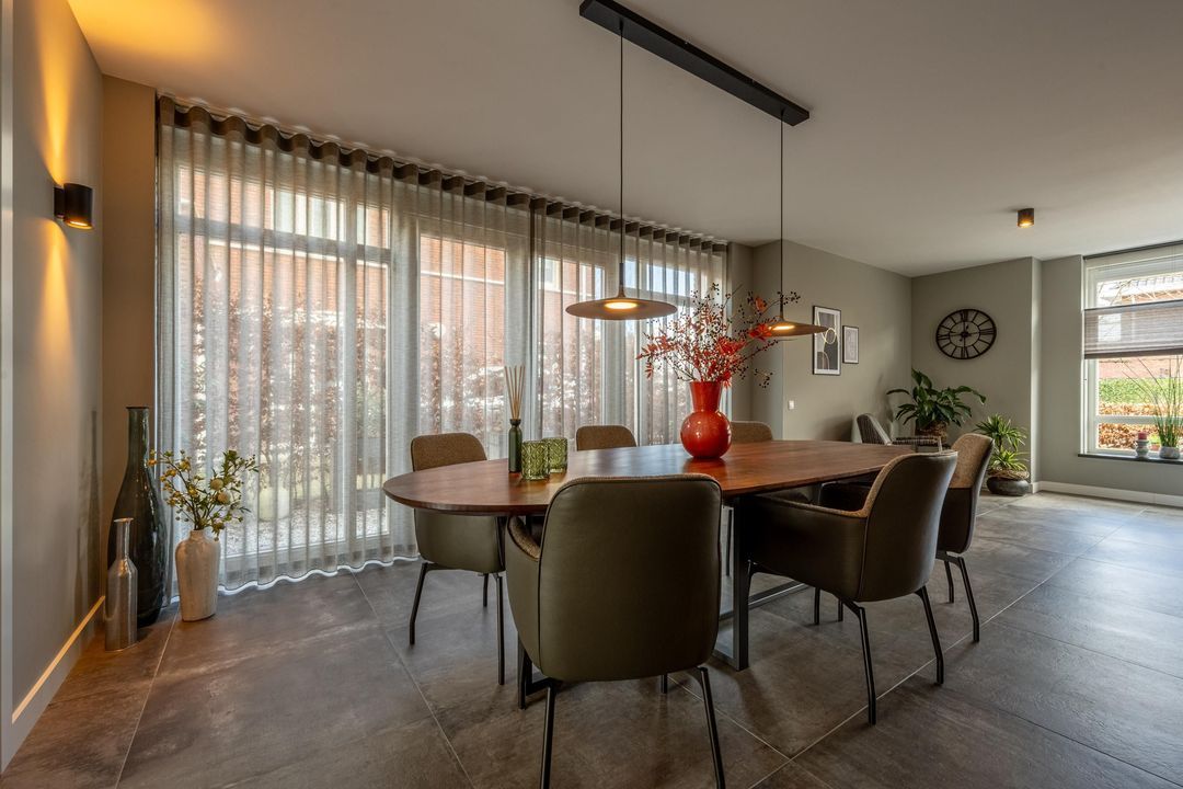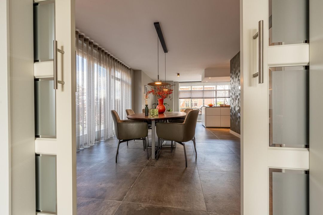 De woonkamer is heerlijk licht dankzij de grote raampartijen en is ingedeeld in een zitkamer aan de achterzijde en een eetkamer aan de voorzijde, stijlvol gescheiden door suitedeuren. Vanuit de woonkamer geniet je van een adembenemend uitzicht over het achtergelegen landschap. De vloer is afgewerkt met prachtige gemêleerde keramische vloertegels van 80 x 80 cm, voorzien van comfortabele vloerverwarming en koeling.