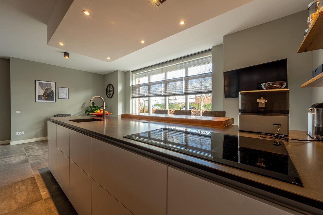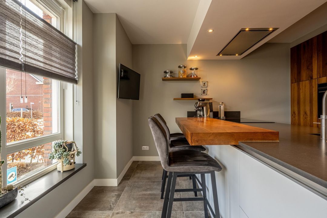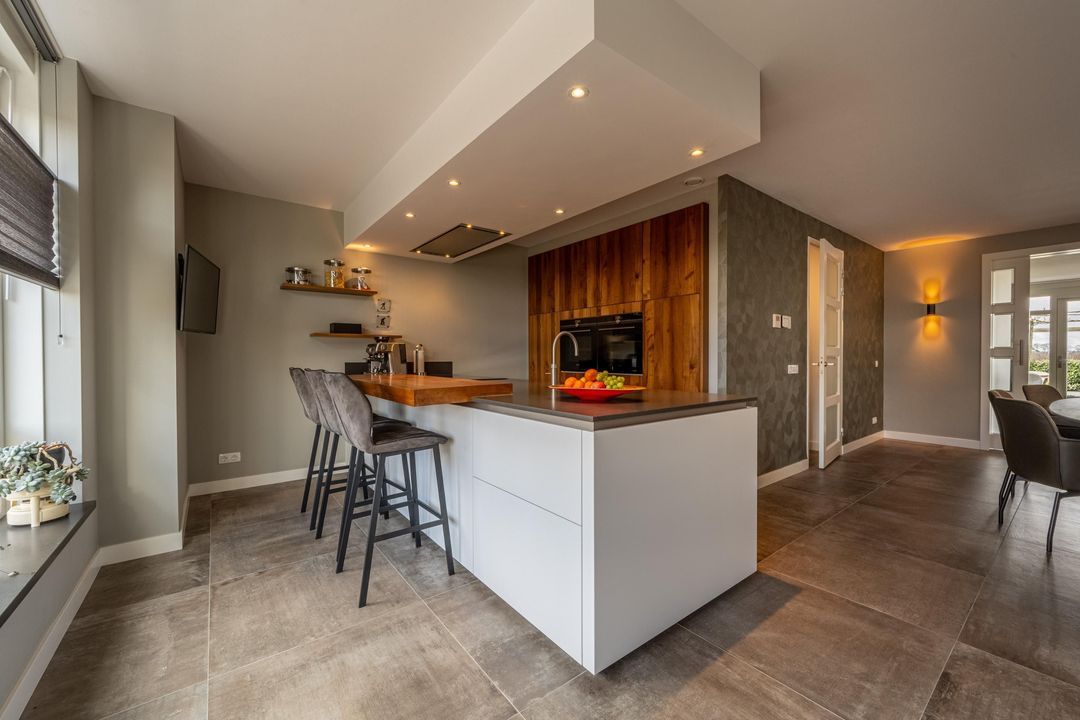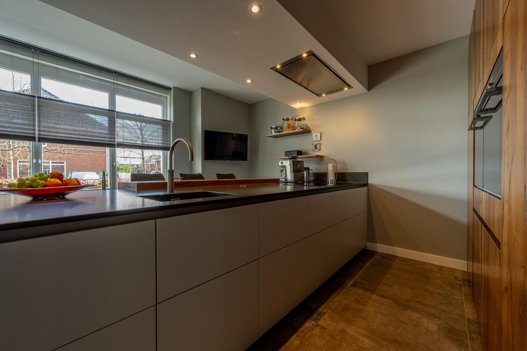 Aan de voorzijde van de woning bevindt zich de moderne Bruynzeel Optima (Next125) keuken. Het eiland biedt volop werkruimte en is uitgevoerd in gespoten mat witte uitvoering met een stijlvol grijs composiet werkblad en voorzien van een massief eikenhouten barelement. De fronten van de kastenwand zijn uitgevoerd met echt eikenfineer. De hoogwaardige inbouwapparatuur is van Miele en Siemens. De vensterbanken op de begane grond zijn uitgevoerd in hetzelfde composiet als het werkblad, wat zorgt voor een harmonieuze uitstraling.