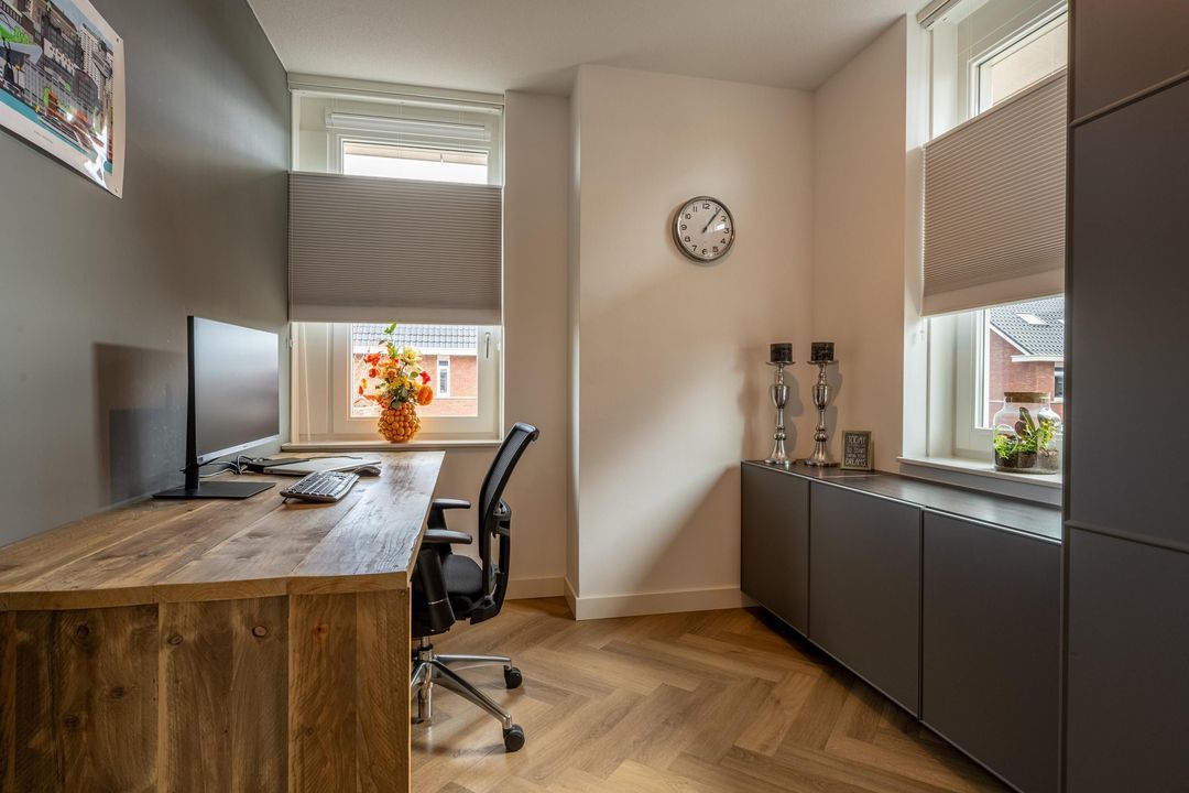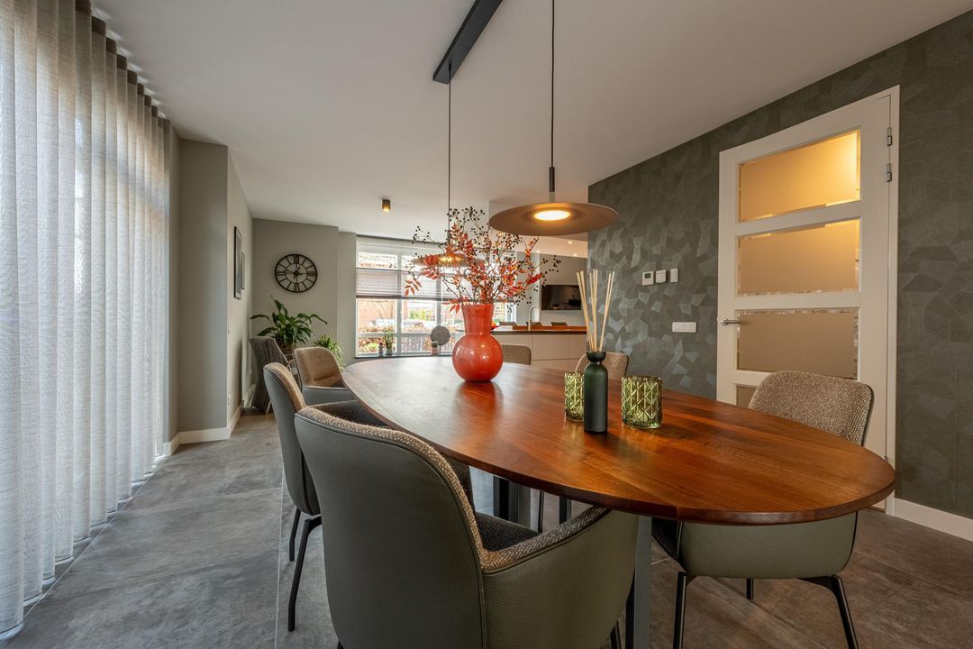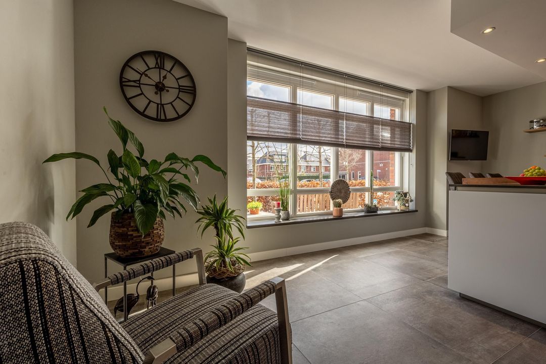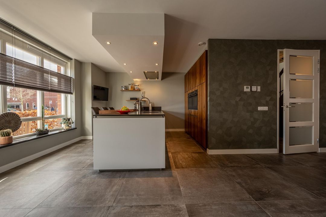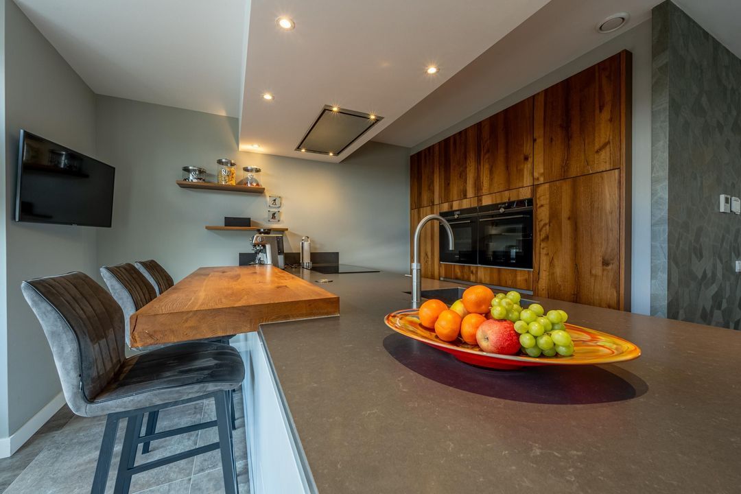 Aan de voorzijde van de woning bevindt zich de moderne Bruynzeel Optima (Next125) keuken. Het eiland biedt volop werkruimte en is uitgevoerd in gespoten mat witte uitvoering met een stijlvol grijs composiet werkblad en voorzien van een massief eikenhouten barelement. De fronten van de kastenwand zijn uitgevoerd met echt eikenfineer. De hoogwaardige inbouwapparatuur is van Miele en Siemens. De vensterbanken op de begane grond zijn uitgevoerd in hetzelfde composiet als het werkblad, wat zorgt voor een harmonieuze uitstraling.