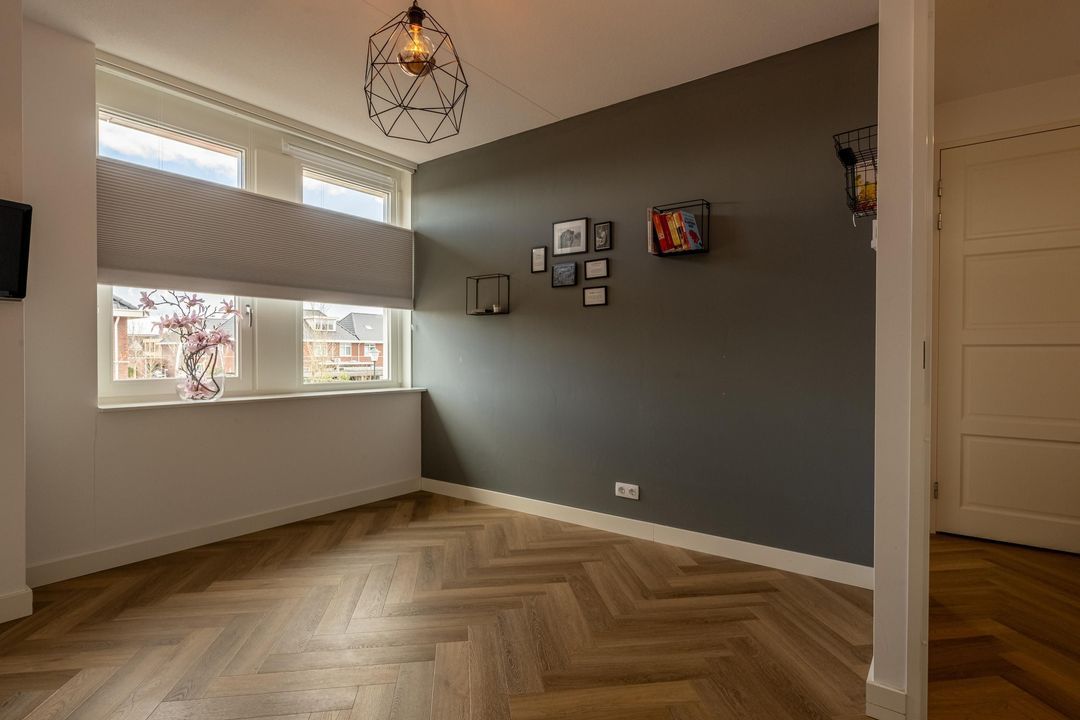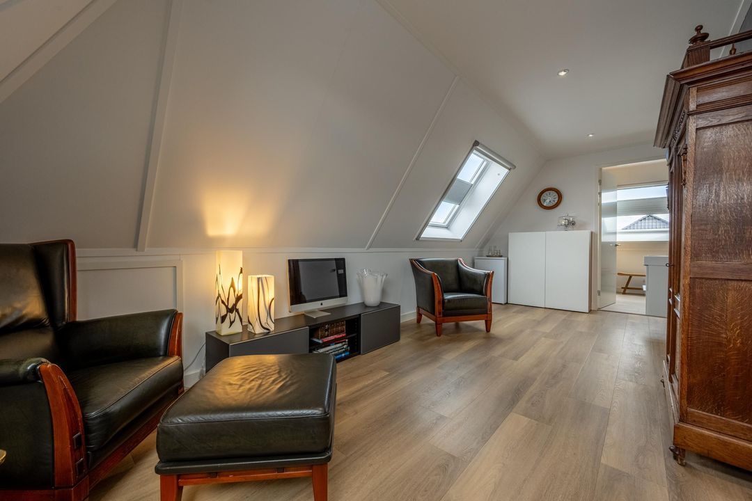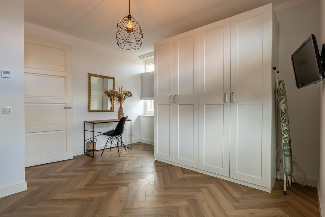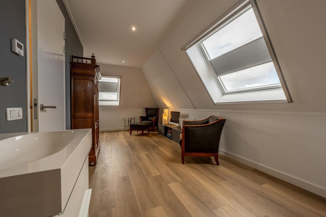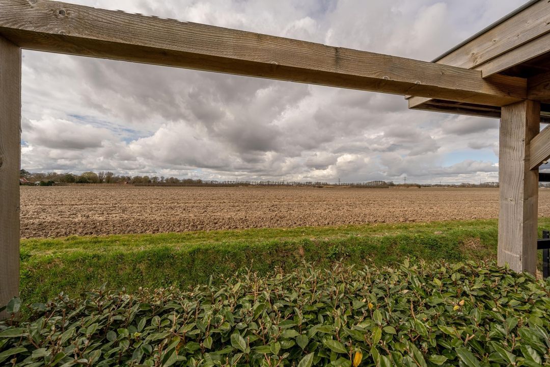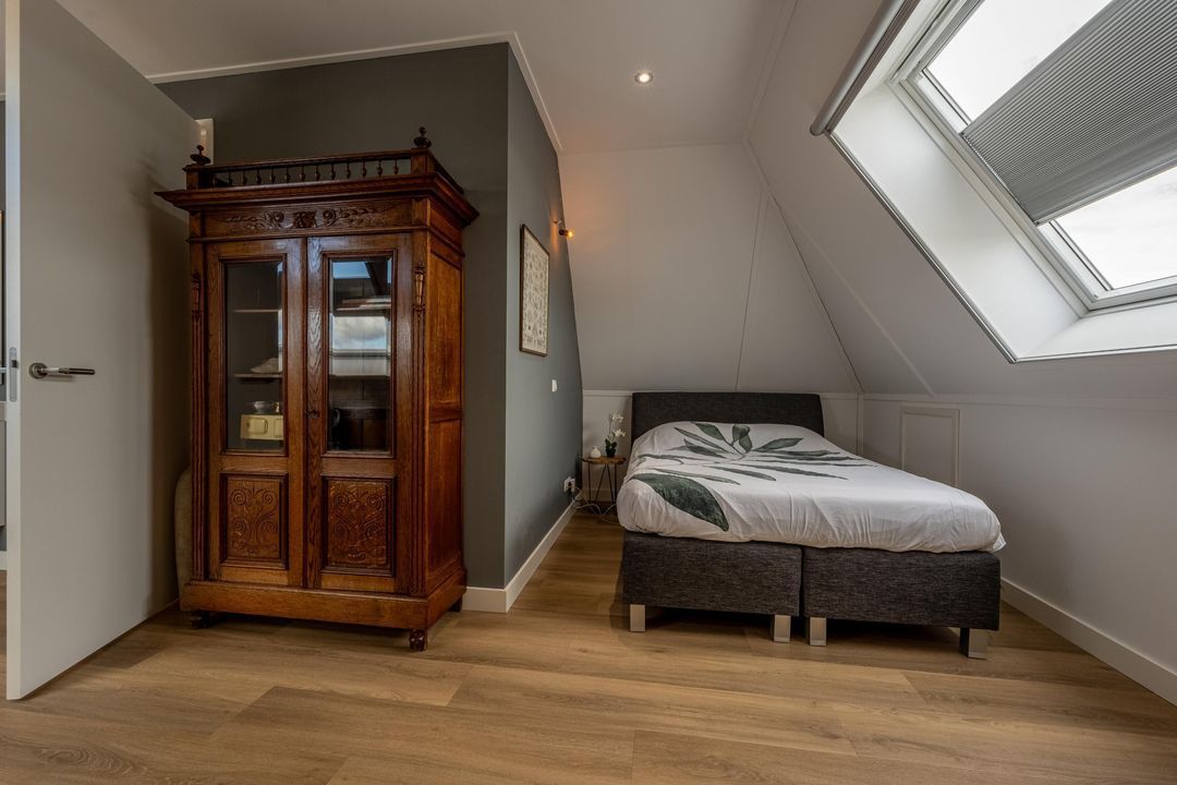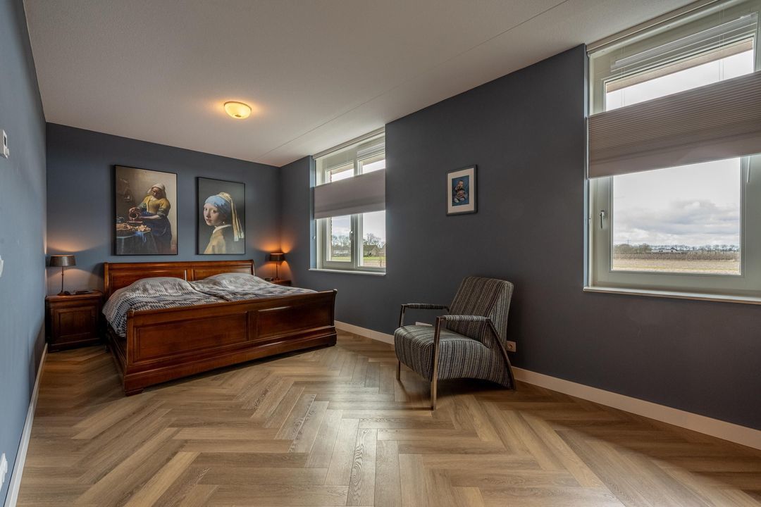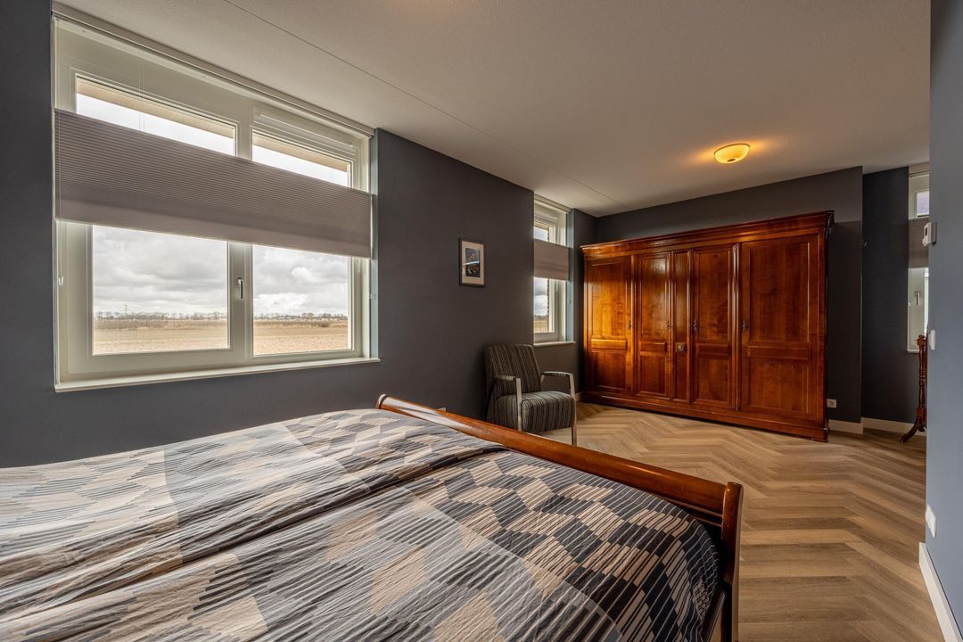 De grote slaapkamer bevindt zich aan de achterzijde, strekt zich uit over de volle breedte van de woning en biedt een prachtig weids uitzicht over het achtergelegen polderlandschap.