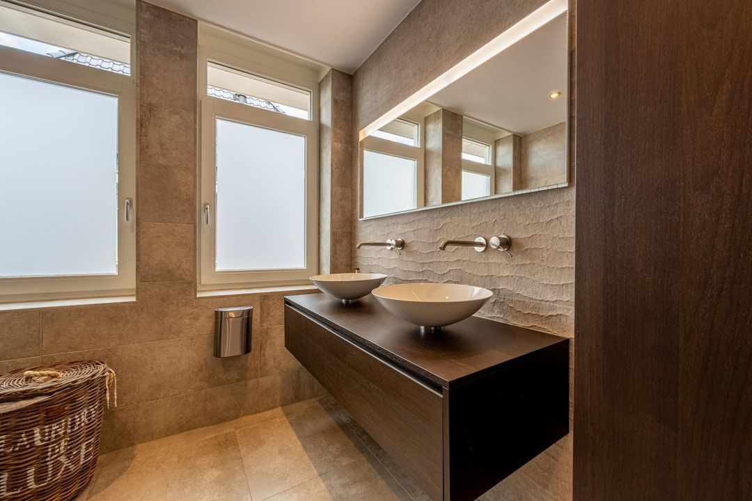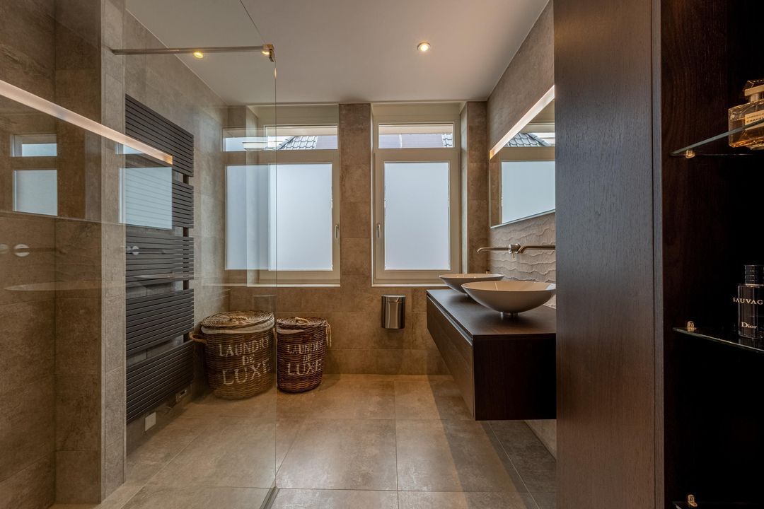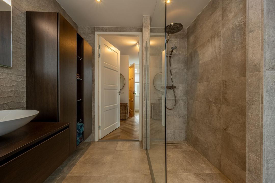 De stijlvolle badkamer is zeer fraai afgewerkt, voorzien van hoogwaardig tegelwerk, een dubbele wastafel, een royale inloopdouche, veel kastruimte, daglichttoetreding, een verwarmbare spiegel en een designradiator.