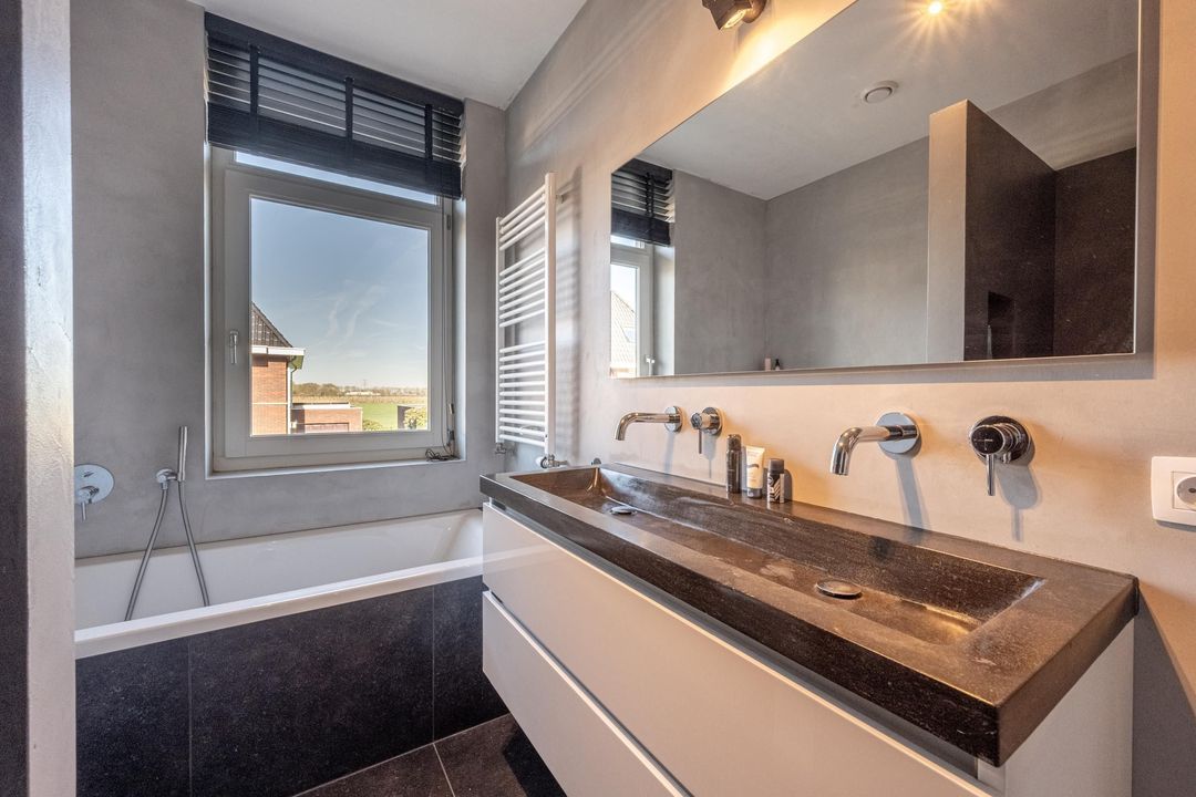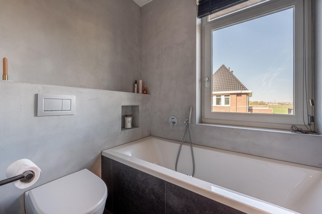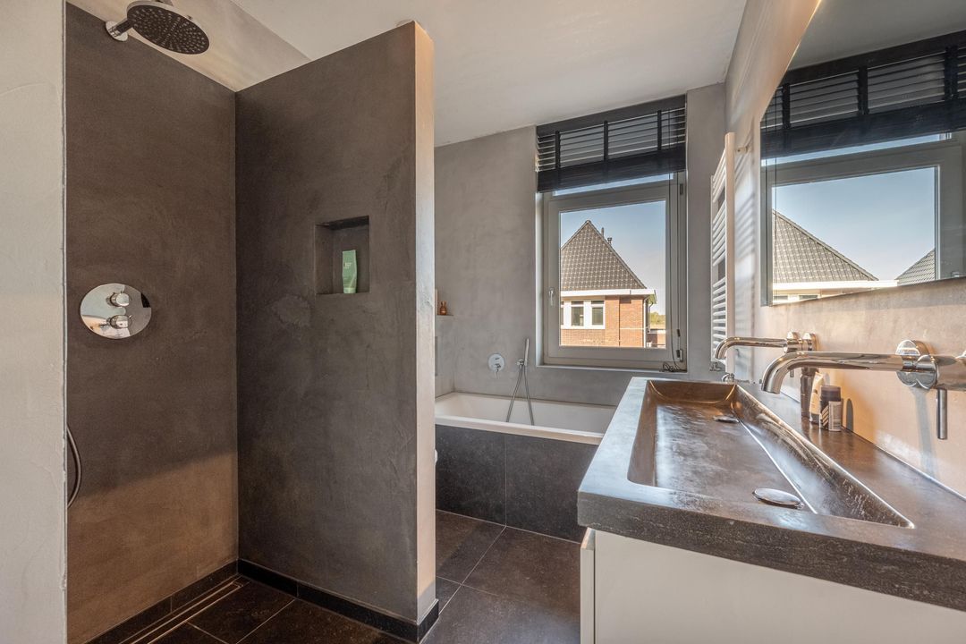 De badkamer is uitgevoerd in een moderne beton look en vormt een complete en comfortabele ruimte. De indeling bestaat onder andere uit een inloopdouche met regendouche, ligbad, dubbele wastafel met meubel en een hangend toilet. Dankzij het raam is er prettig daglicht en natuurlijke ventilatie aanwezig. De badkamer is voorzien van vloerverwarming voor extra comfort.