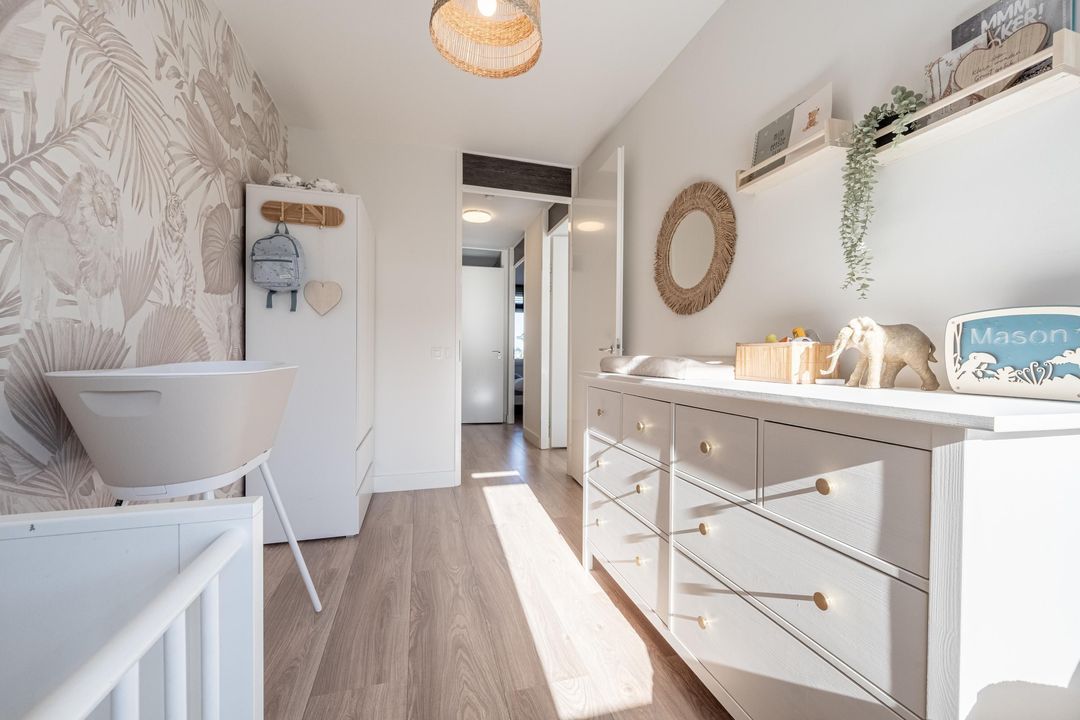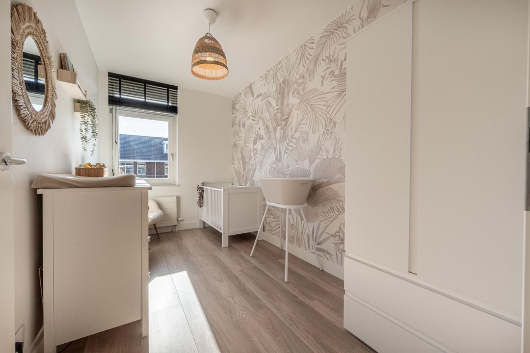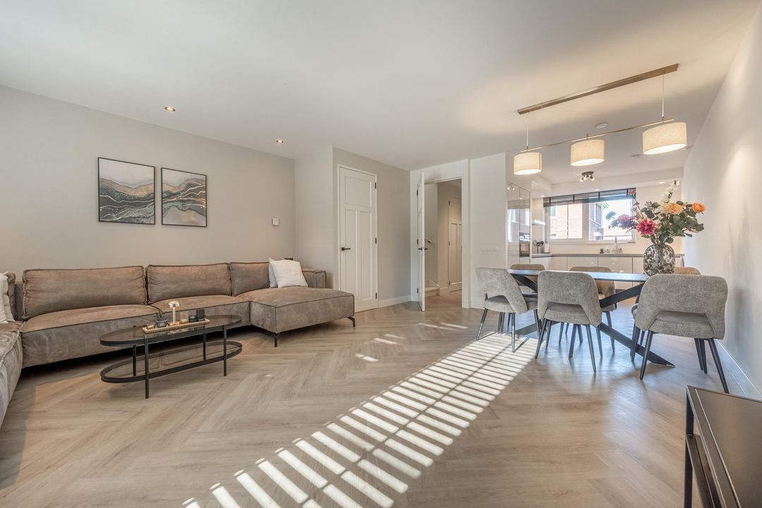 De woonkamer heeft een prettige indeling met voldoende ruimte voor een gezellige zithoek en staat in open verbinding met de eettafel en keuken. De achterpui is grotendeels voorzien van glas, wat zorgt voor een fijne lichtinval. De begane grond is afgewerkt met een pvc-vloer in visgraatmotief (2023) en voorzien van vloerverwarming. In de trapkast is praktische bergruimte aanwezig voor huishoudelijke spullen. Op een mooie dag zet je de openslaande deuren open en wordt de tuin een verlengstuk van de woonkamer.