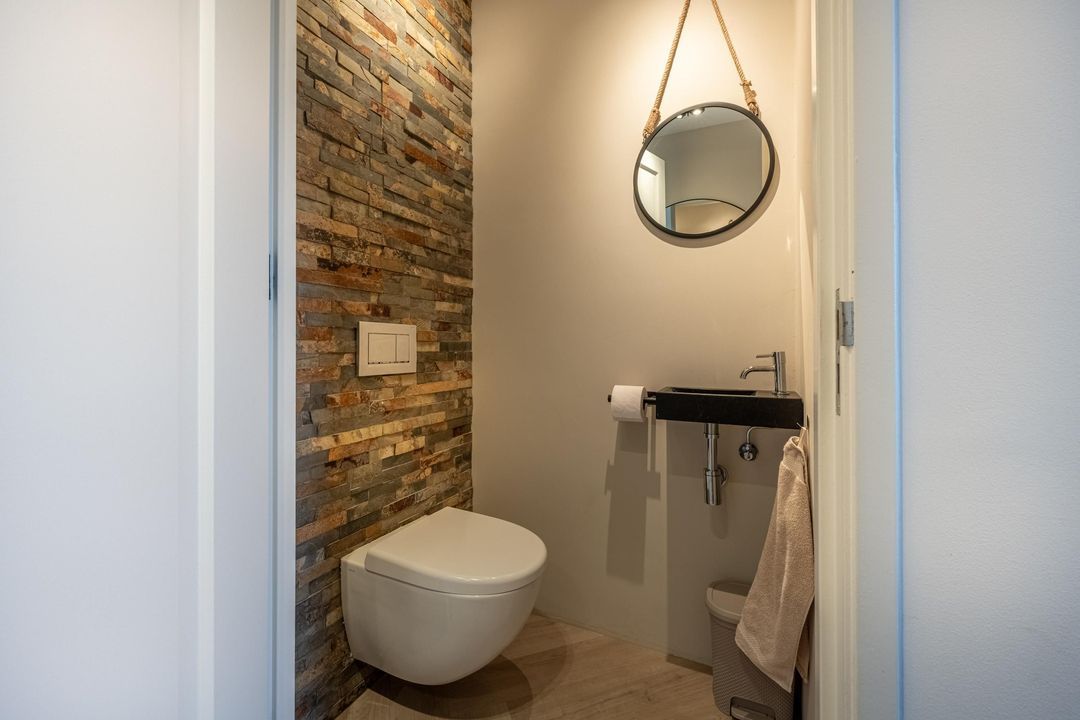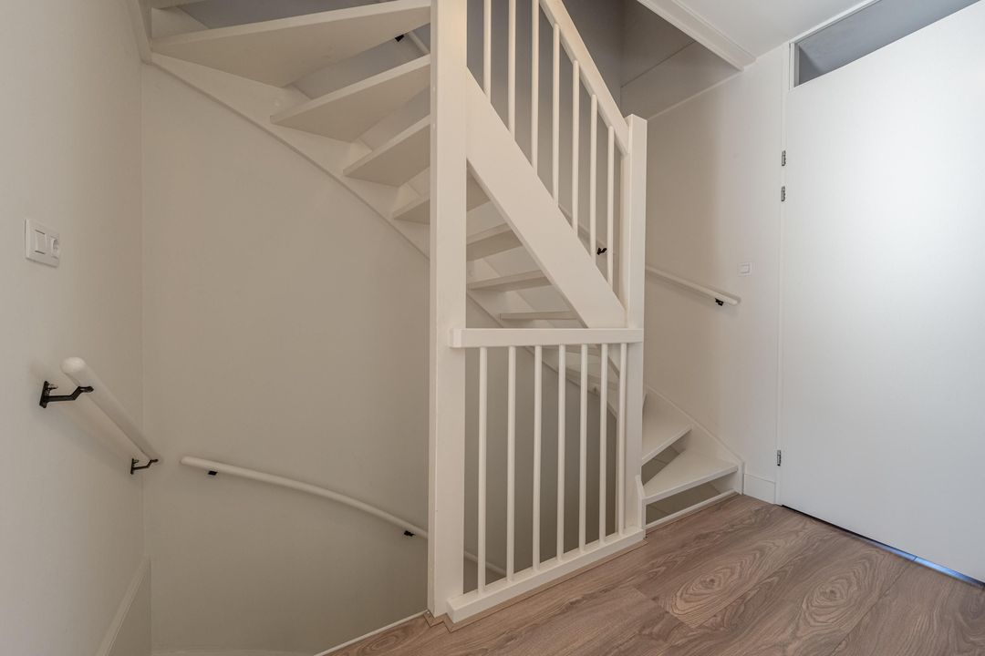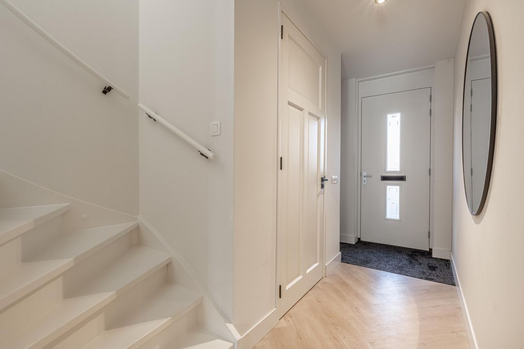 Entree met toegang tot de woonkamer, toiletruimte en trapopgang. In de hal is een vaste garderobenis aanwezig. De toiletruimte is ingericht met een hangend toilet en fontein.
