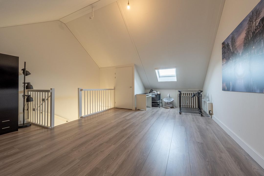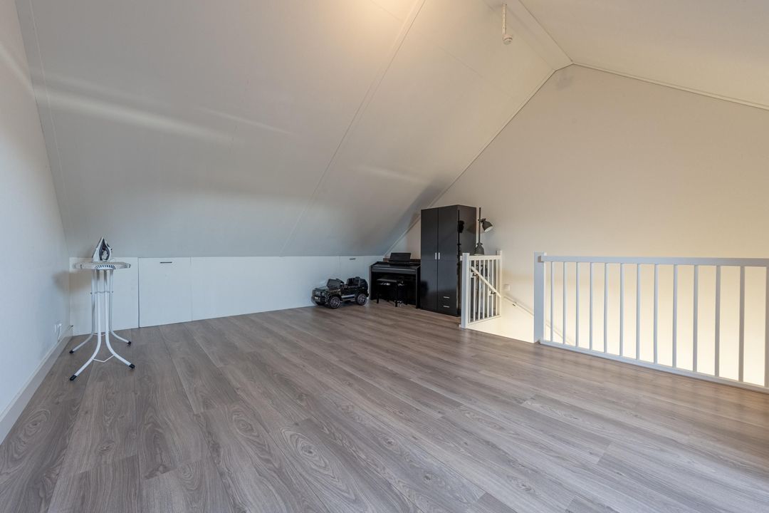 De zolderverdieping, bereikbaar via een vaste trap, biedt een uitzonderlijk ruime en netjes afgewerkte verdieping. De hoge nok zorgt voor een open en ruimtelijk gevoel. Een dakraam met hor zorgt voor daglicht en ventilatie. Achter de knieschotten is veel praktische bergruimte aanwezig.