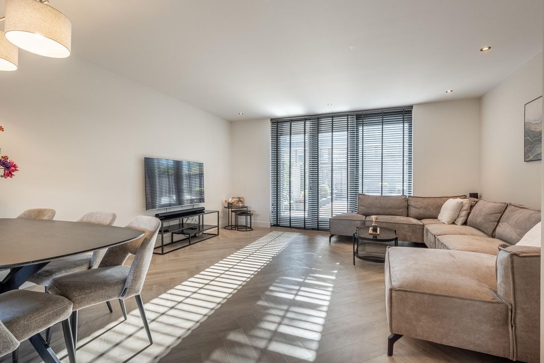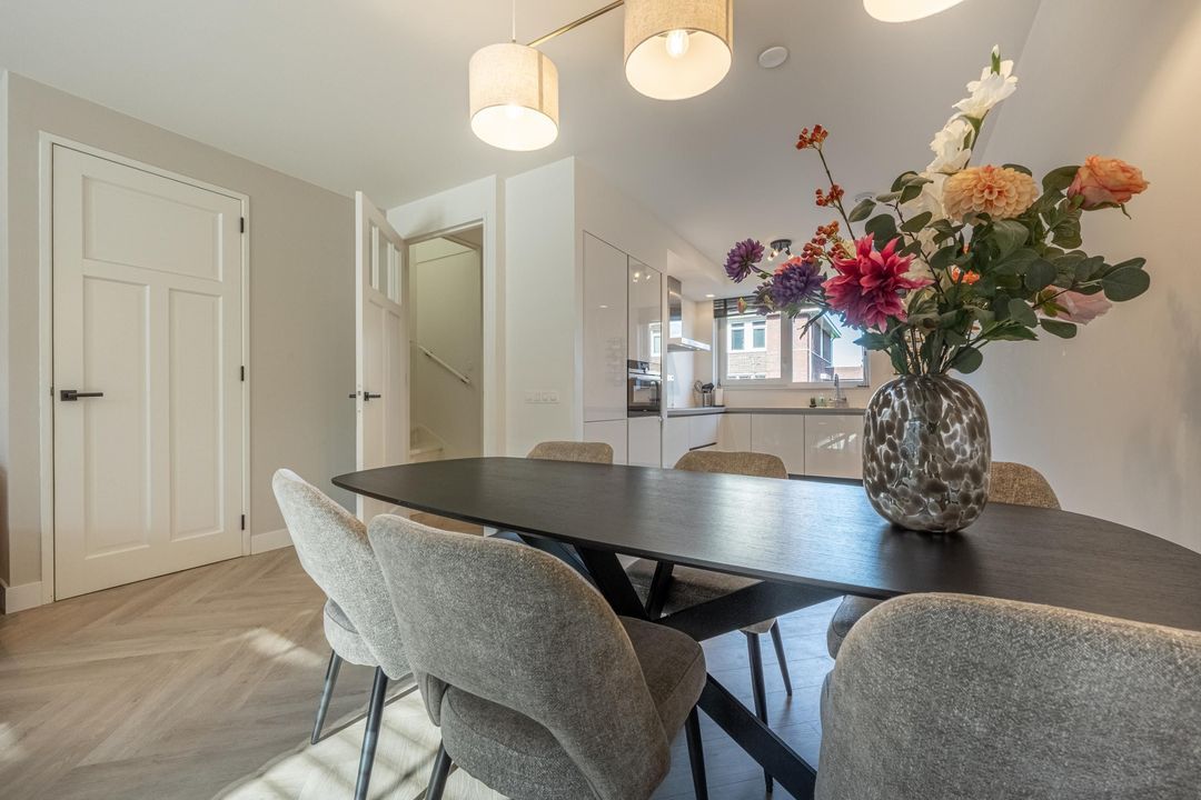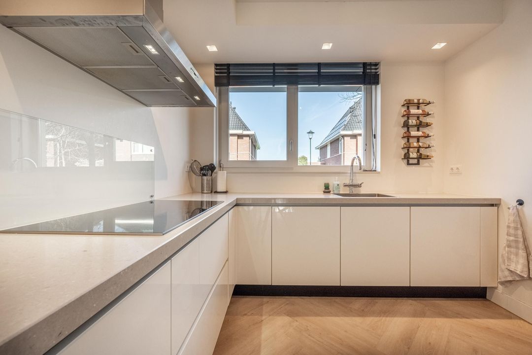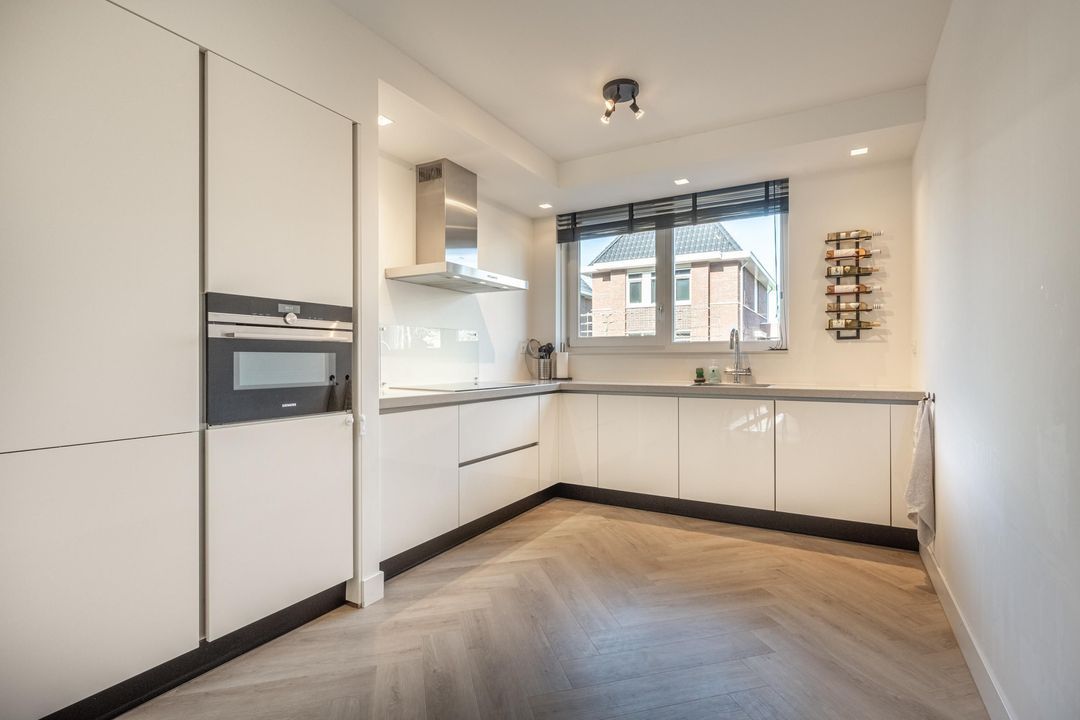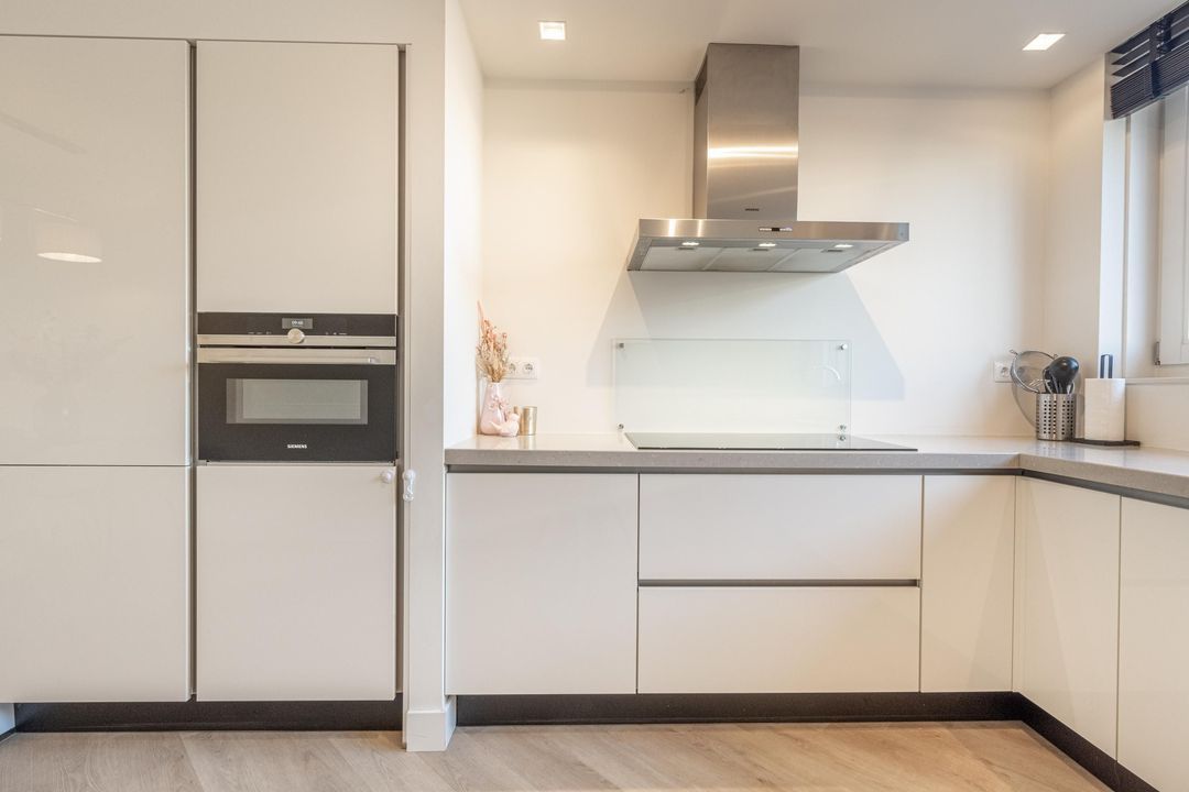 De moderne keuken is praktisch en stijlvol ingericht in een L-opstelling en voorzien van hoogwaardige inbouwapparatuur, waaronder een inductiekookplaat (5 zones), afzuigkap, combi-oven, vaatwasser, koel-/vriescombinatie en een kokendwaterkraan van Grohe. Het vernieuwde composiet werkblad (2023) geeft het geheel een luxe en duurzame uitstraling. Een groot raam aan de voorzijde zorgt voor prettig daglicht.
