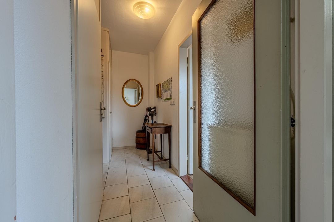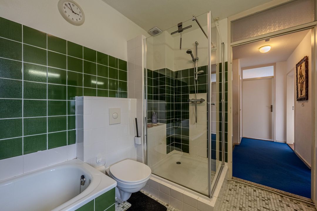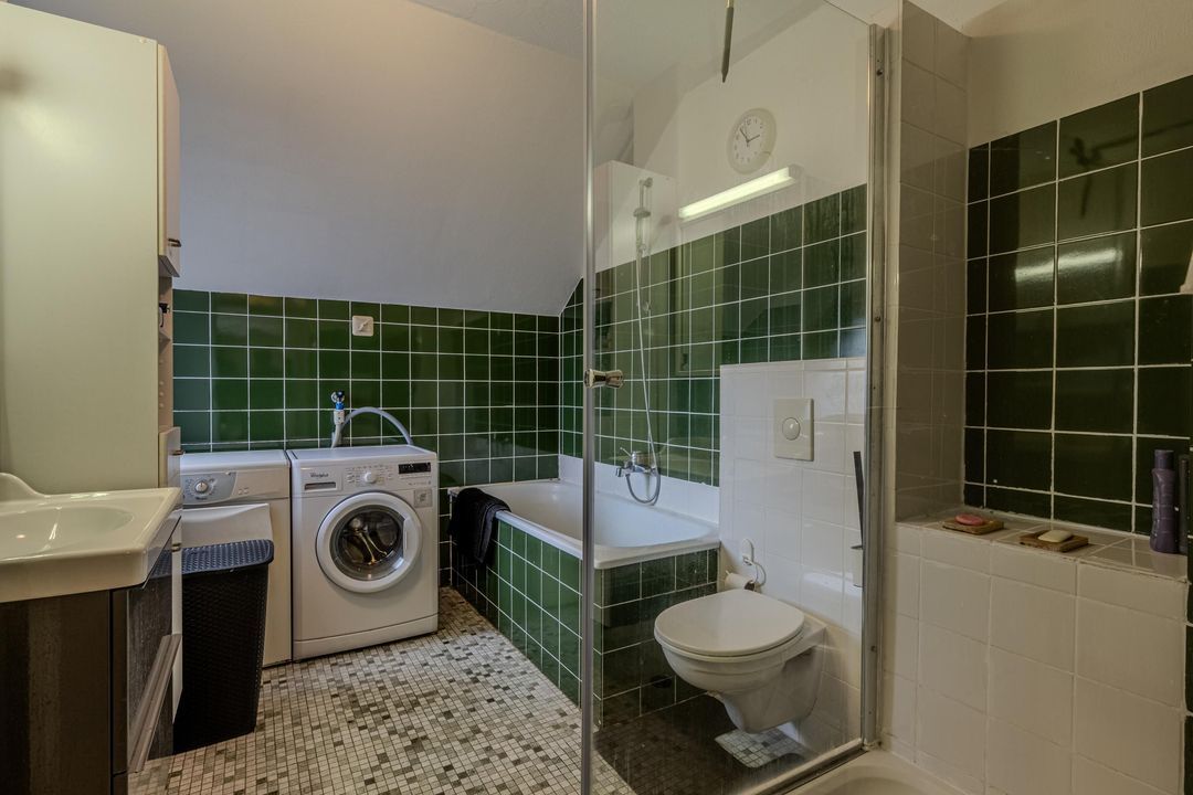 Via de trap bereik je de overloop, waar zich een vaste kast met een handig hang- en leggedeelte bevindt. Aan de voorzijde van de woning ligt de badkamer, volledig betegeld en uitgerust met een douchecabine, ligbad, wastafel, toilet en aansluitingen voor wasmachine en droger. Dankzij het raam en de mechanische ventilatie is de ruimte altijd prettig geventileerd.