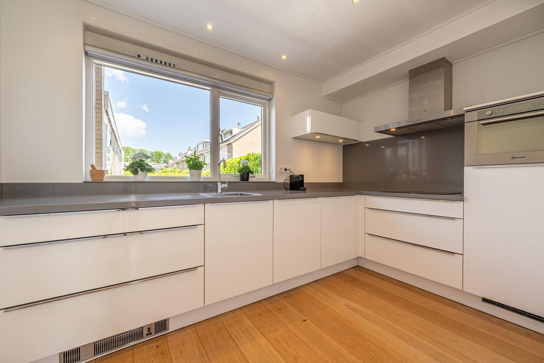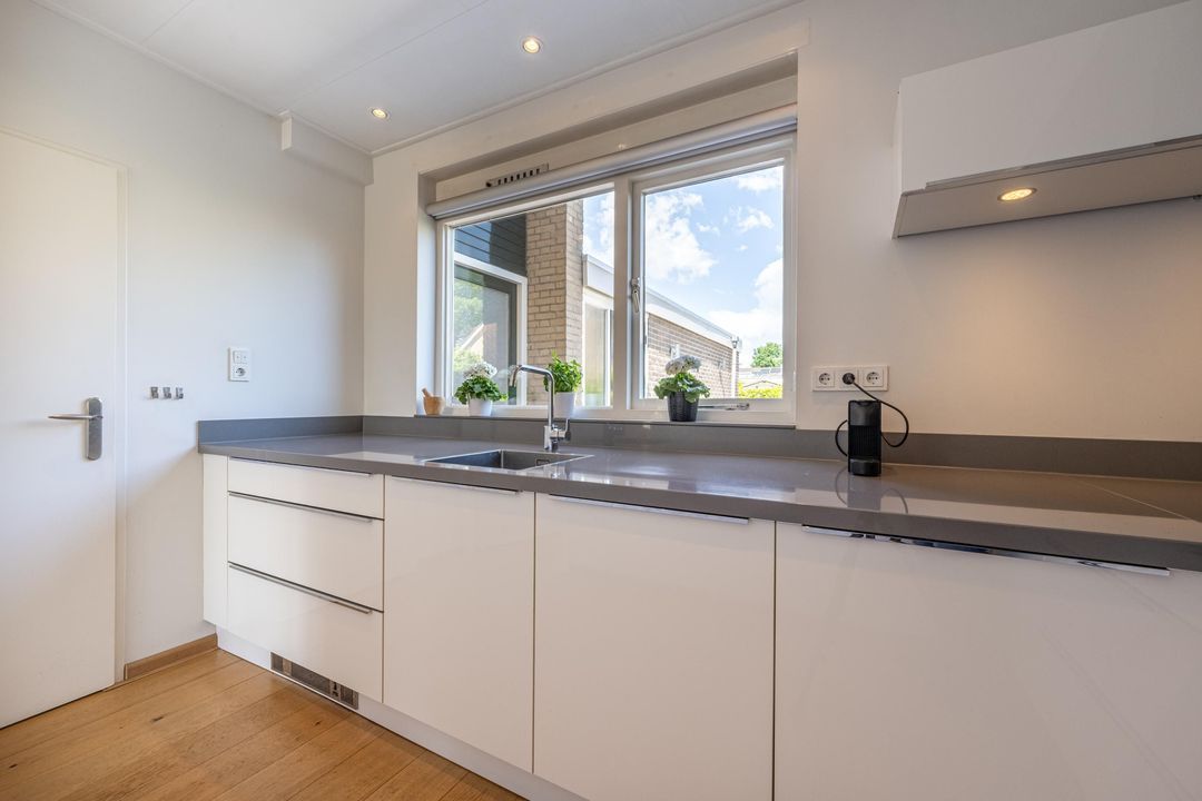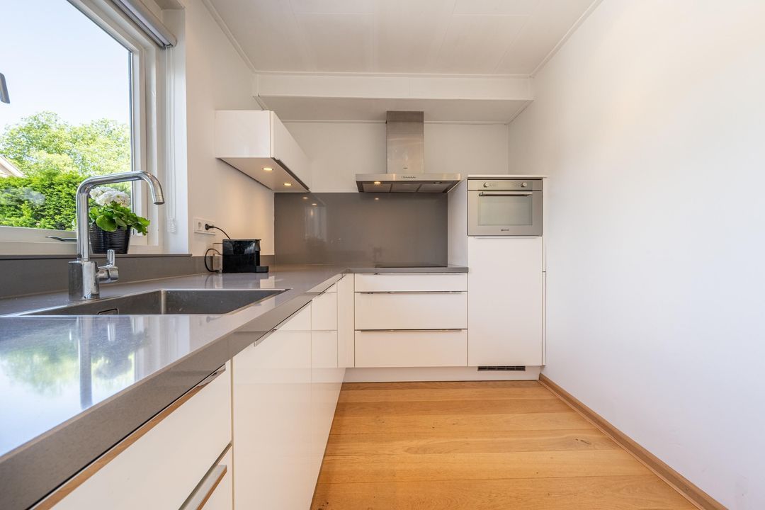 Aan de voorzijde van de woning vind je de moderne, ruime keuken. Deze is strak afgewerkt met een grijs werkblad en witte lades en kasten. Uiteraard is alle benodigde inbouwapparatuur aanwezig: een 4-pits inductiekookplaat, afzuigkap, koelkast, combi-magnetron en een vaatwasser.