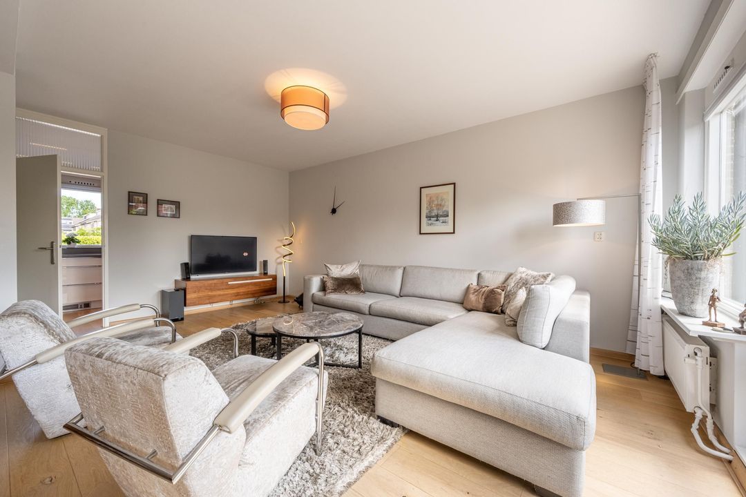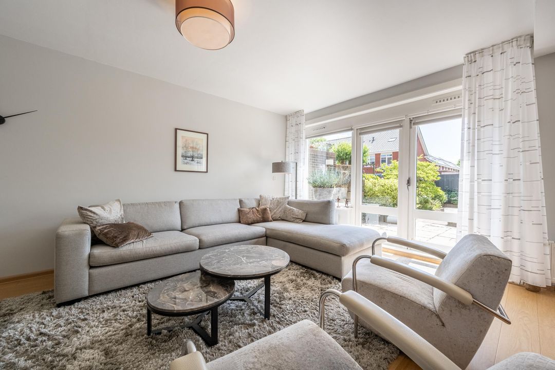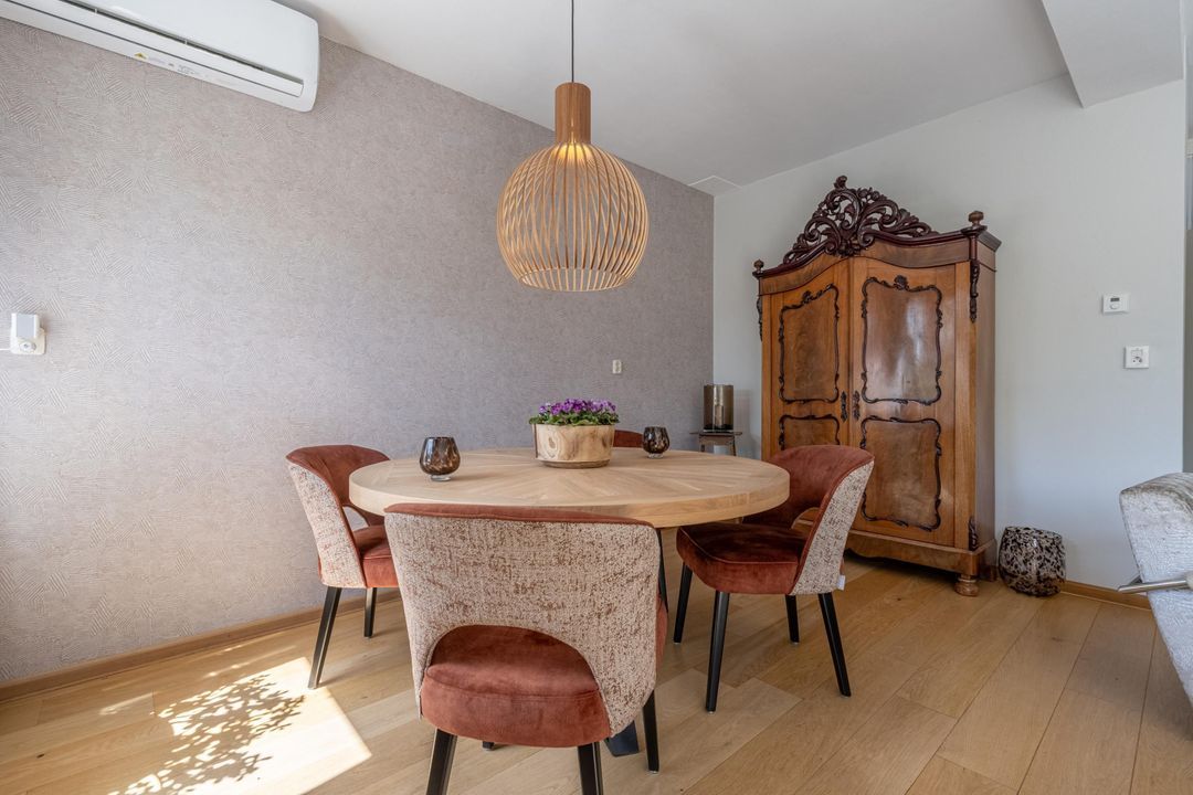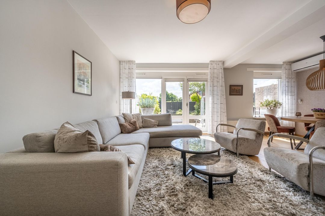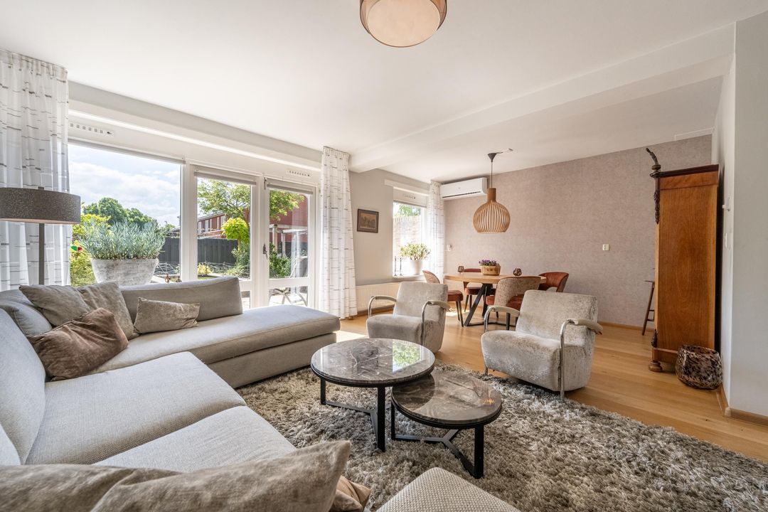 De tuingerichte woonkamer is heerlijk licht dankzij de grote raampartijen en openslaande deuren naar de tuin. Hier is volop ruimte voor een gezellige zithoek én een royale eettafel. De airco zorgt op warme dagen voor aangename verkoeling.