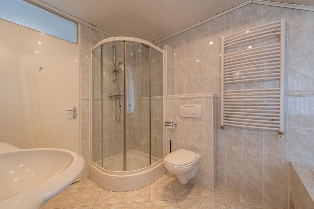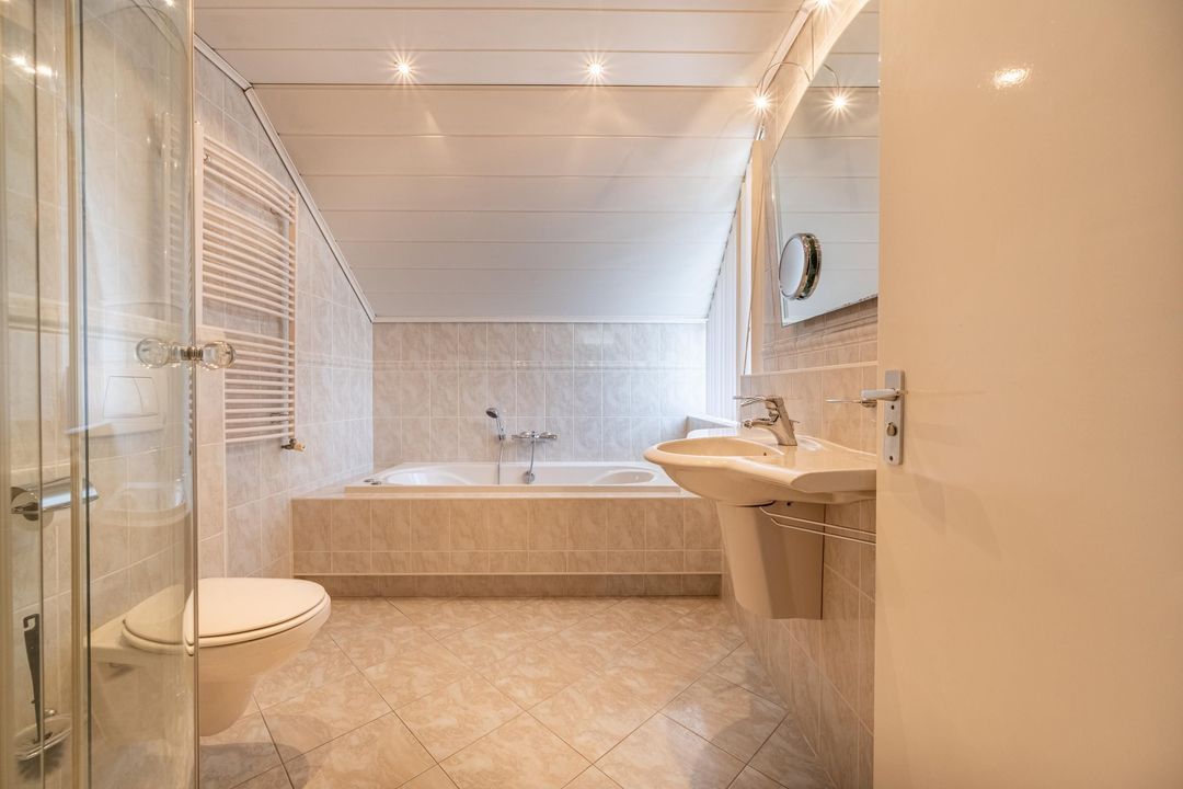 De badkamer is compleet uitgerust met een douche, ligbad met whirlpoolfunctie (deze is momenteel buiten gebruik), wastafel, toilet en mechanische ventilatie.