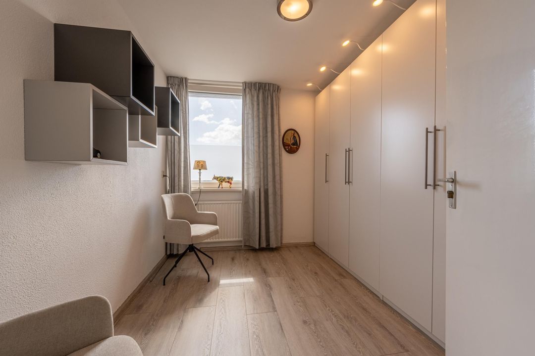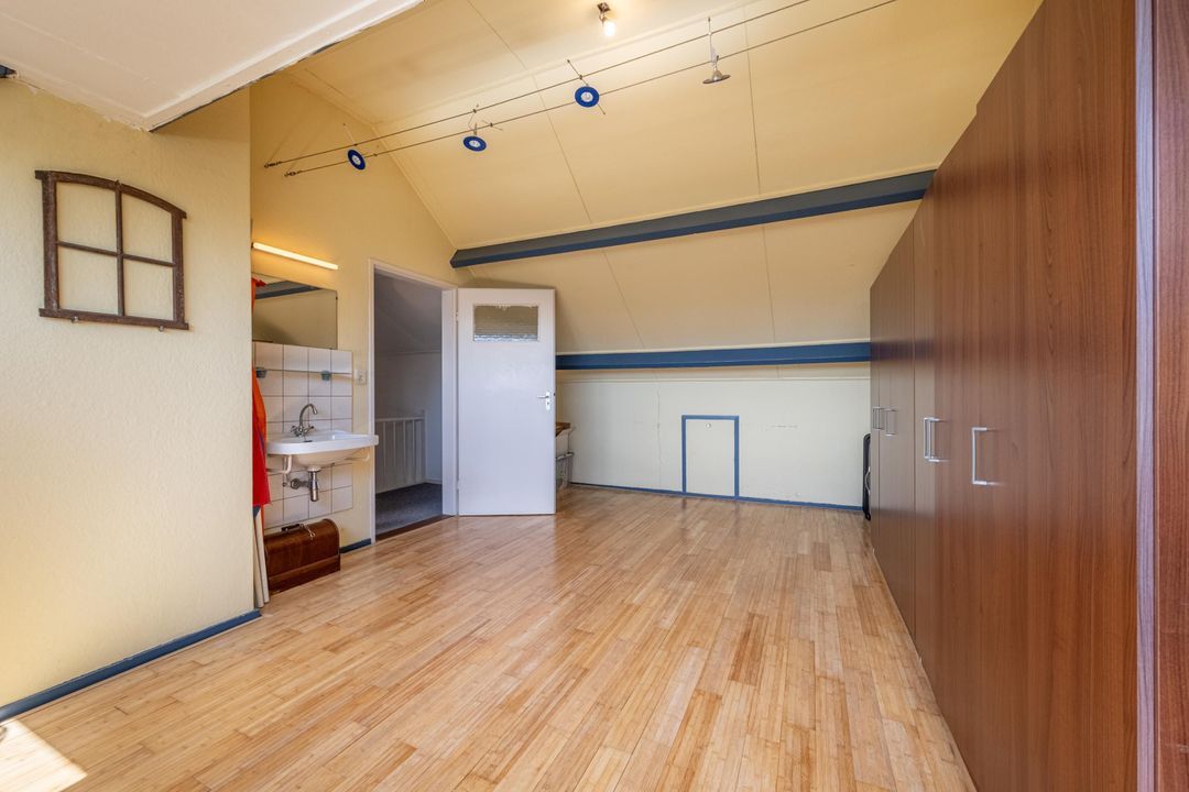 De vierde slaapkamer is een volwaardige, lichte ruimte dankzij de brede dakkapel. Voorzien van een eigen wastafel, knieschotten voor opbergruimte en een nette laminaatvloer – perfect als logeerkamer, hobbyruimte of werkkamer.