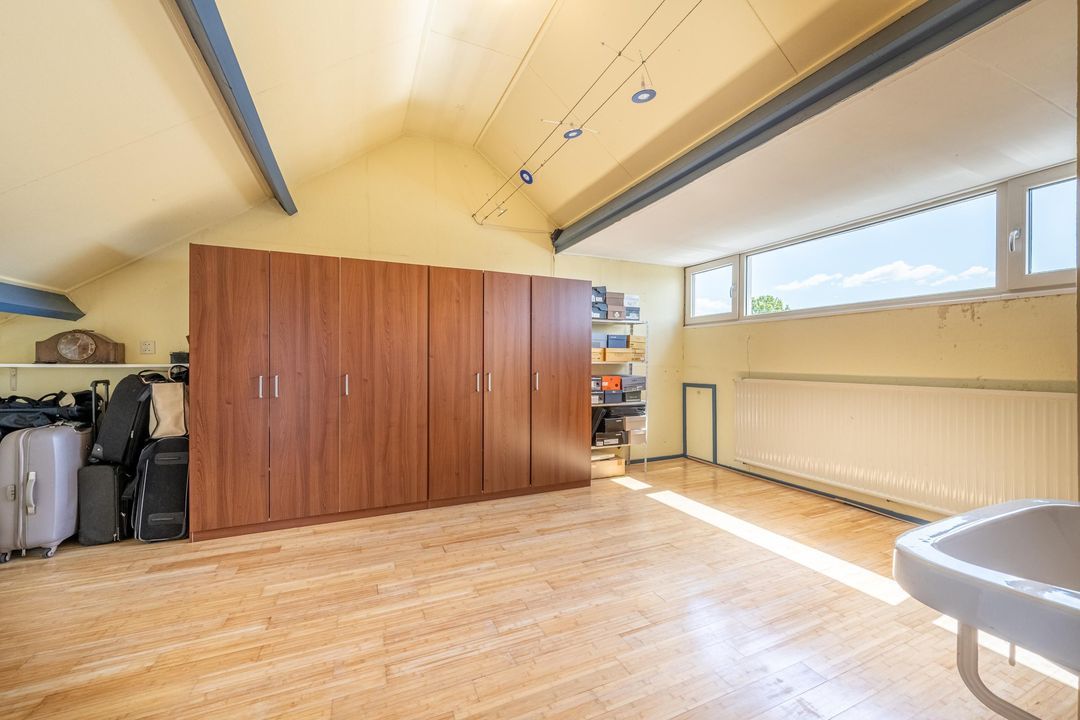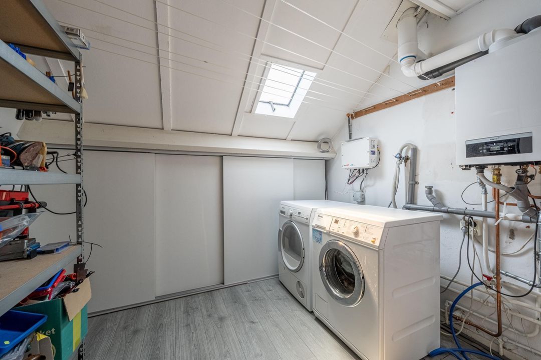 Op de tweede verdieping vind je een royale overloop met aansluitingen voor de wasmachine en droger, plus extra bergruimte achter de knieschotten en een dakraam. Ook de cv-ketel is hier gesitueerd.