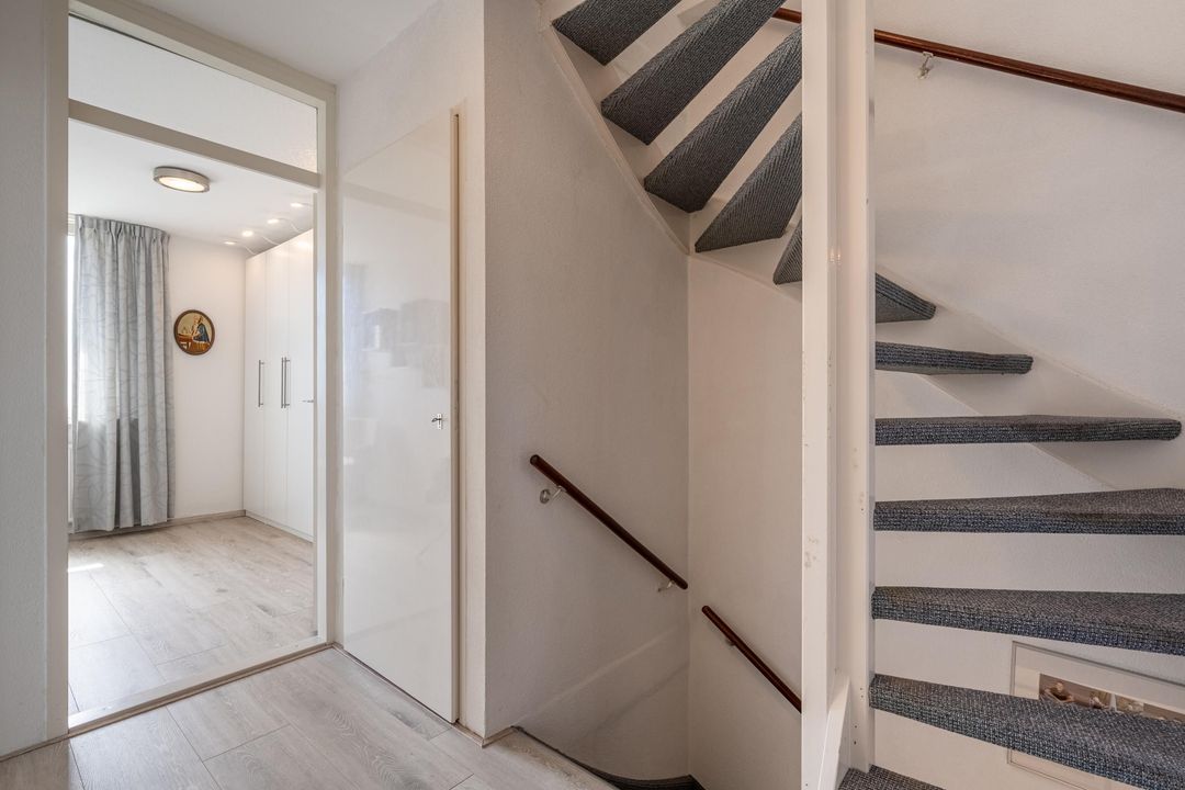Je komt de woning binnen via de hal met toegang tot de garage, meterkast, een nette toiletruimte met fonteintje, de trap naar de eerste verdieping én een handige trapkast.