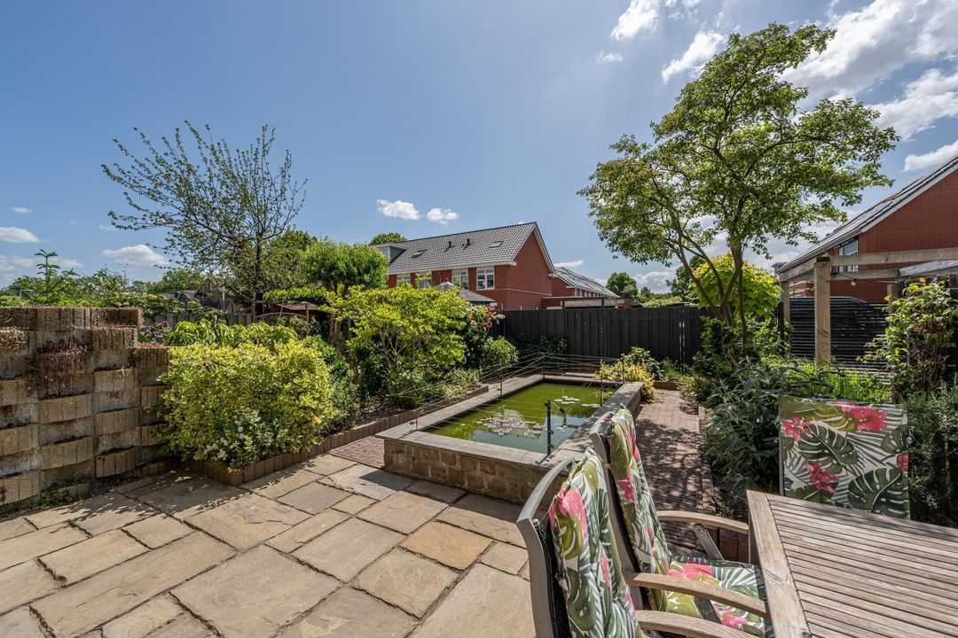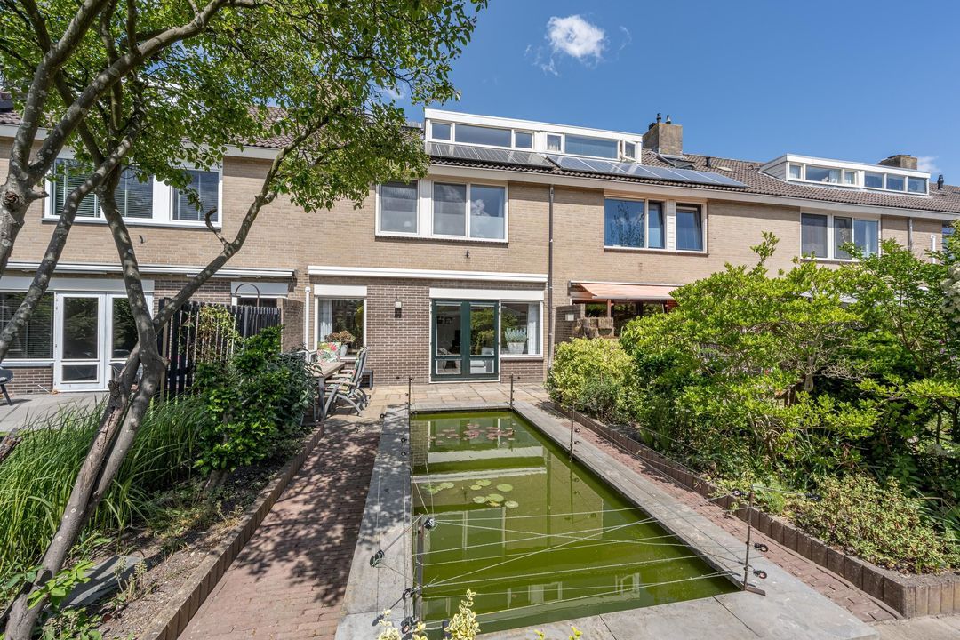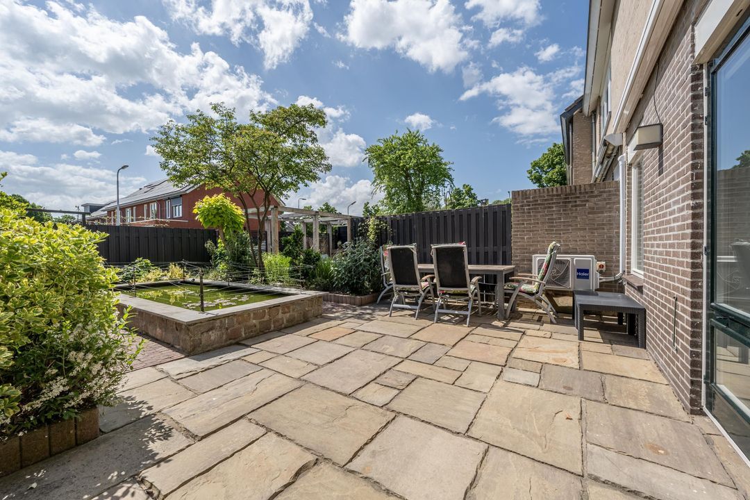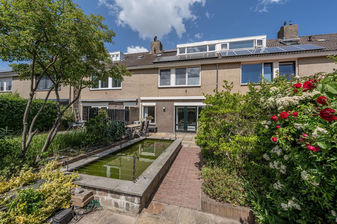 Zonliefhebbers opgelet: de achtertuin ligt pal op het zuiden en biedt volop privacy! De tuin is verzorgd aangelegd met tegels, volwassen beplanting, een vijver met vissen (deze blijven achter), een elektrisch zonnescherm en voldoende ruimte voor een loungehoek of eettafel. Achterom bereikbaar.