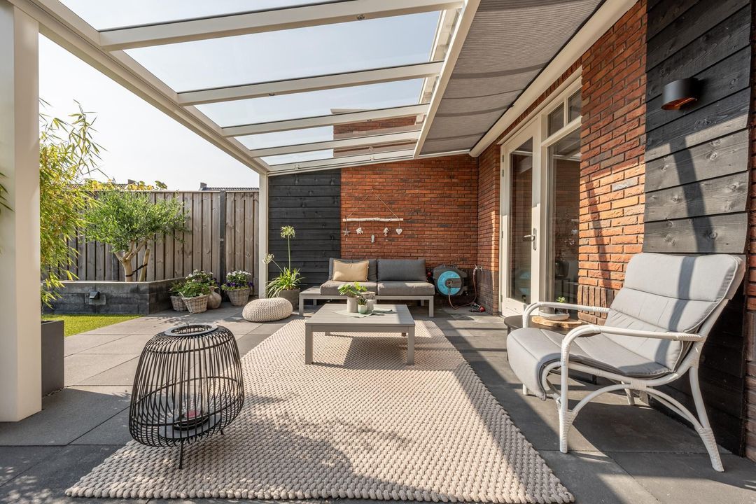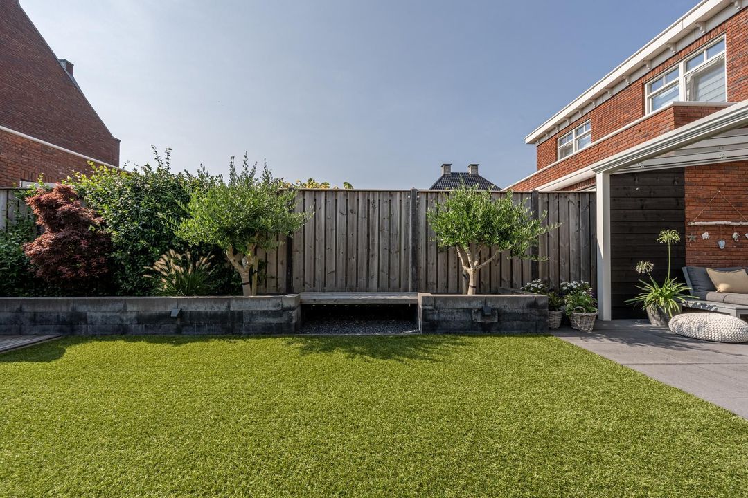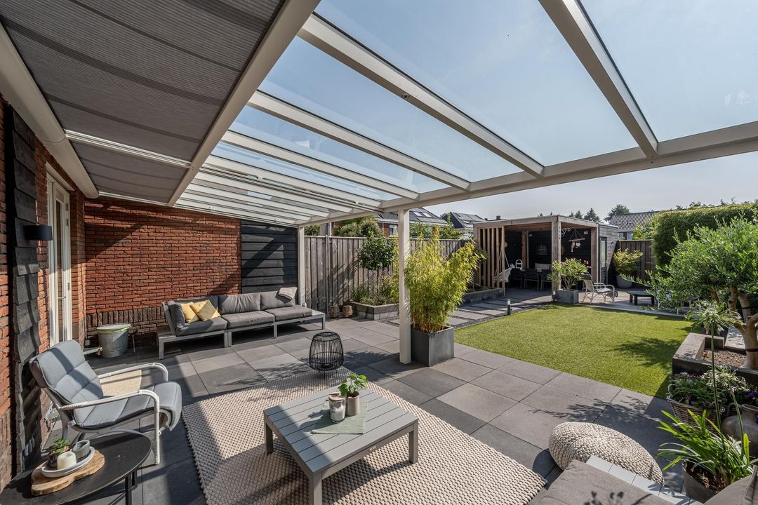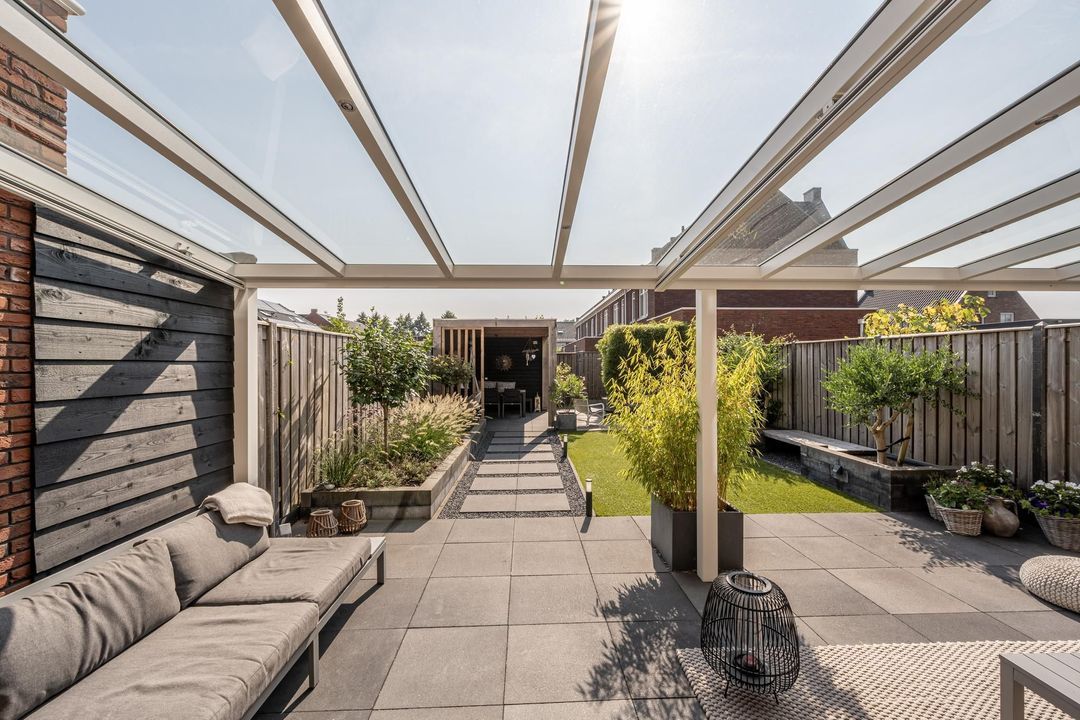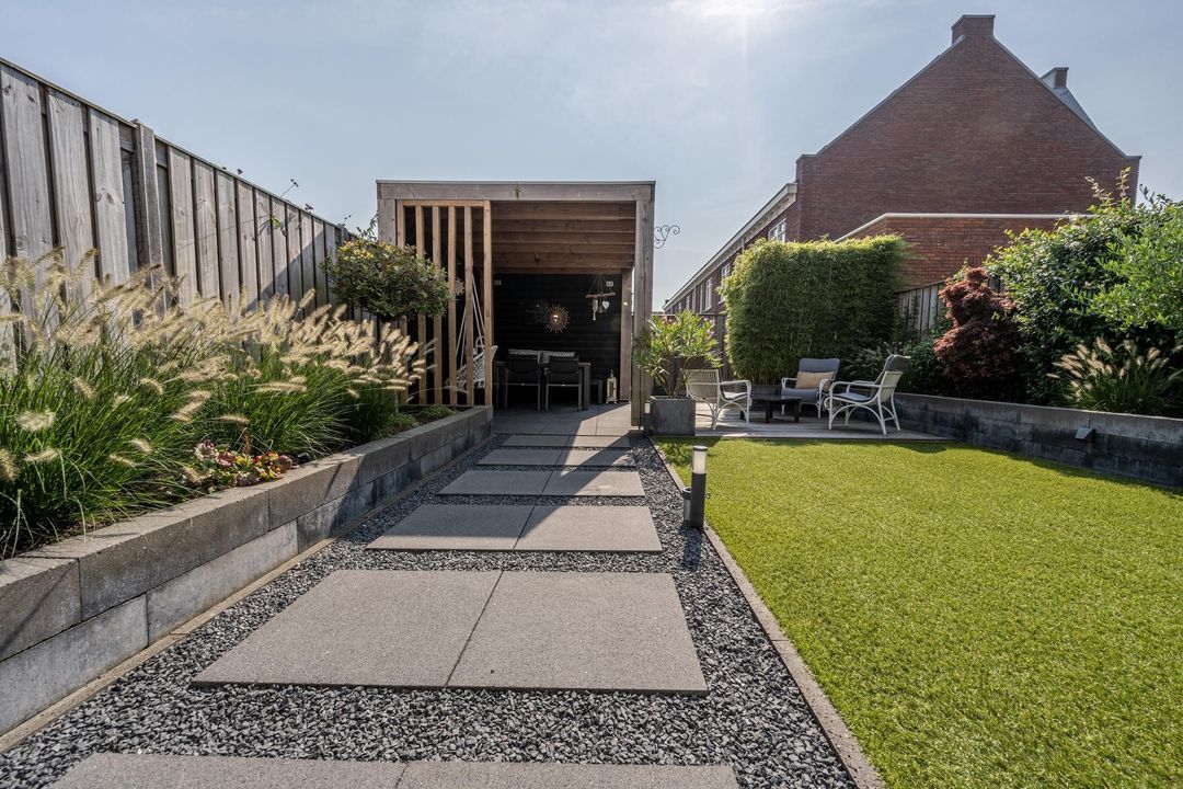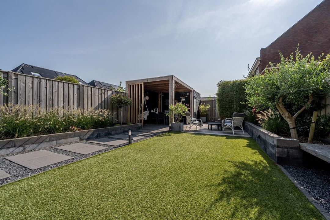 De diepe, zonnige achtertuin op het zuiden is een waar paradijs. Geniet van de heerlijke overkapping direct aan de woning, uitgerust met zonnescherm voor schaduw op warme dagen. Er zijn twee terrassen waar u gezellig kunt zitten en achterin de tuin vindt u een sfeervolle overkapping om heerlijk lang te tafelen of te barbecueën. De tuin heeft een groene uitstraling dankzij het kunstgras en de prachtige beplante borders. De houten berging met achterom biedt voldoende ruimte voor fietsen.