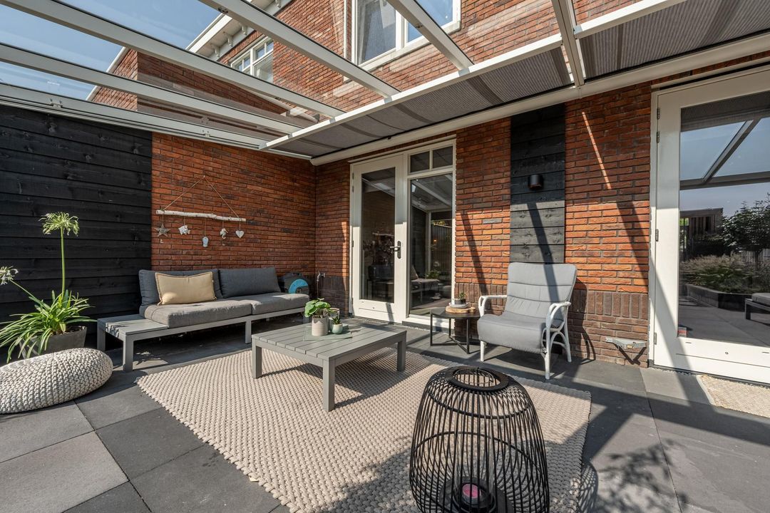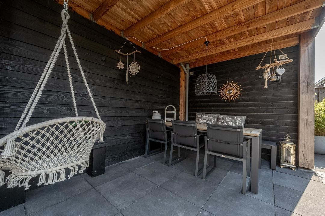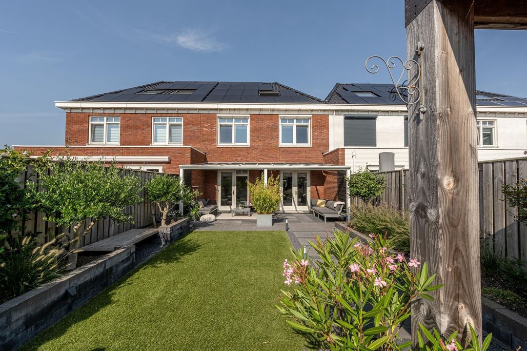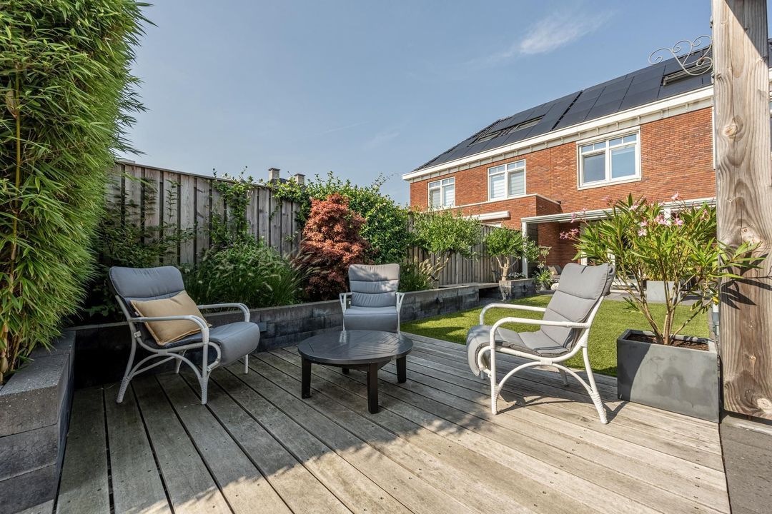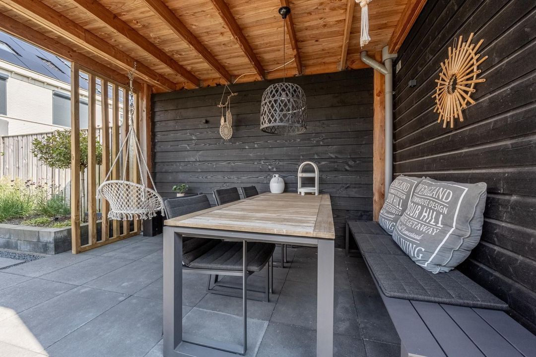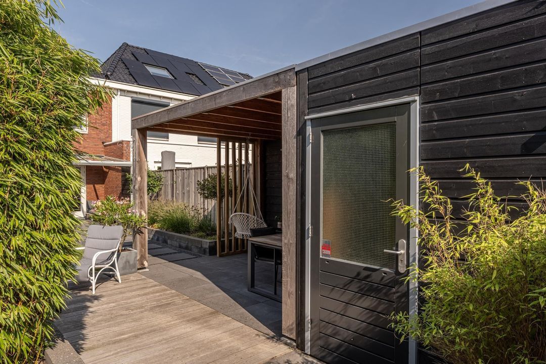 De diepe, zonnige achtertuin op het zuiden is een waar paradijs. Geniet van de heerlijke overkapping direct aan de woning, uitgerust met zonnescherm voor schaduw op warme dagen. Er zijn twee terrassen waar u gezellig kunt zitten en achterin de tuin vindt u een sfeervolle overkapping om heerlijk lang te tafelen of te barbecueën. De tuin heeft een groene uitstraling dankzij het kunstgras en de prachtige beplante borders. De houten berging met achterom biedt voldoende ruimte voor fietsen.