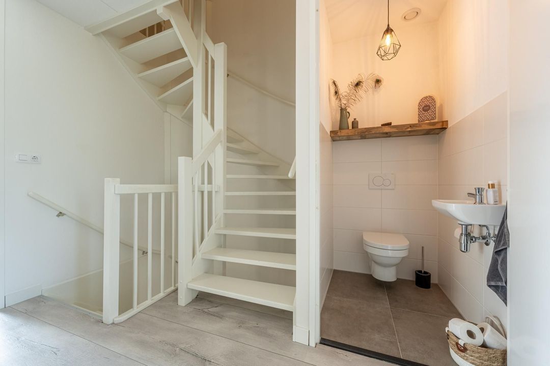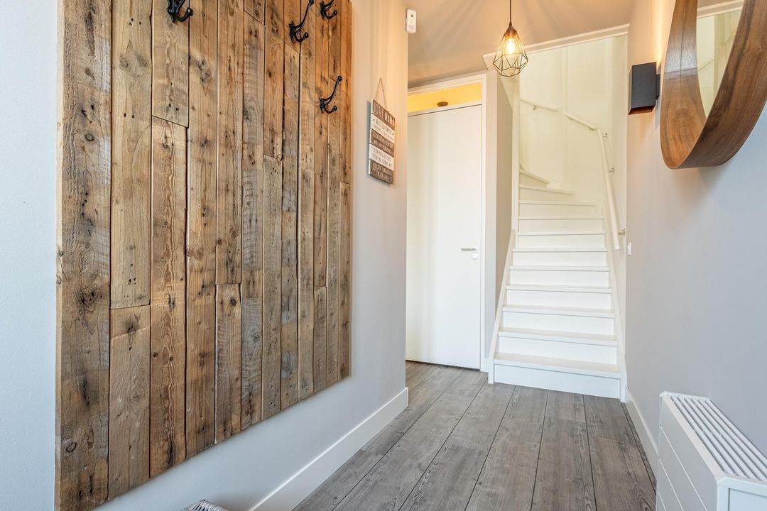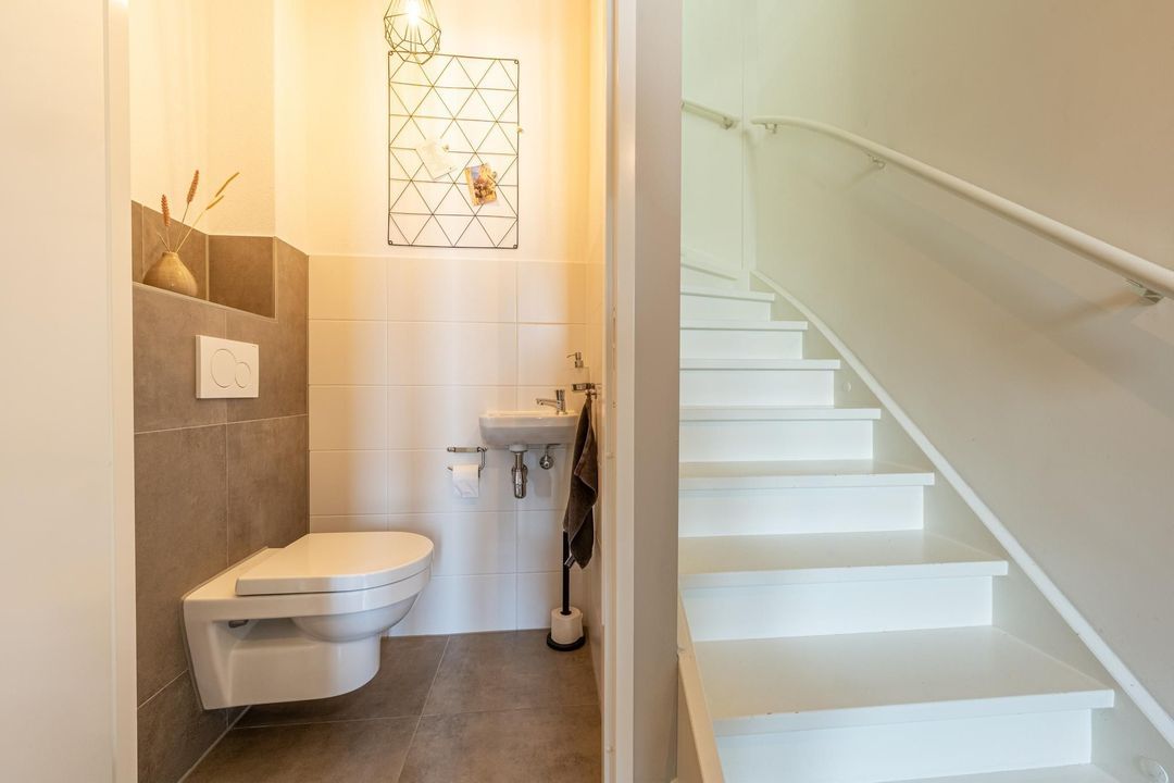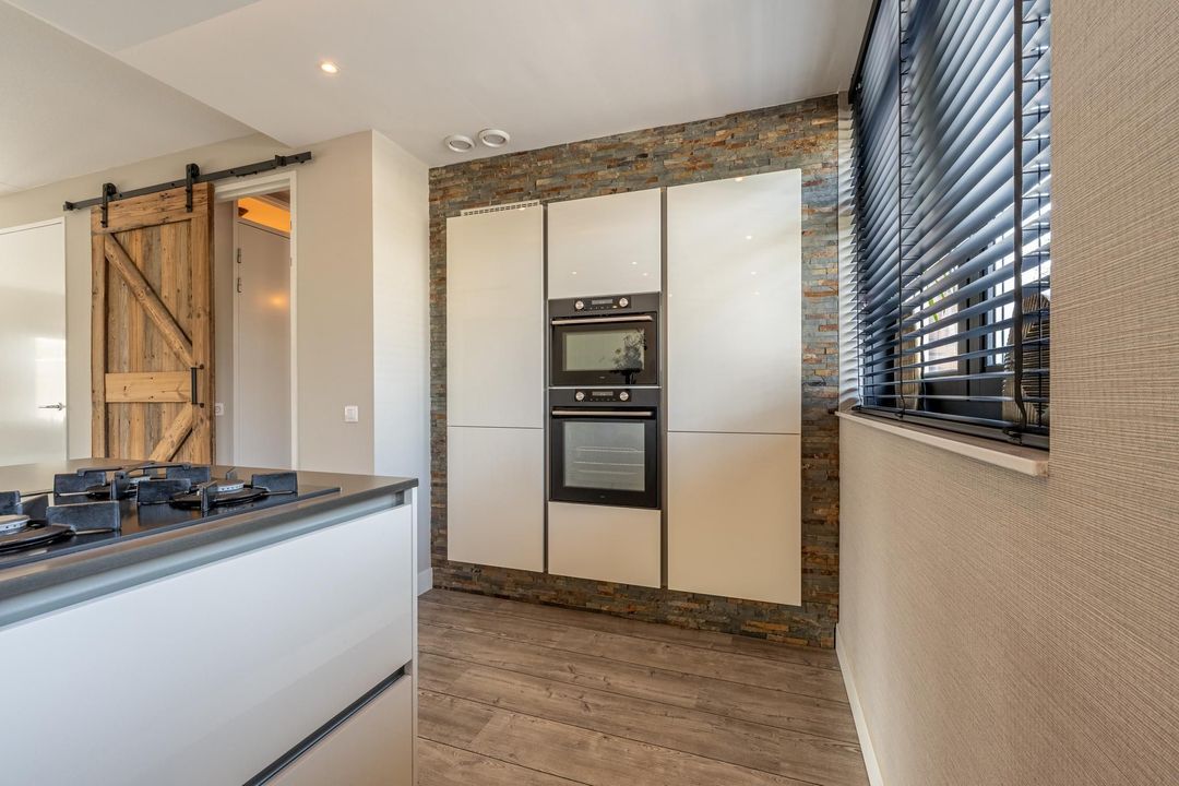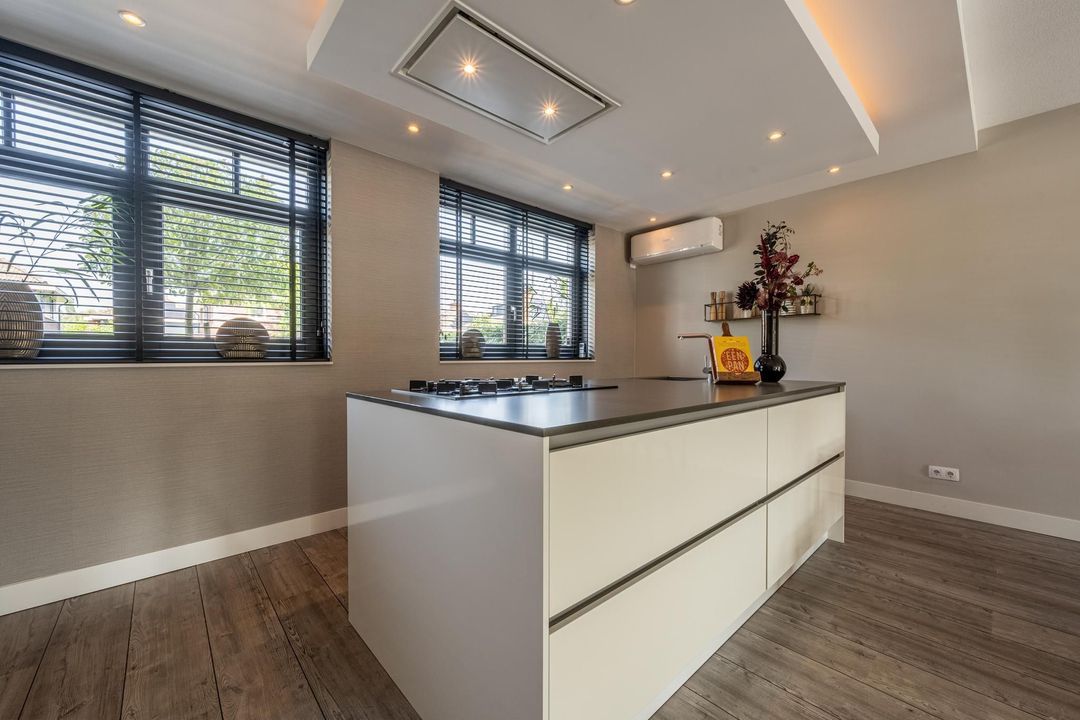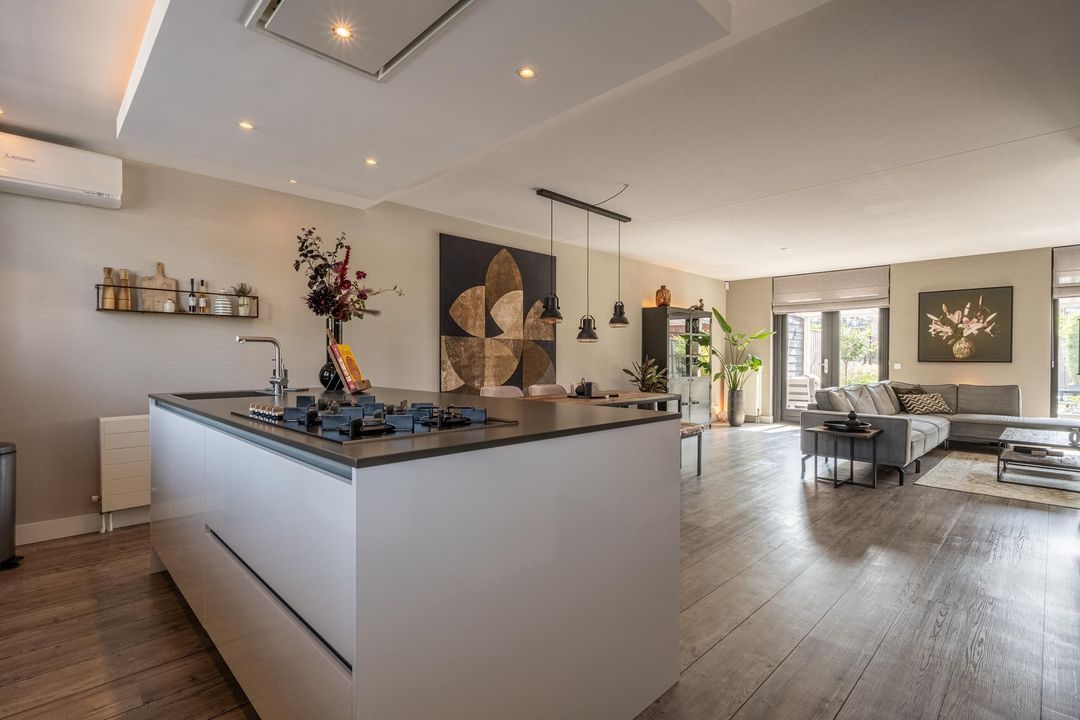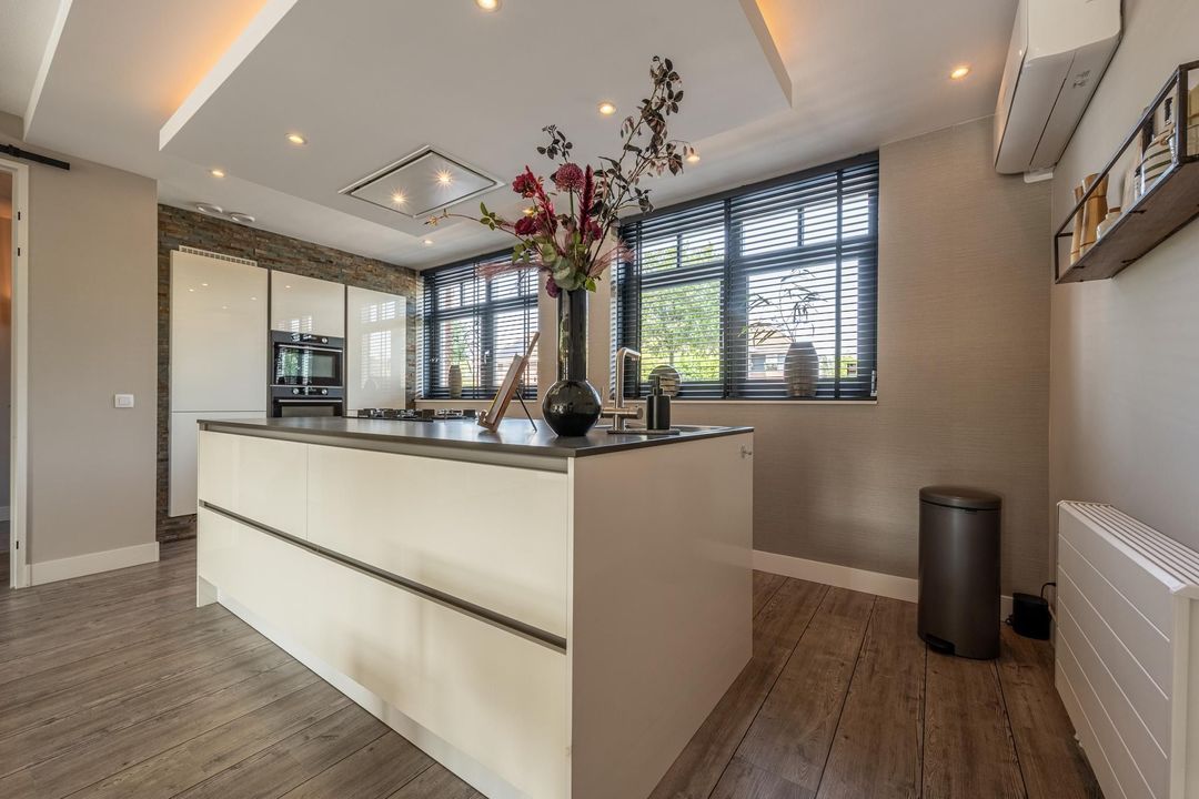 Binnenkomst in een ruime entree met meterkast, trapopgang en een stijlvol toilet met fonteintje. De woonkamer biedt een zee van ruimte met aan de voorzijde het hart van de living: de open keuken. De keuken is ingericht met een ingebouwde kastenwand met koel-vriescombinatie, oven en combi-oven. Het kook en spoeleiland geeft de ruimte aan een 5-pits gaskookplaat met wokbrander, ingebouwde plafondafzuigkap, vaatwasser en de kokend waterkraan. Daarnaast is er veel opbergruimte in de ladekasten en in de handige diepe trapkast.