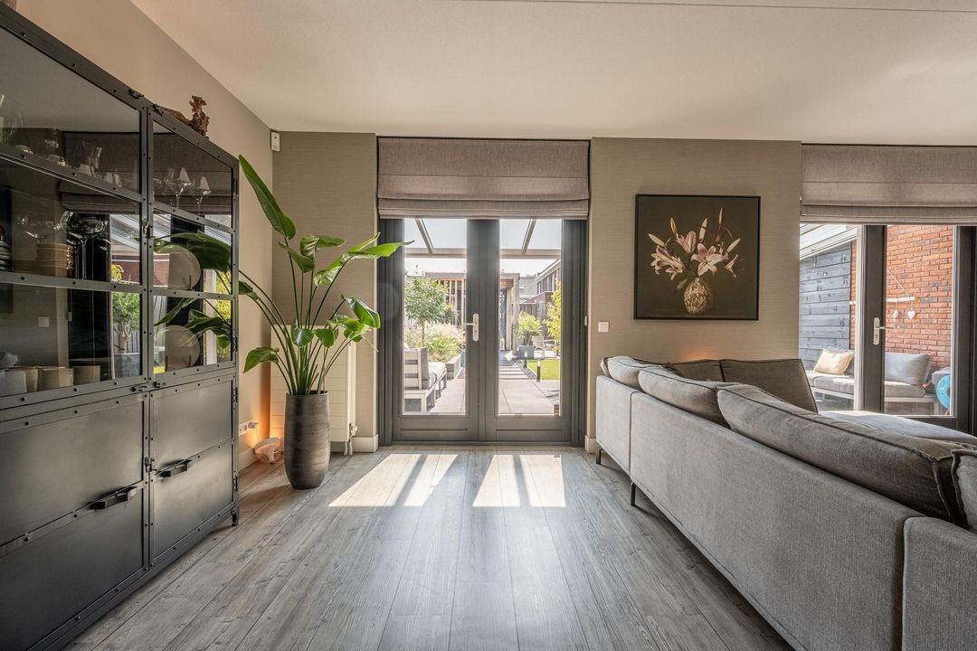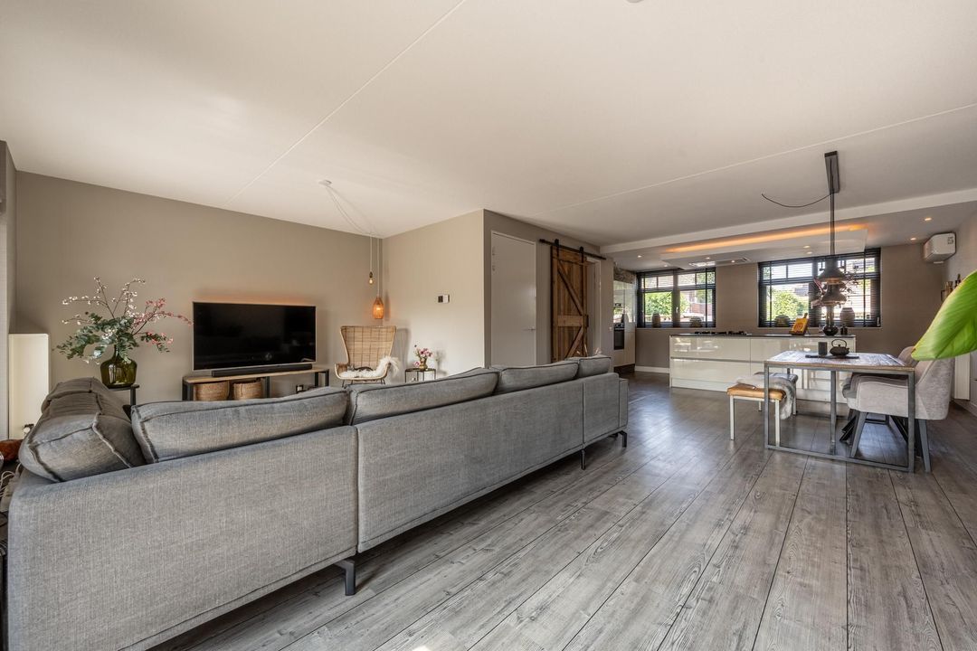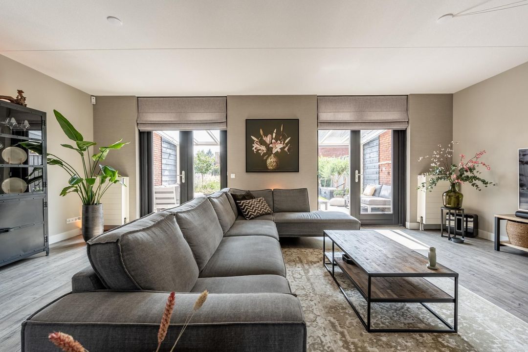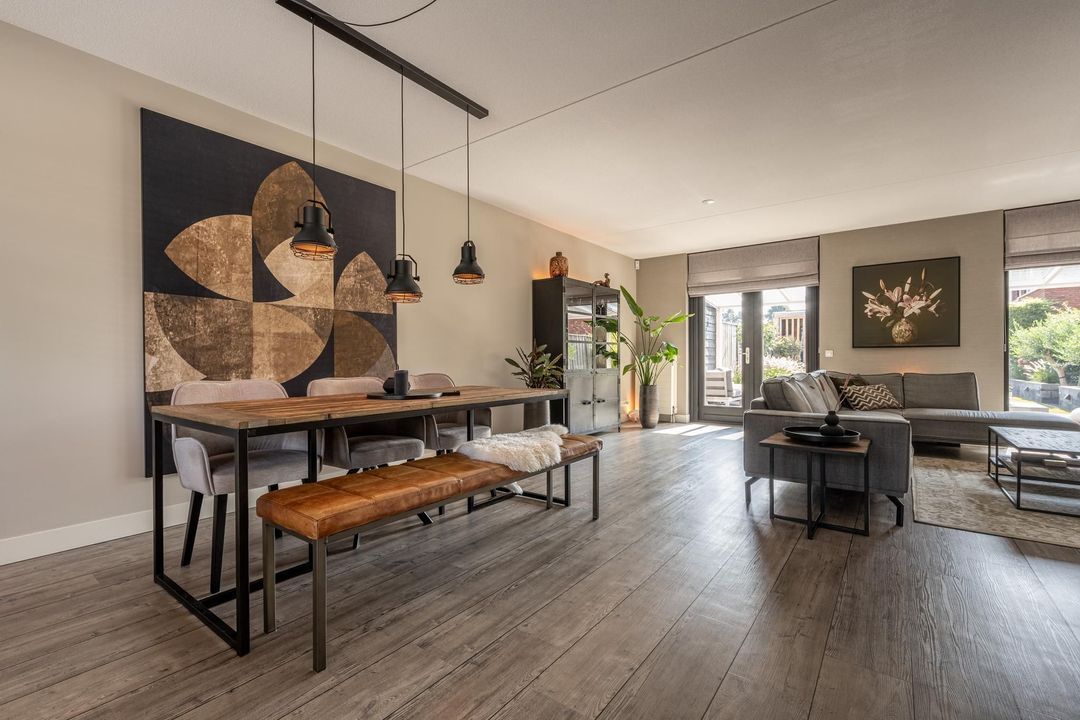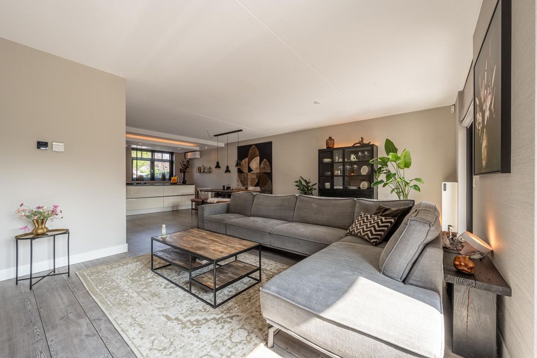 Aansluitend aan de keuken bevindt zich de royale eethoek, perfect voor gezellige familiediners. Aan de achterzijde van de woonkamer is de ruime zithoek, die dankzij de dubbele openslaande deuren direct toegang geeft tot de fraai aangelegde groene achtertuin.