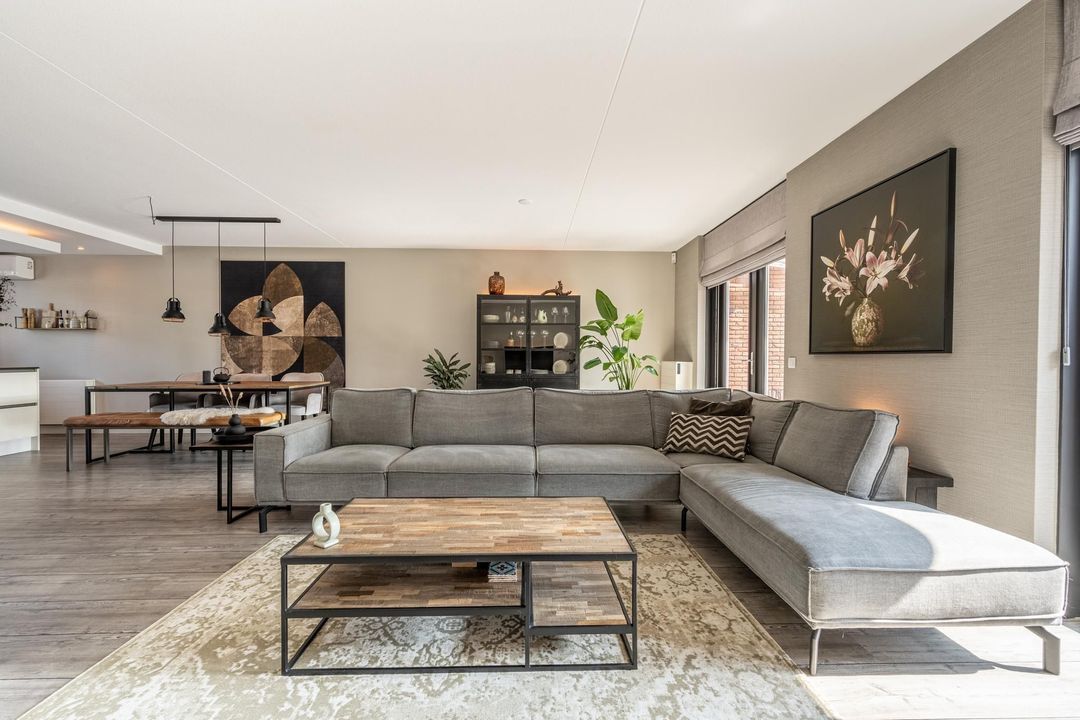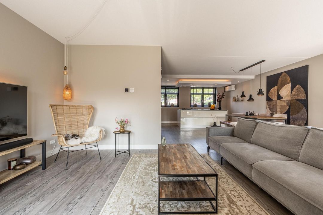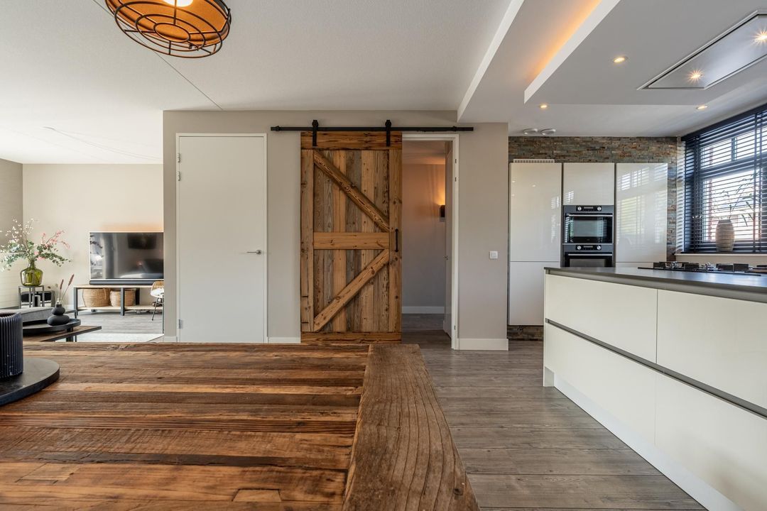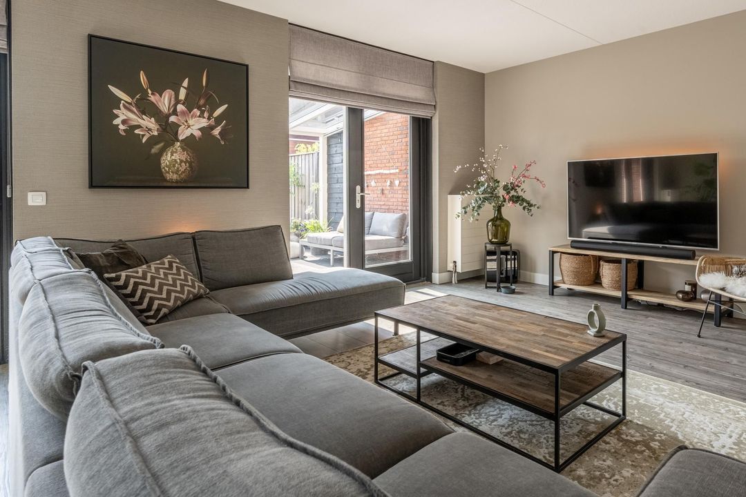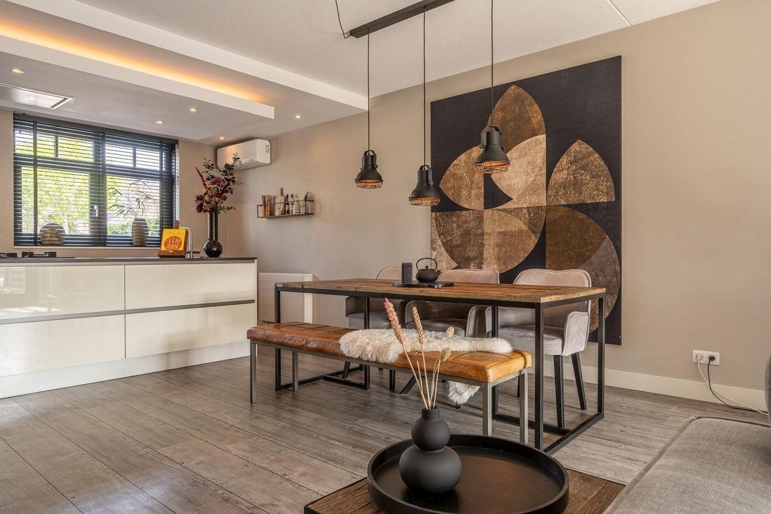 Aansluitend aan de keuken bevindt zich de royale eethoek, perfect voor gezellige familiediners. Aan de achterzijde van de woonkamer is de ruime zithoek, die dankzij de dubbele openslaande deuren direct toegang geeft tot de fraai aangelegde groene achtertuin.