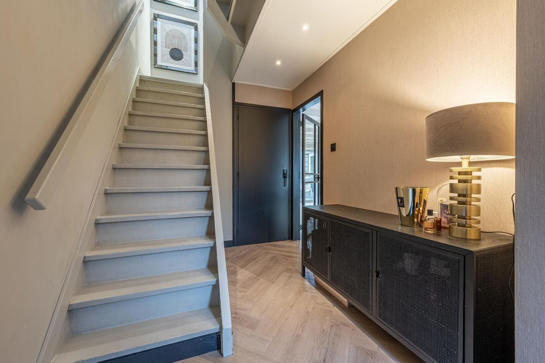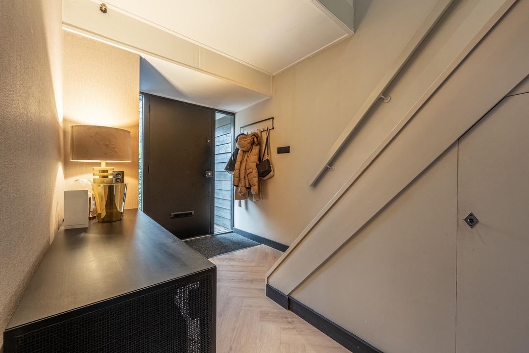 Entree van de woning, hal met meterkast, trapkast, toilet en trapopgang naar de eerste verdieping en via een fraaie houten deur toegang tot de woonkamer.