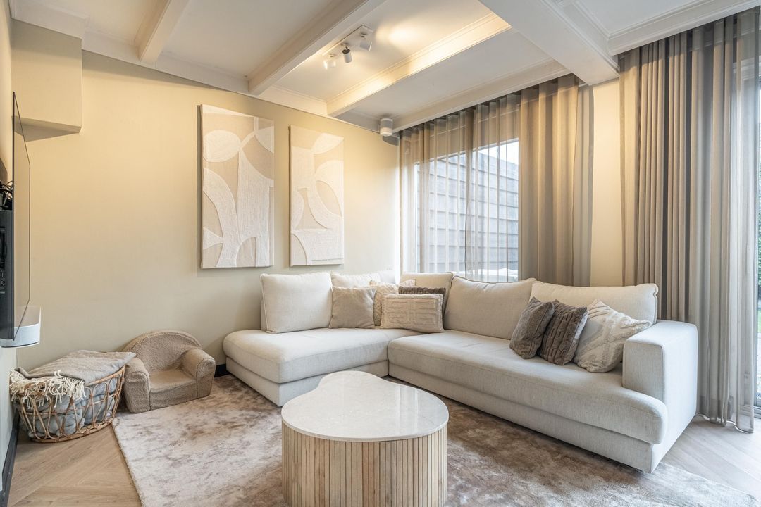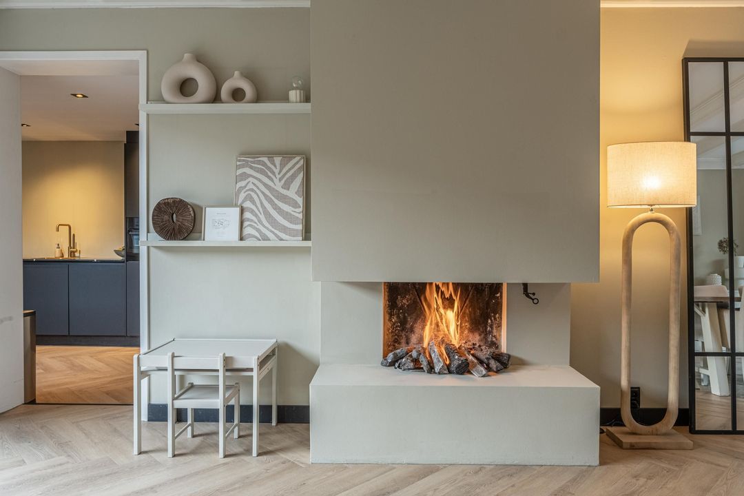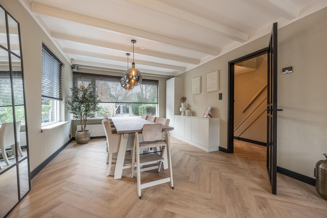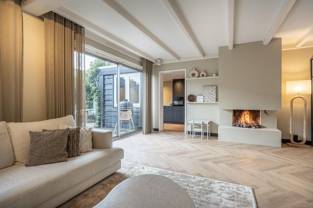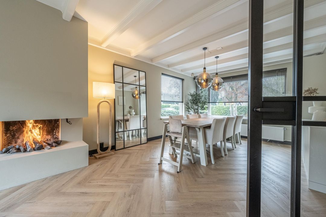 De woonkamer is ruim en mooi afgewerkt, met plafondbalken en een gezellige gashaard. De visgraat PVC-vloer met vloerverwarming loopt door in de hele leefruimte. Aan de achterzijde zorgt de schuifpui voor veel licht en een directe verbinding met de tuin.