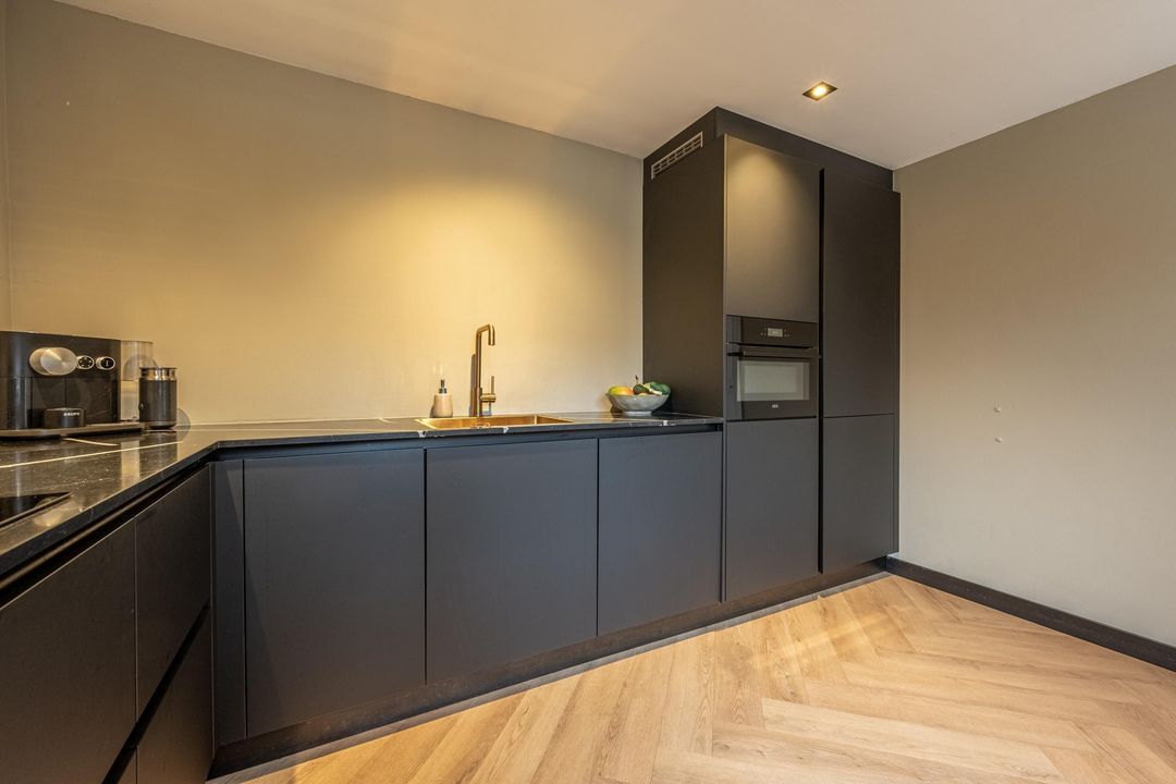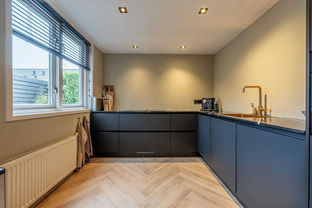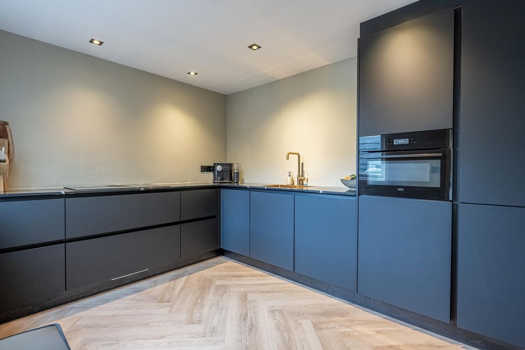 De half open keuken (2021) is in L-opstelling en ingericht met diverse inbouwapparatuur zoals een; inductiekookplaat met afzuiging, combi-oven, vaatwasser, koelkast en vriezer. De keuken heeft mat zwarte kasten en een composiet werkblad. De spotjes in het plafond zorgen voor een mooi geheel dat perfect op elkaar is afgestemd.