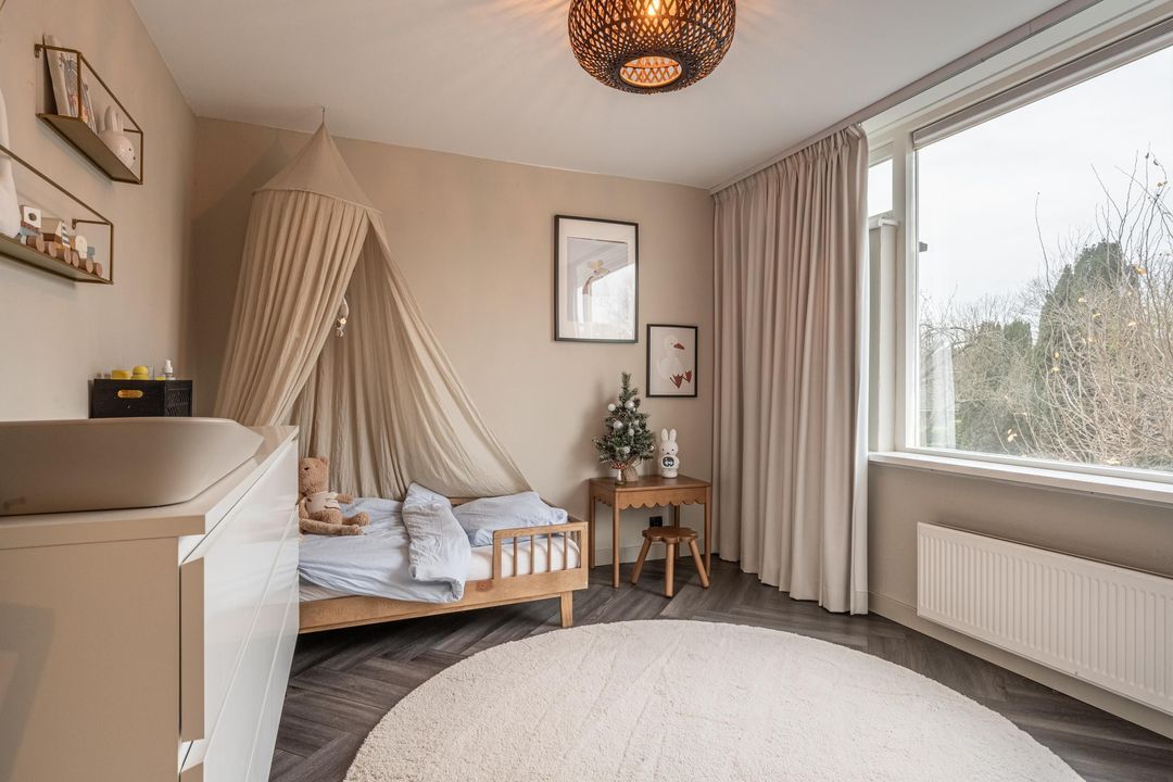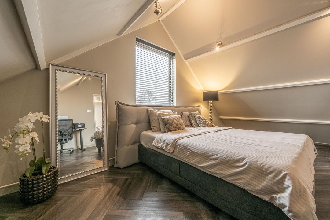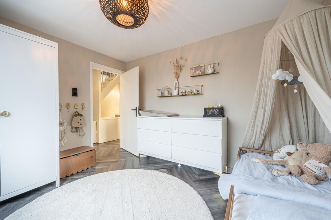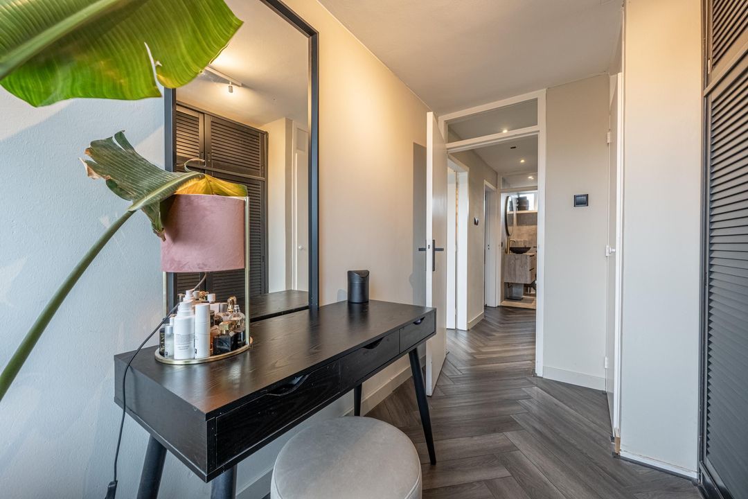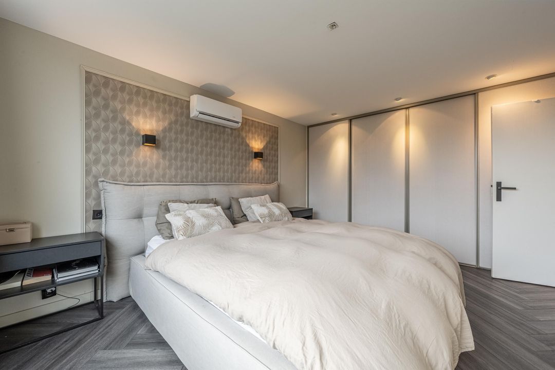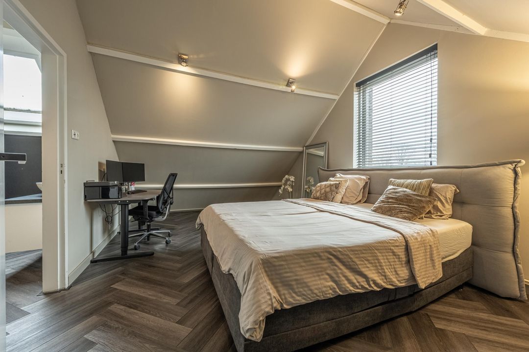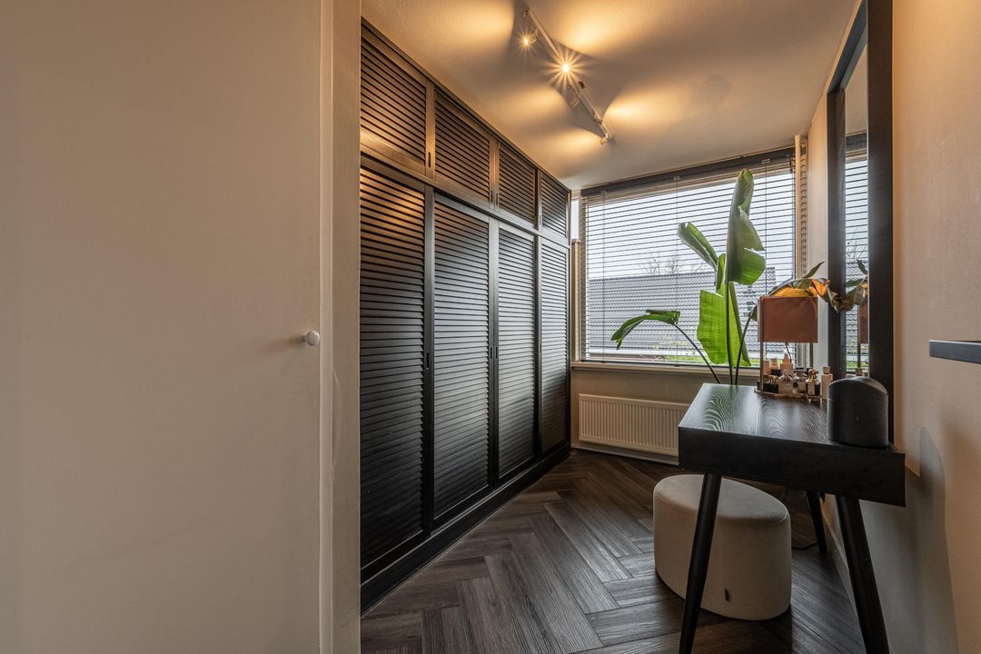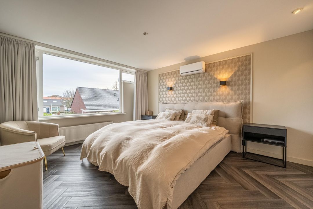 Overloop met toegang tot 3 slaapkamers en de badkamer. De hoofdslaapkamer aan de achterzijde van de woning heeft een inbouwkast en airco die zowel koelt als verwarmt. De tweede slaapkamer heeft een vaste- en inbouwkast. De derde slaapkamer aan de voorzijde is ruim en heerlijk licht door het grote raam.
