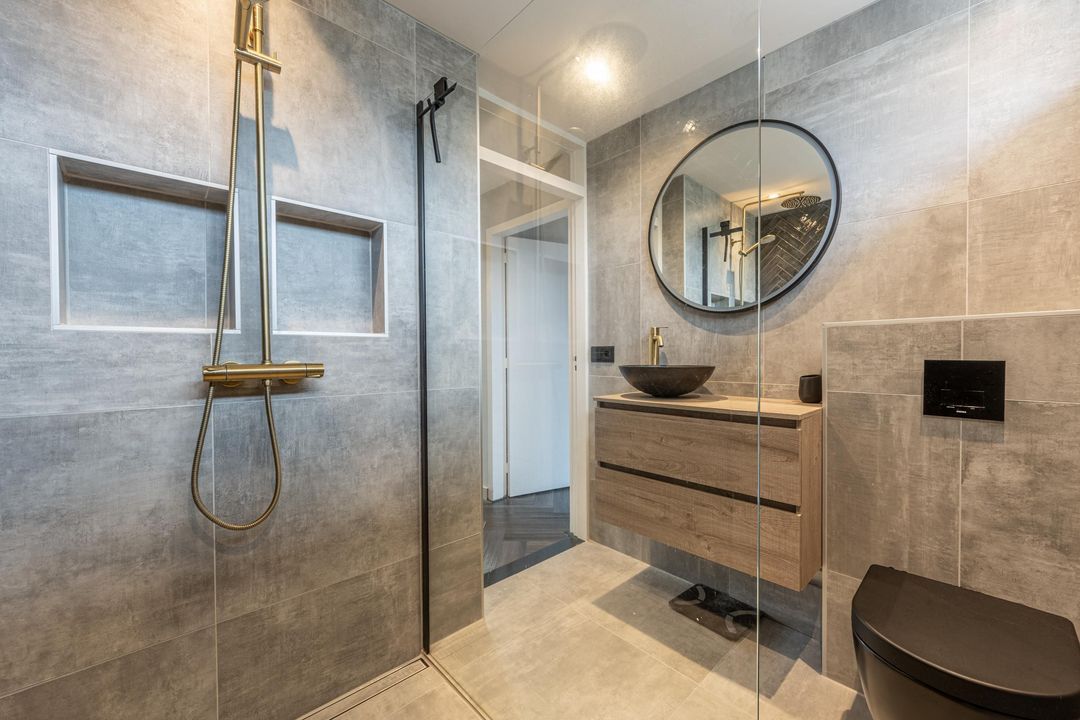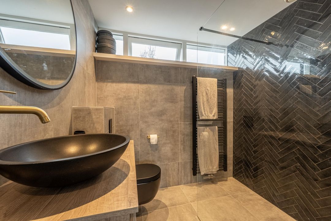 De badkamer (2021) is uitgerust met een comfortabele inloopdouche met regenkopdouche en handige nisjes, wastafelmeubel met spoelbak en lades, design radiator en hangend toilet. Grijze vloer- en wandtegels, een spotjes plafond en visgraat tegelwerk in de inloopdouche zorgen verder voor een moderne uitstraling.