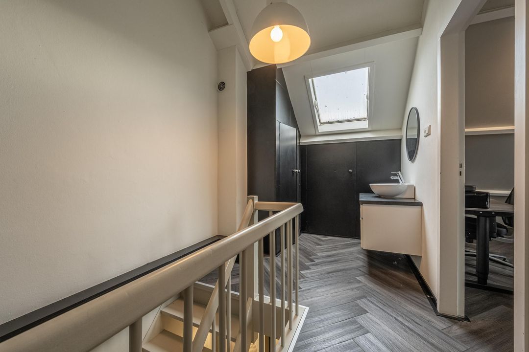 Voorzolder met wastafelmeubel met spoelbak, kast met daarin de wasmachine- en drogeropstelling en CV-ketel. Ruime zolderkamer met hoge nok en groot raam, ideaal als extra slaapkamer of hobby/ werkruimte.