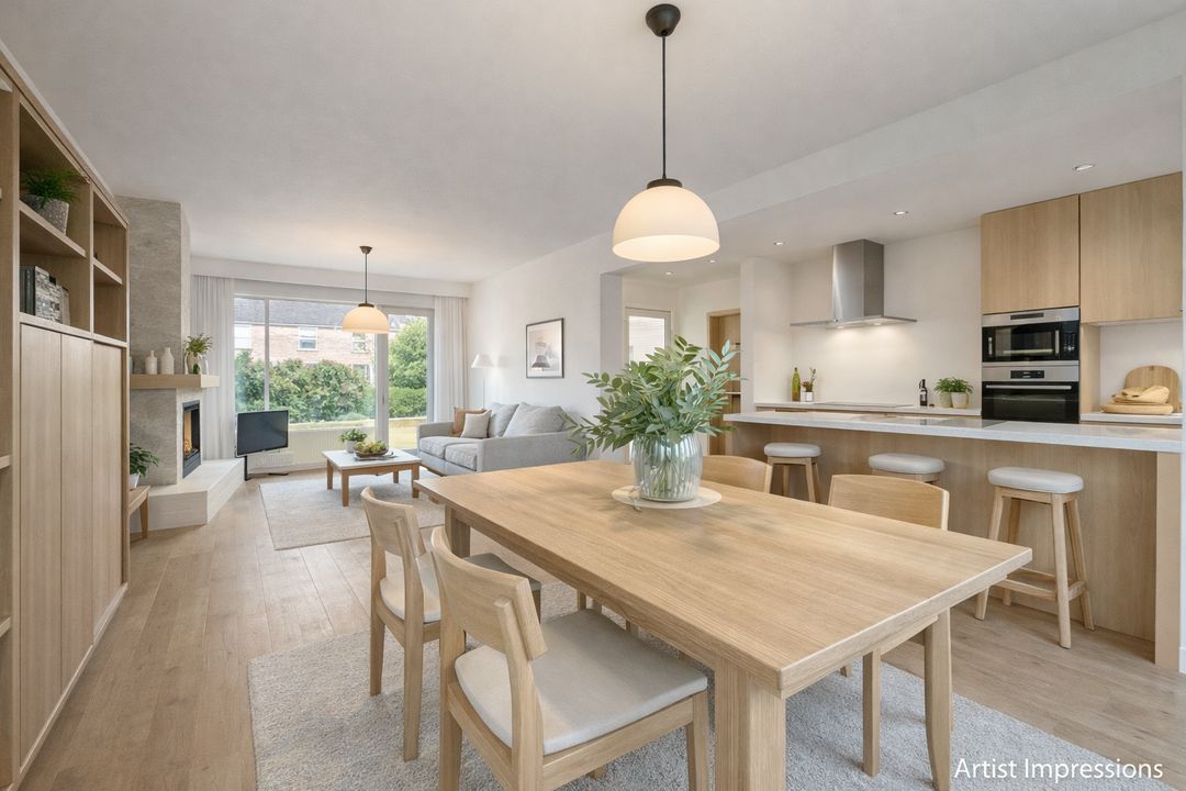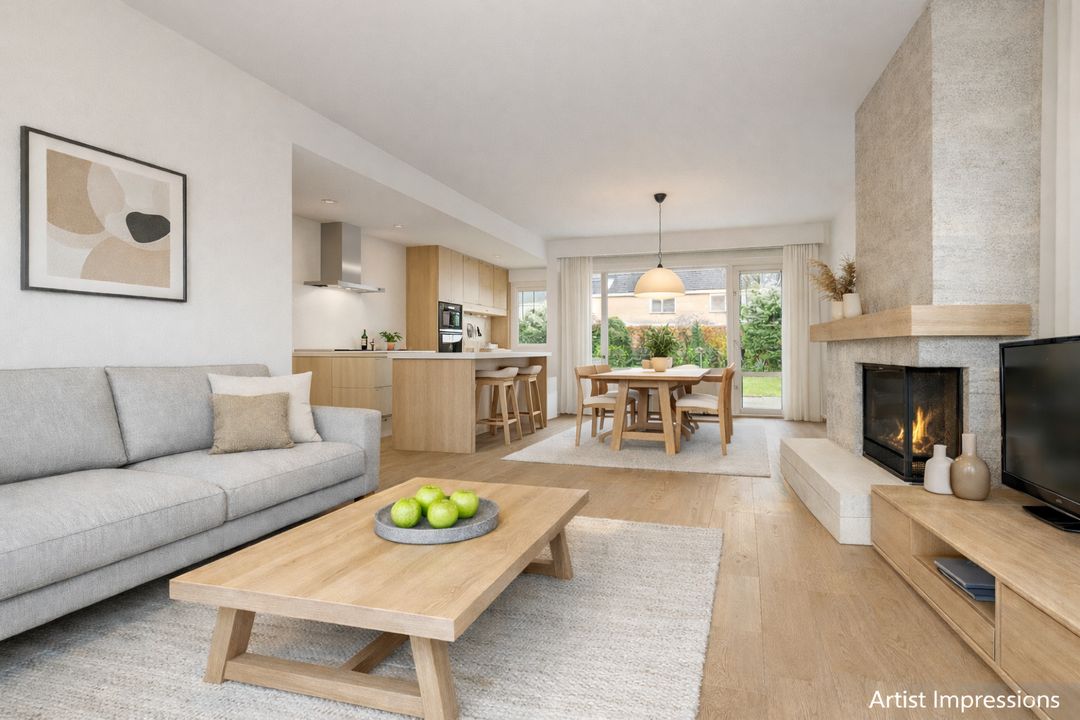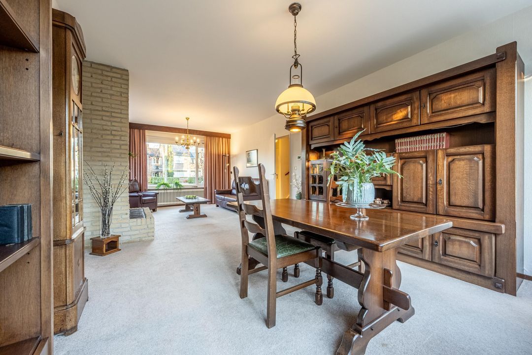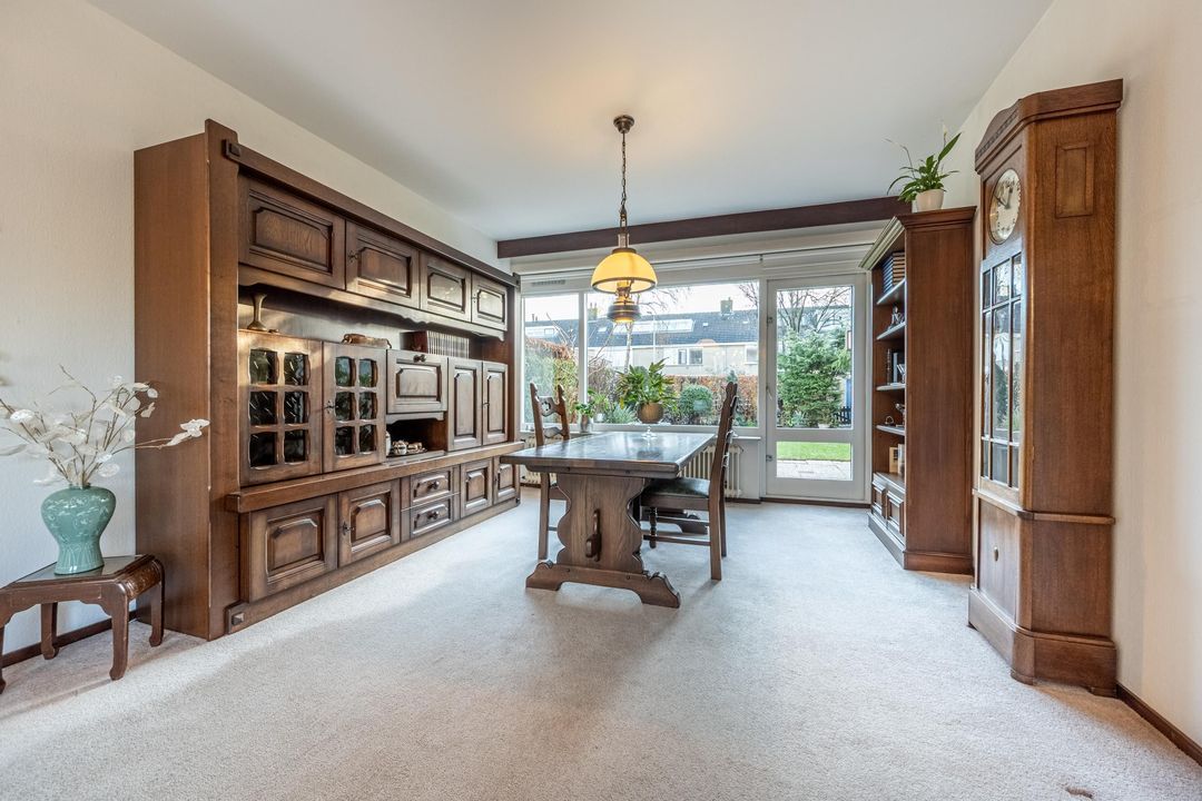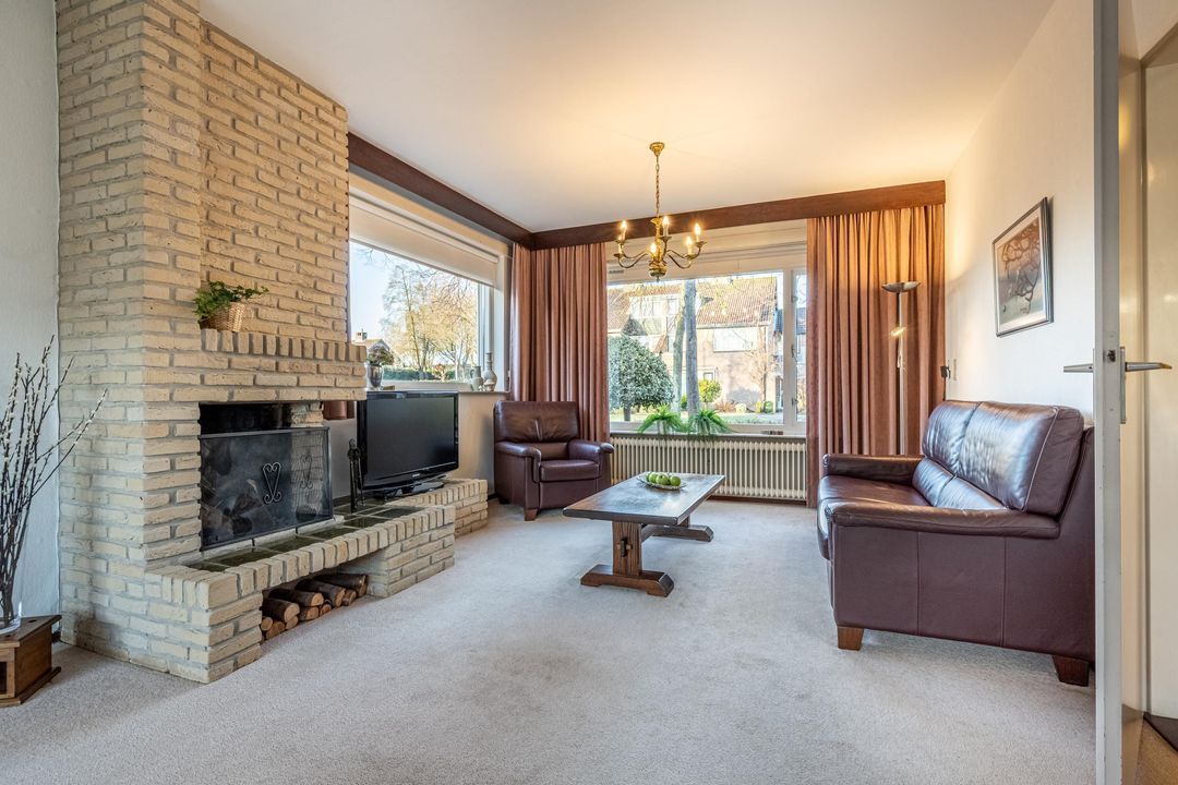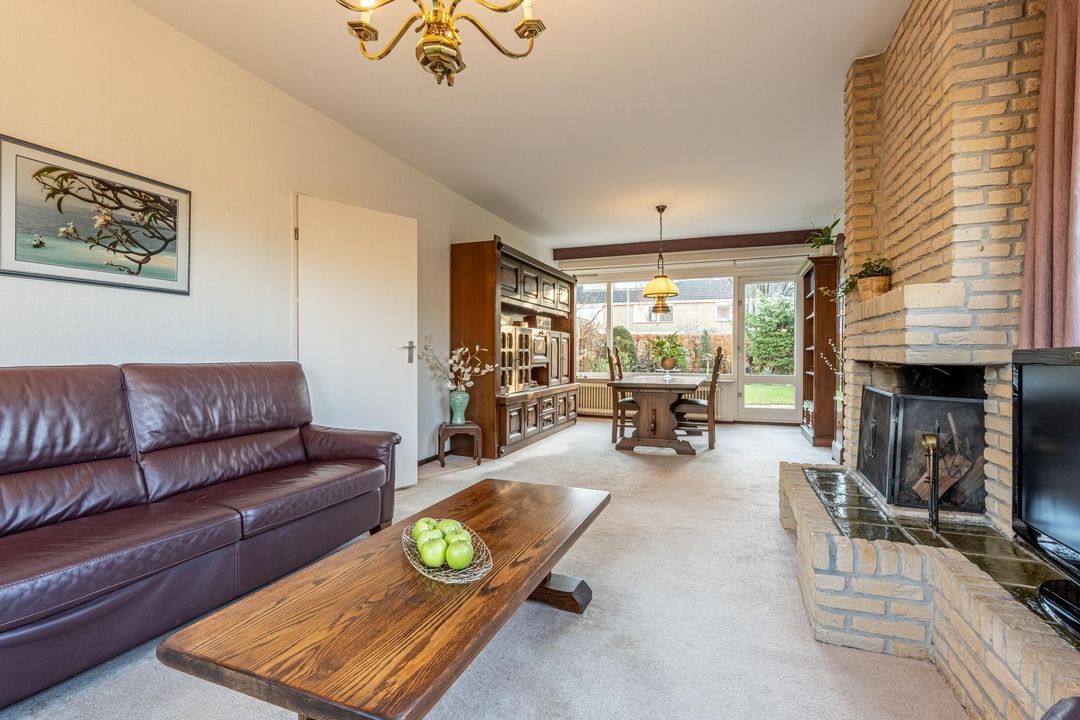 De woonkamer is ruim opgezet en biedt een prettige indeling met veel daglicht aan zowel de voor- als achterzijde, het voorraam en zijraam zijn voorzien van screens. Aan de voorzijde bevindt zich de zithoek met open haard als centraal element. Aan de achterzijde ligt de eetkamer met ruimte voor een grote eettafel en directe toegang tot de tuin. De vloer is afgewerkt met vloerbedekking. Aan de voorzijde is zonwering aanwezig.