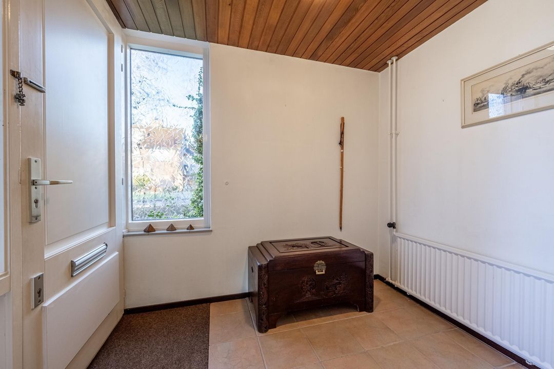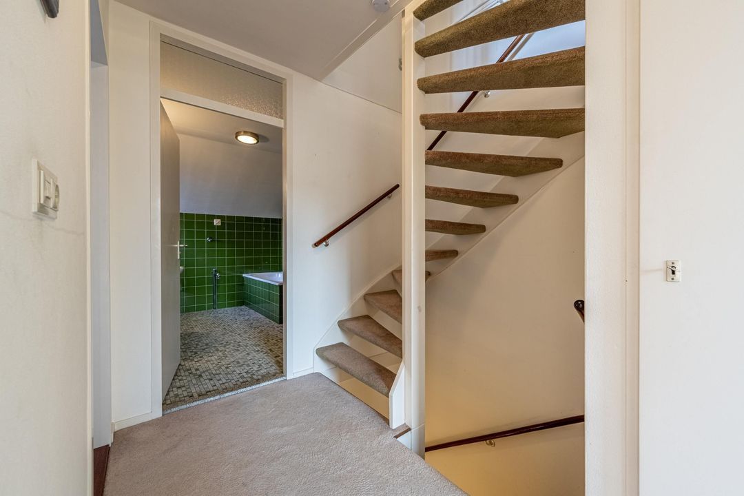 Entree met ruime hal, meterkast en trapopgang. In de hal bevindt zich de toiletruimte met staand toilet en fonteintje, uitgevoerd met lichte wandafwerking en een plavuizen vloer.