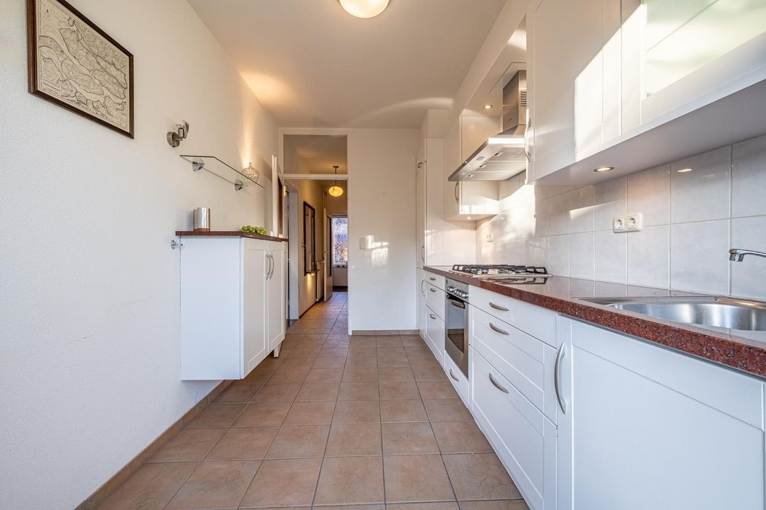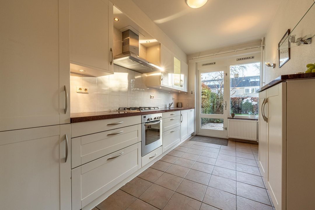 De keuken is voorzien van een 4-pits gaskookplaat met afzuigkap, oven, vaatwasser en koel-vriescombinatie. De keuken is uitgevoerd in een rechte opstelling en afgewerkt met witte fronten, een stenen werkblad en bovenkasten voor extra bergruimte. Vanuit de keuken is er toegang tot de tuin.