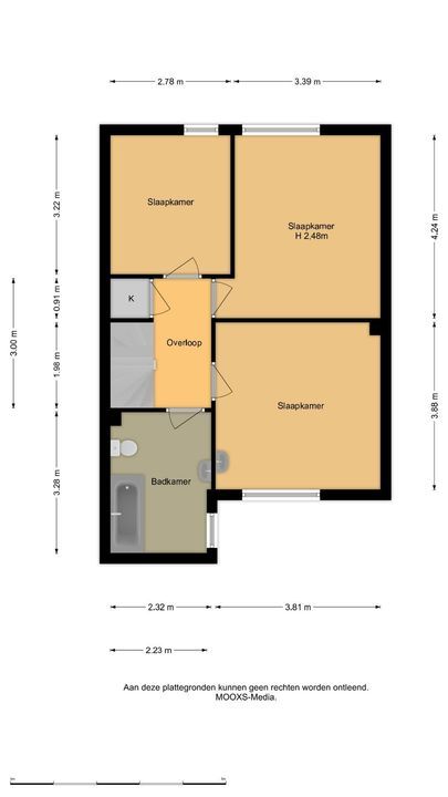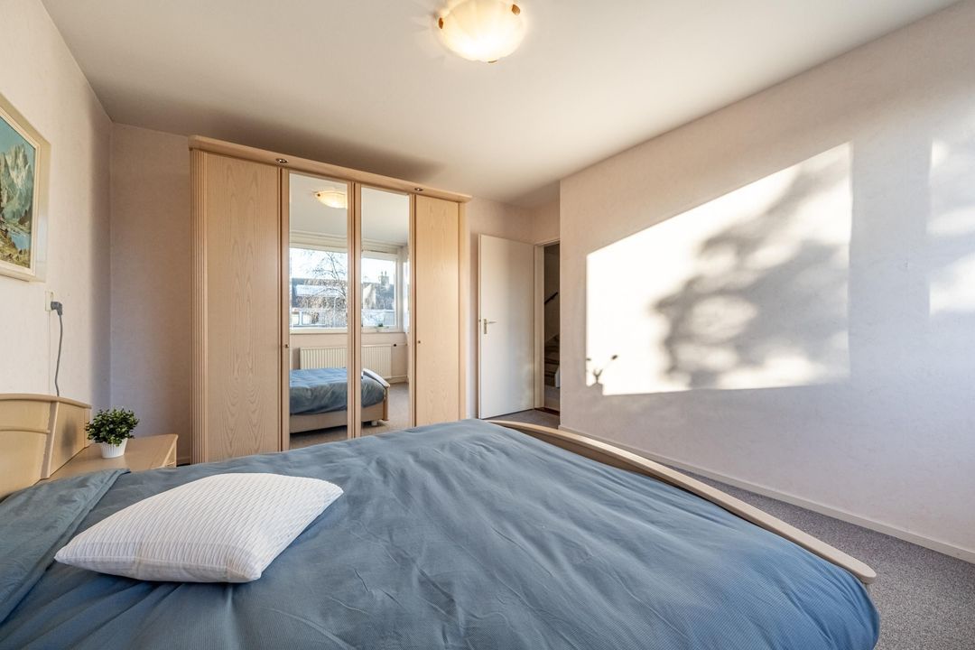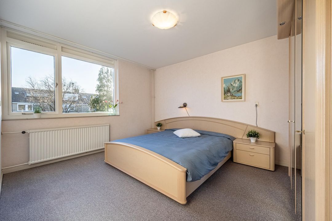 Overloop met toegang tot drie slaapkamers en de badkamer. De hoofdslaapkamer is ruim van opzet en is voorzien voorzien van zonwering. De tweede slaapkamer is evenals voorzien van zonwering. De derde slaapkamer is eveneens ruim en is uitgerust met een wastafel. Alle slaapkamers zijn afgewerkt met vloerbedekking.
