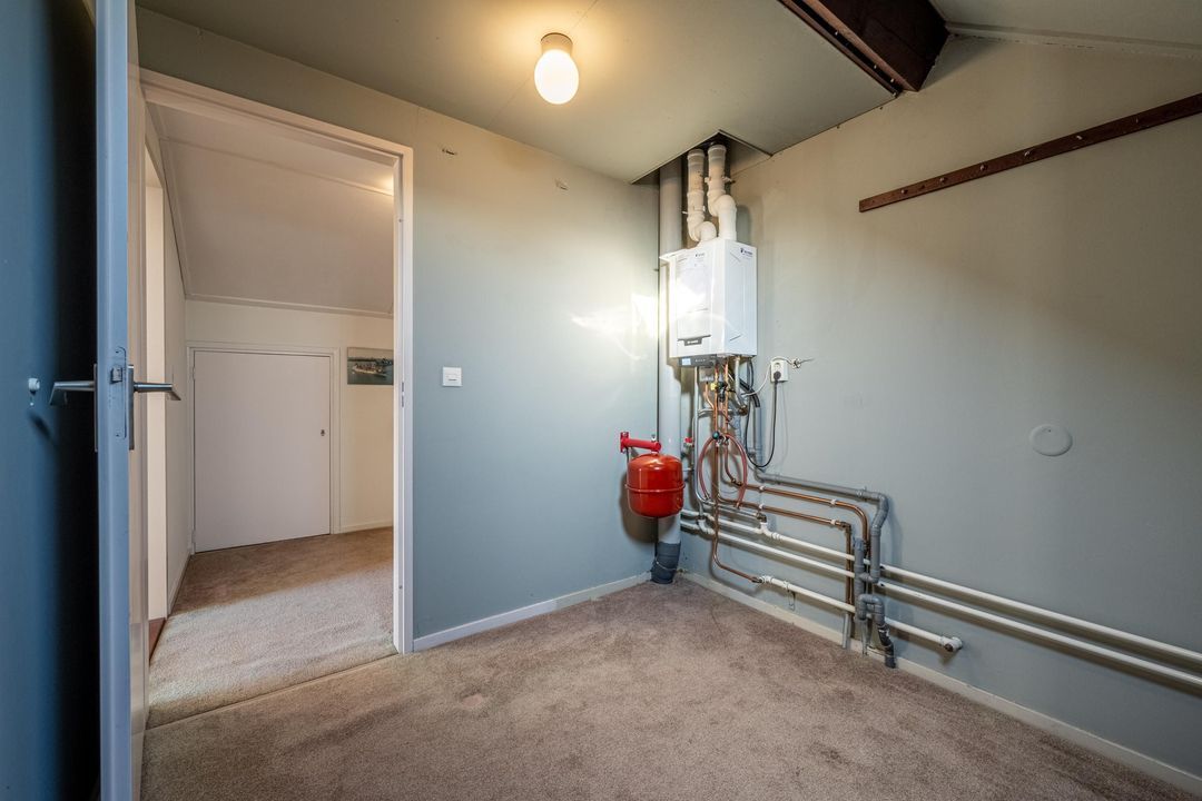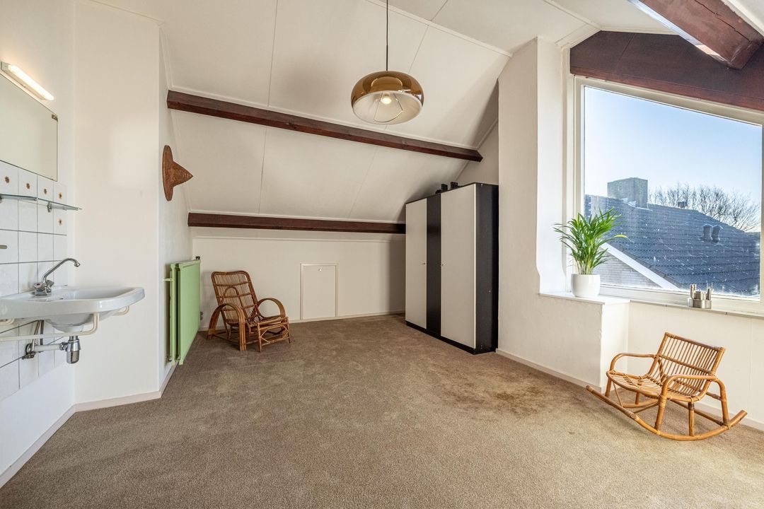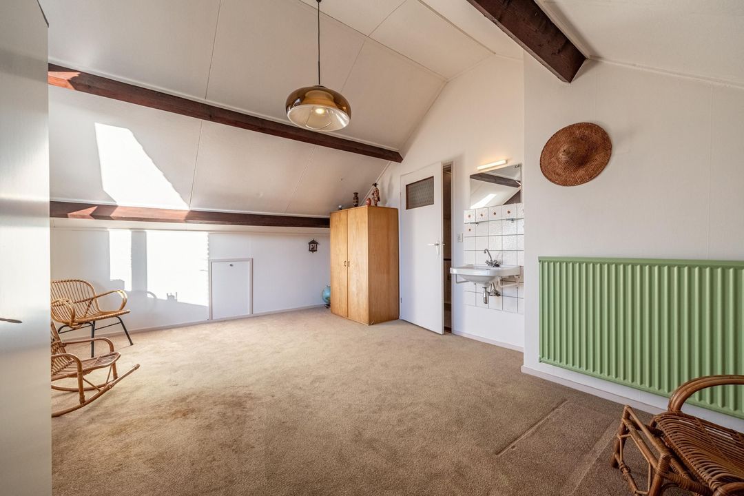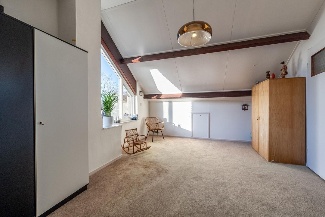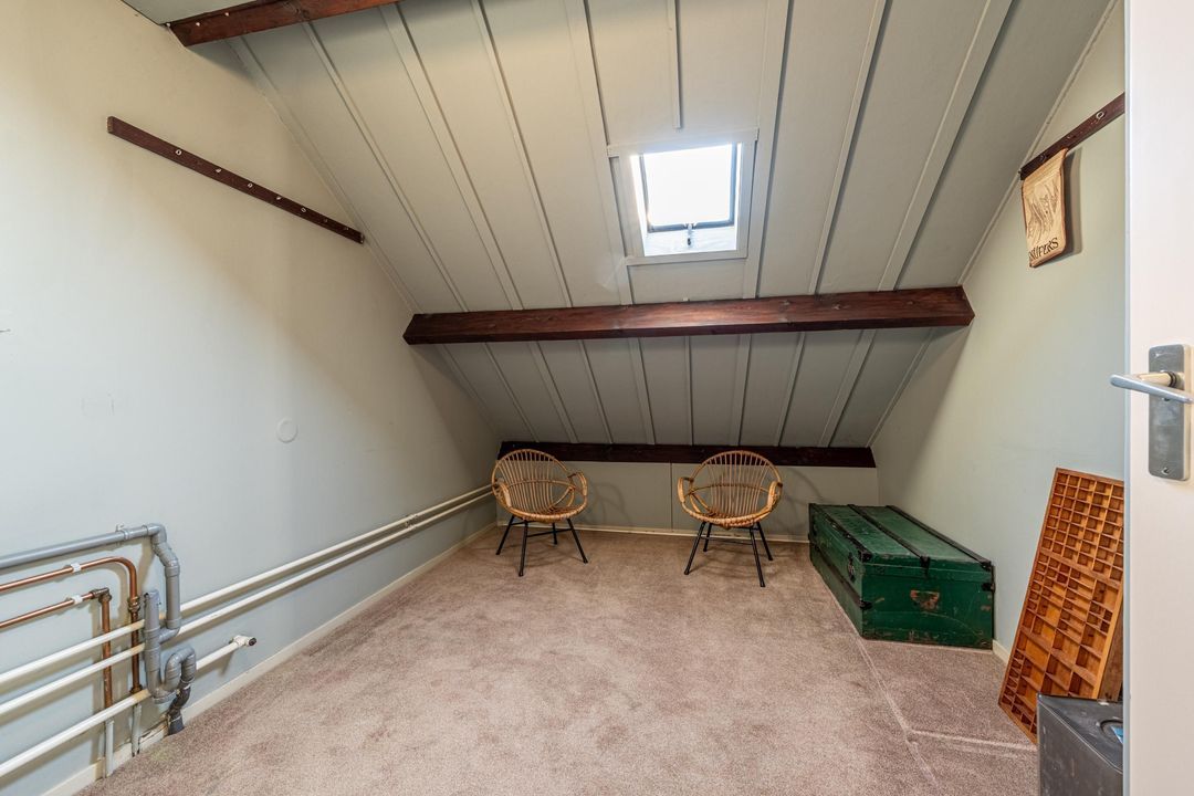 Overloop met bergruimte en toegang tot een volwaardige vierde slaapkamer. Deze kamer beschikt over een hoge nok, knieschotten en een wastafel. Daarnaast is er een separate stookruimte met dakraam. De verdieping is eveneens afgewerkt met vloerbedekking.