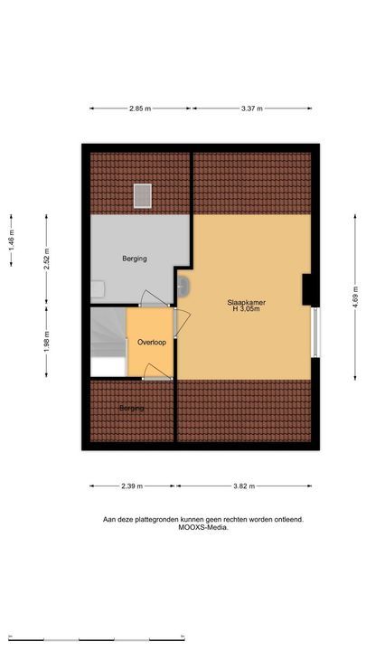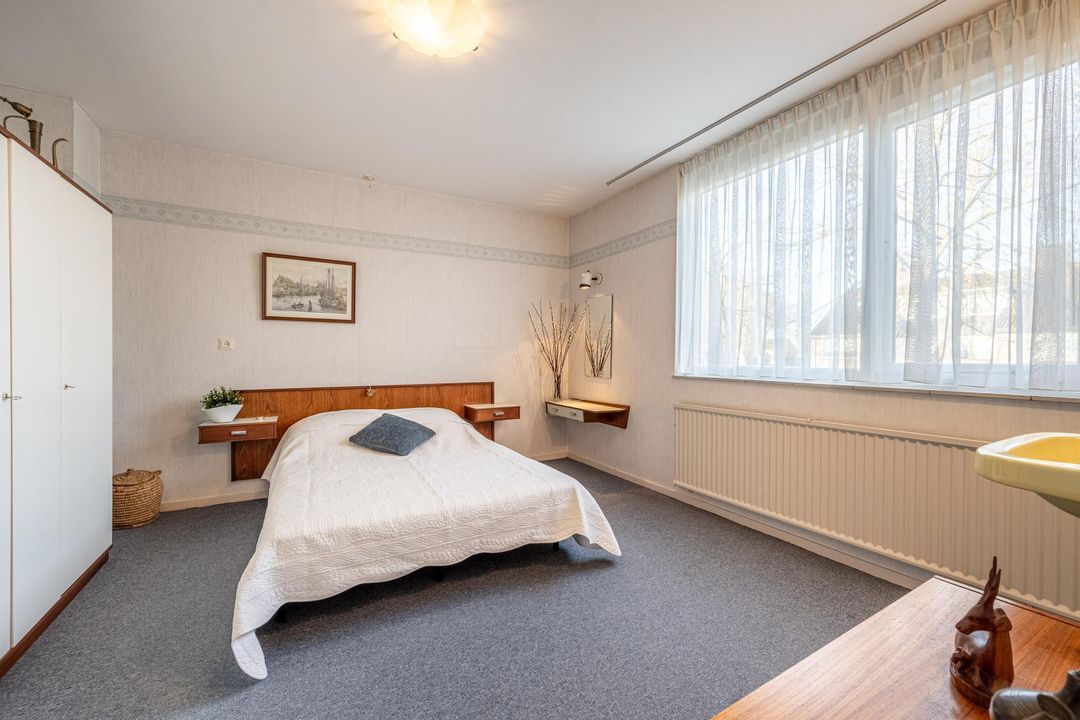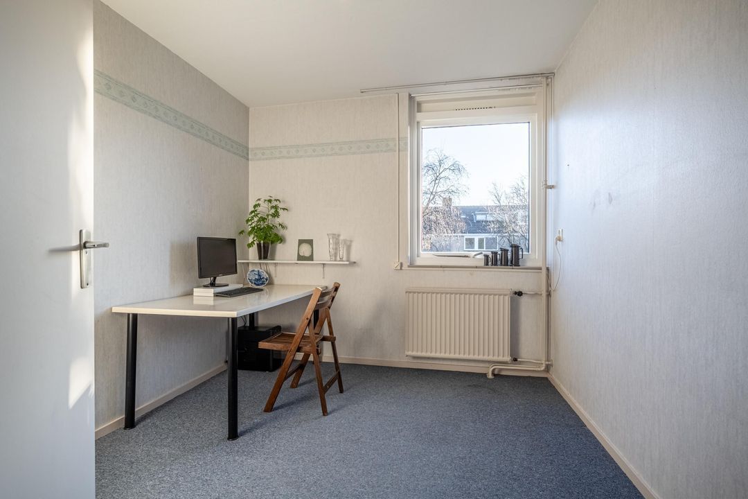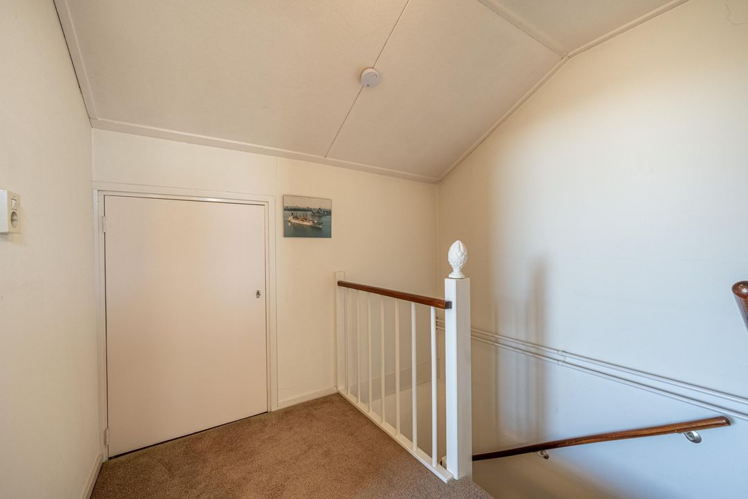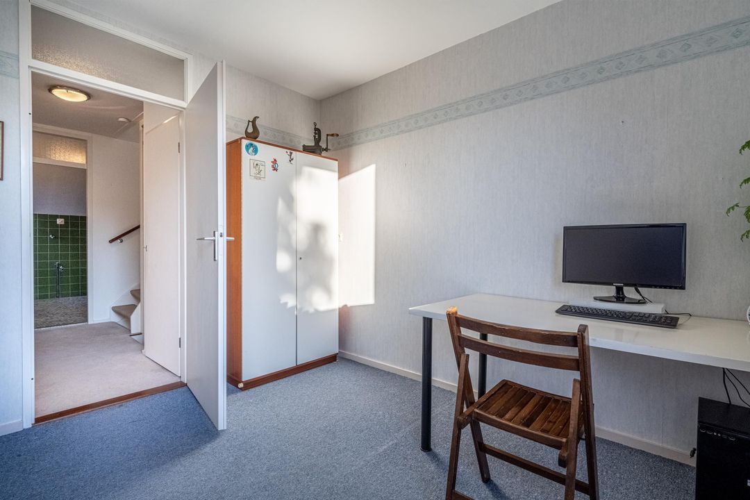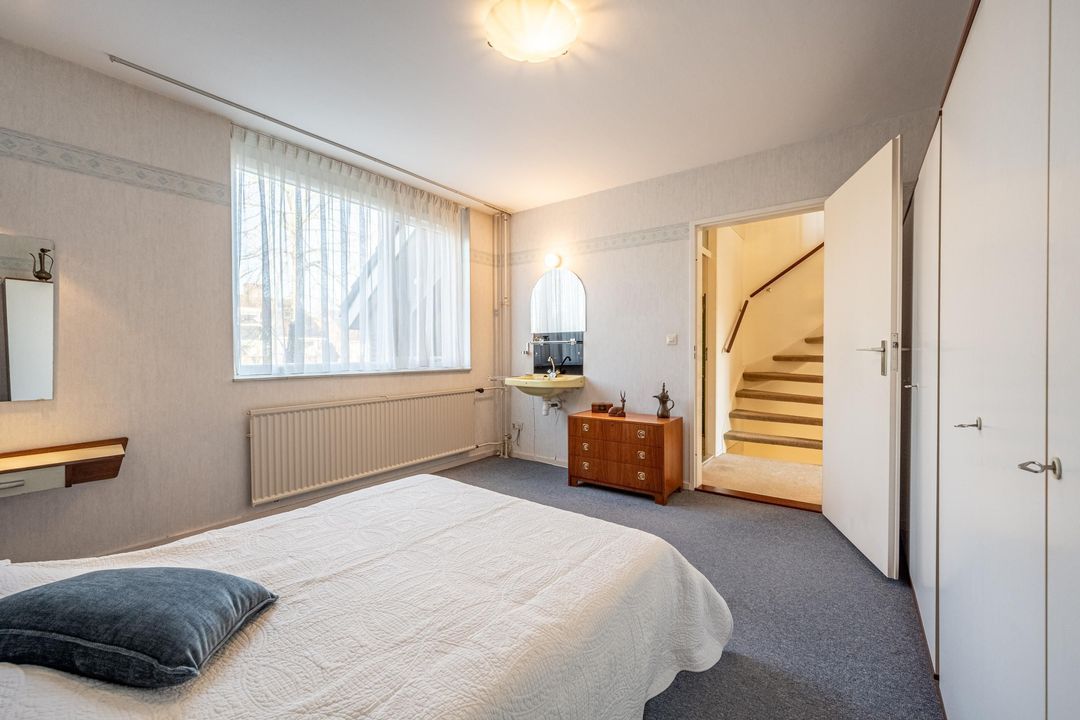 Overloop met bergruimte en toegang tot een volwaardige vierde slaapkamer. Deze kamer beschikt over een hoge nok, knieschotten en een wastafel. Daarnaast is er een separate stookruimte met dakraam. De verdieping is eveneens afgewerkt met vloerbedekking.