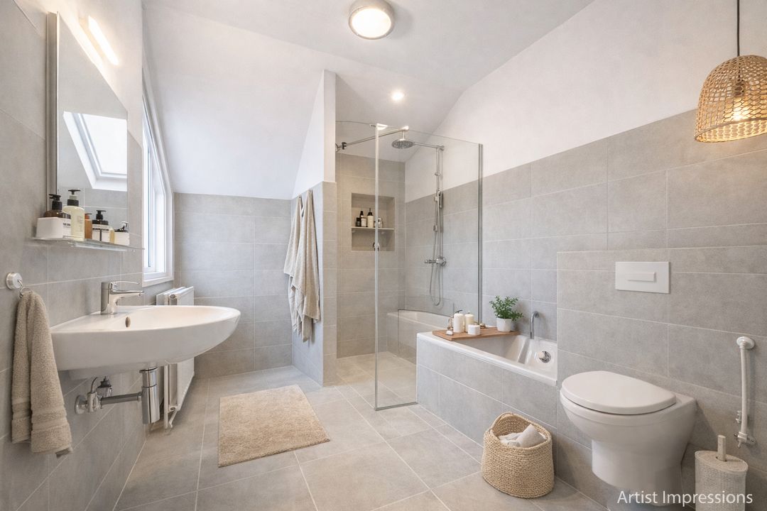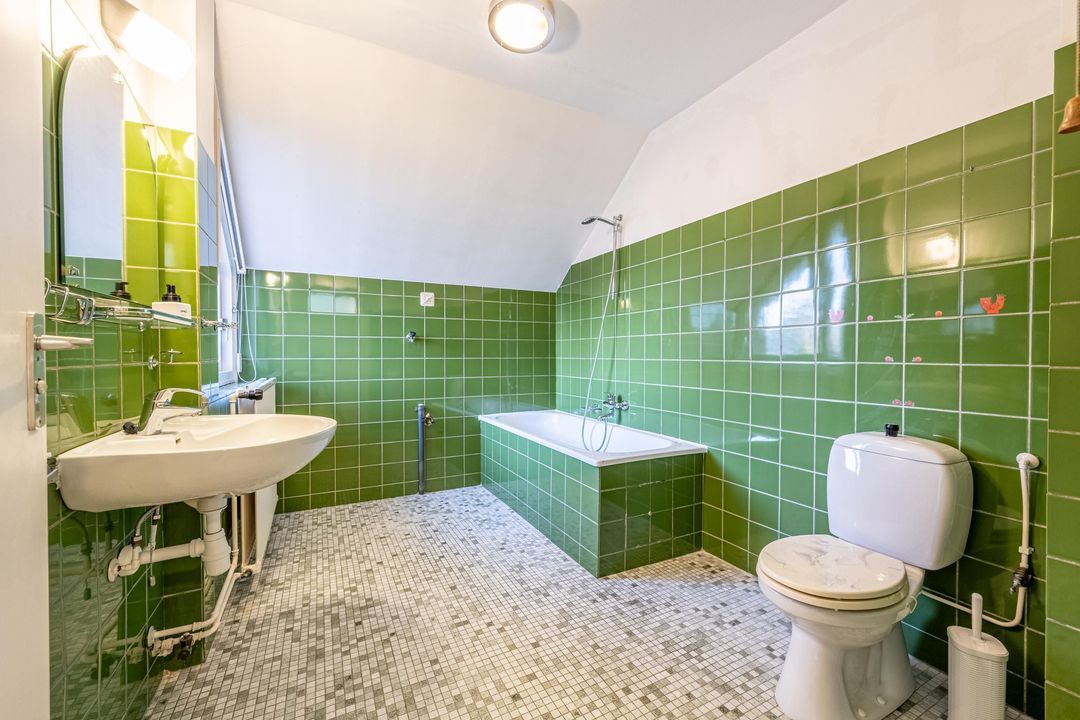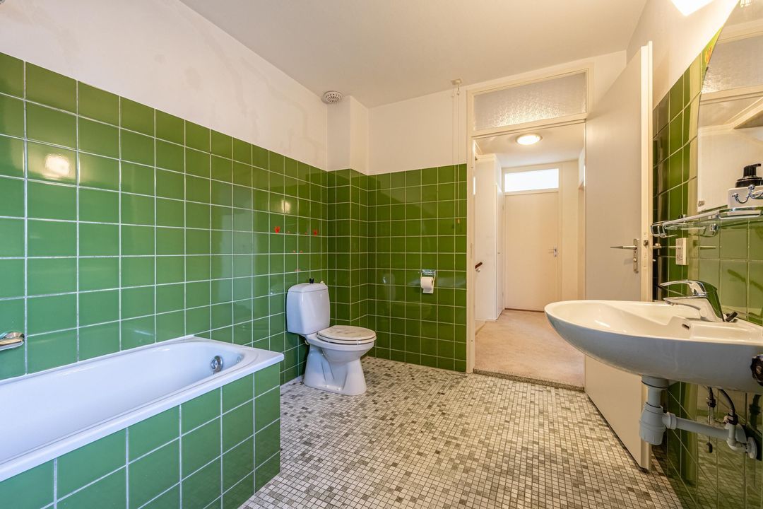 De badkamer is voorzien van een ligbad, douchecabine, wastafel, toilet, radiator en een wasmachineaansluiting. De badkamer is ruim en afgewerkt met groene wandtegels.