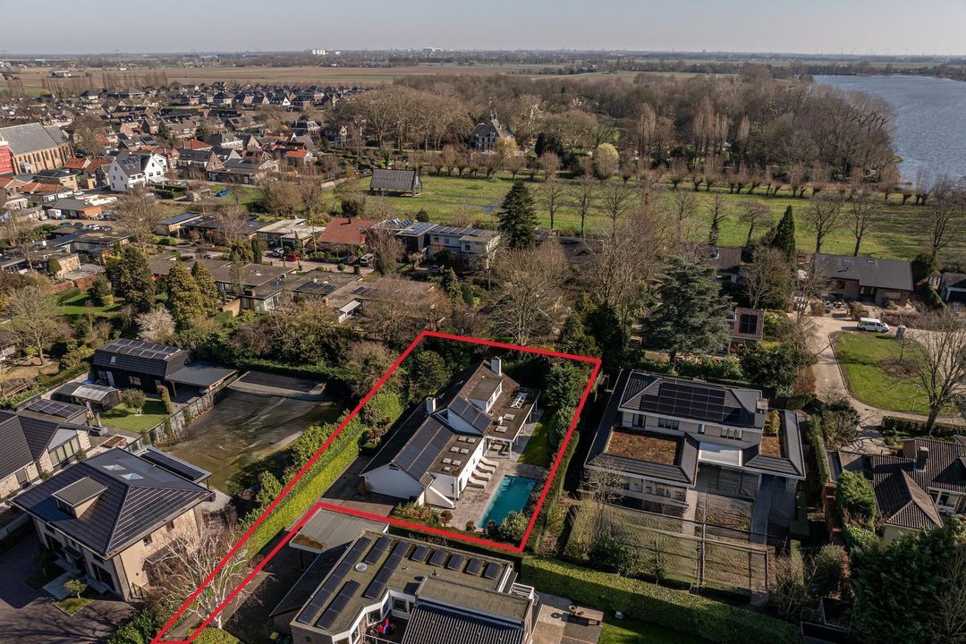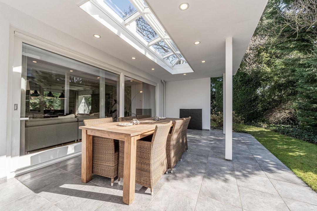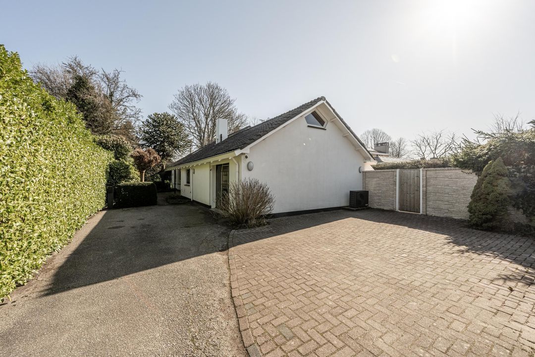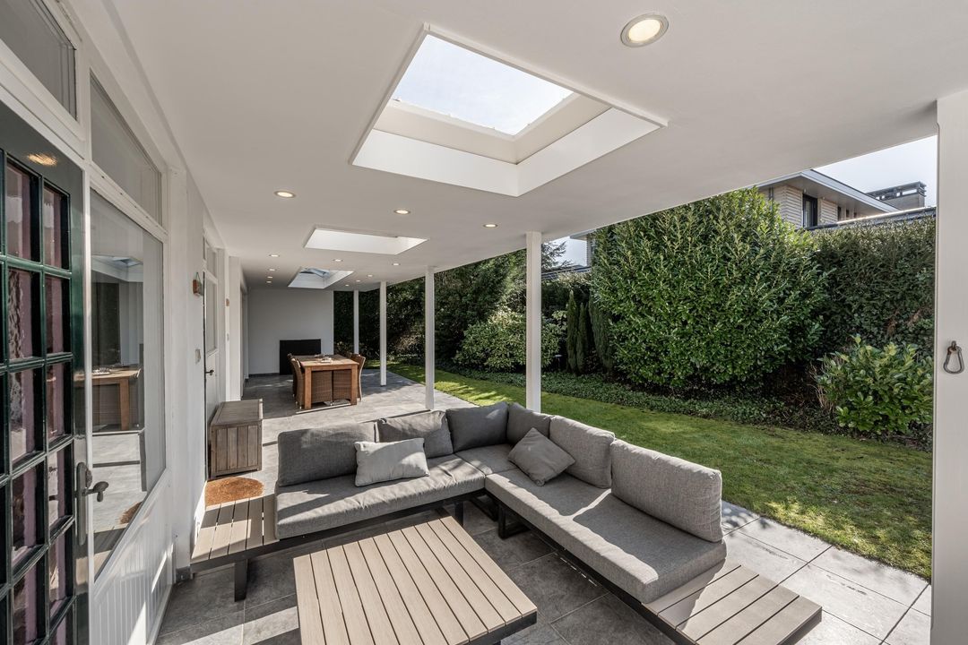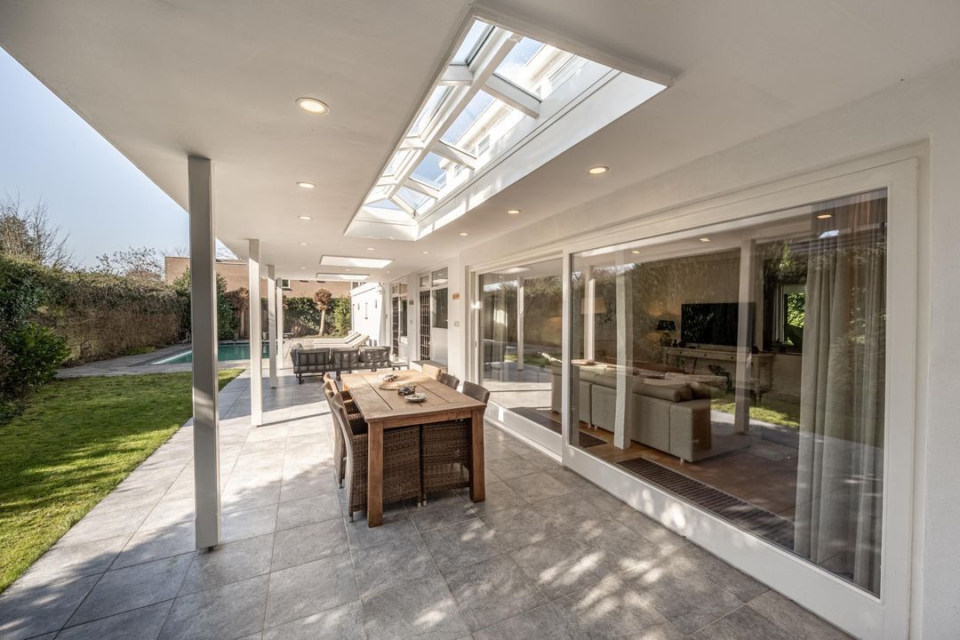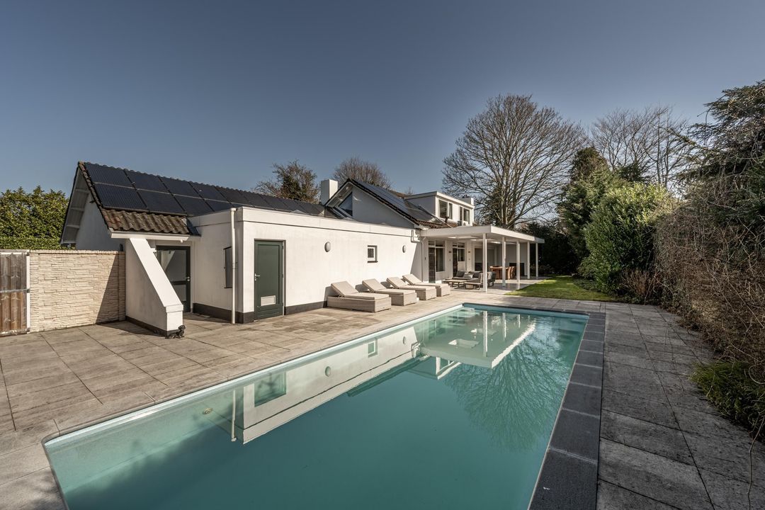 Aan de achterzijde van de woning ligt een grote veranda die zich uitstrekt langs de woonkamer, keuken en slaapkamer. Dankzij de grote lichtstraat en twee forse lichtkoepels is dit een opvallend lichte en uitnodigende plek. De veranda, achtertuin en het zwembad zijn nagenoeg pal op het zuiden georiënteerd, wat het buitenleven hier extra aantrekkelijk maakt. Het verwarmde zwembad van circa 9,50 x 3,50 meter, met een diepte van ongeveer 1,05 tot 1,70 meter, vormt samen met het royale zonneterras een heerlijke plek om te ontspannen. De warmtepomp van het zwembad is recent (in 2026) vernieuwd en er is een elektrisch bedienbaar roldek aanwezig. De achtertuin biedt veel privacy en voelt als een fijne, beschutte buitenruimte. Vanuit het terras is bovendien de technische ruimte van het zwembad bereikbaar. Op eigen terrein is parkeergelegenheid voor drie auto’s aanwezig.