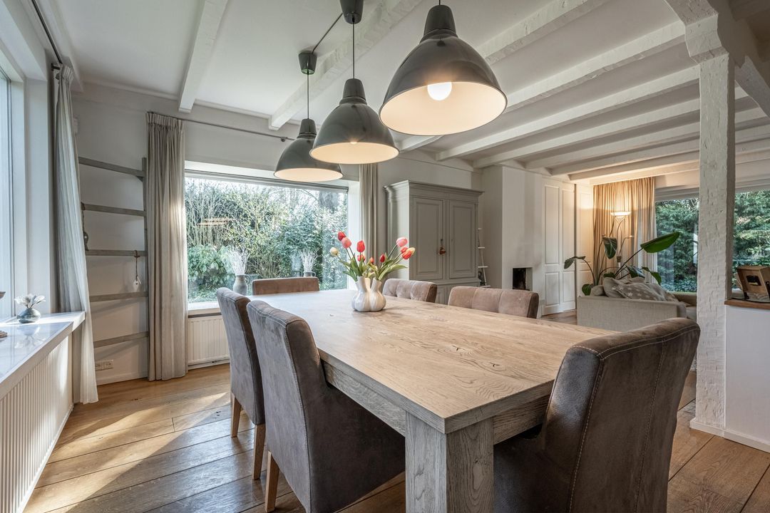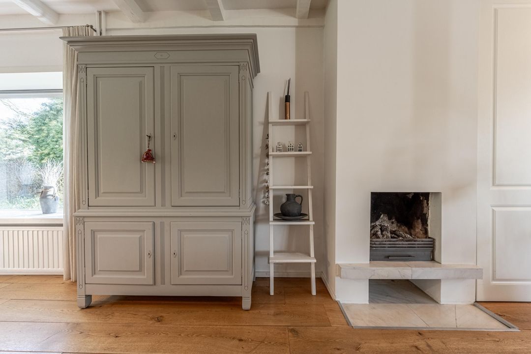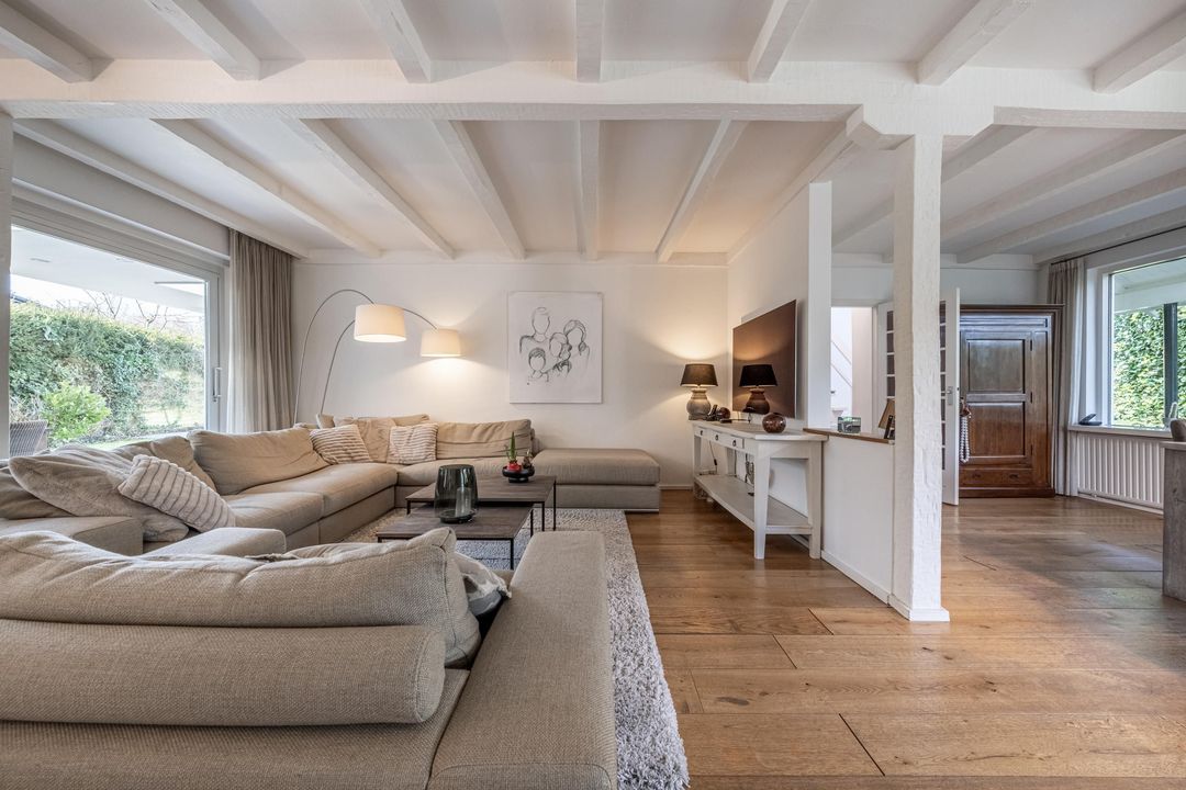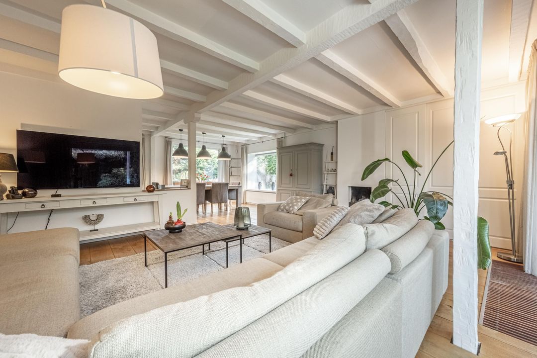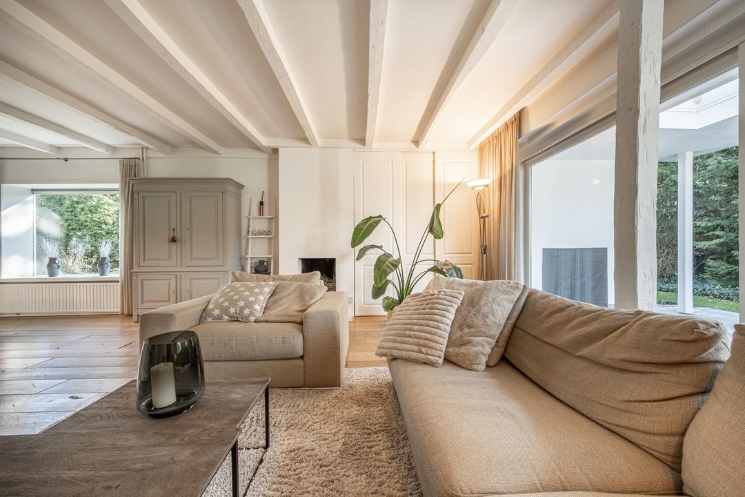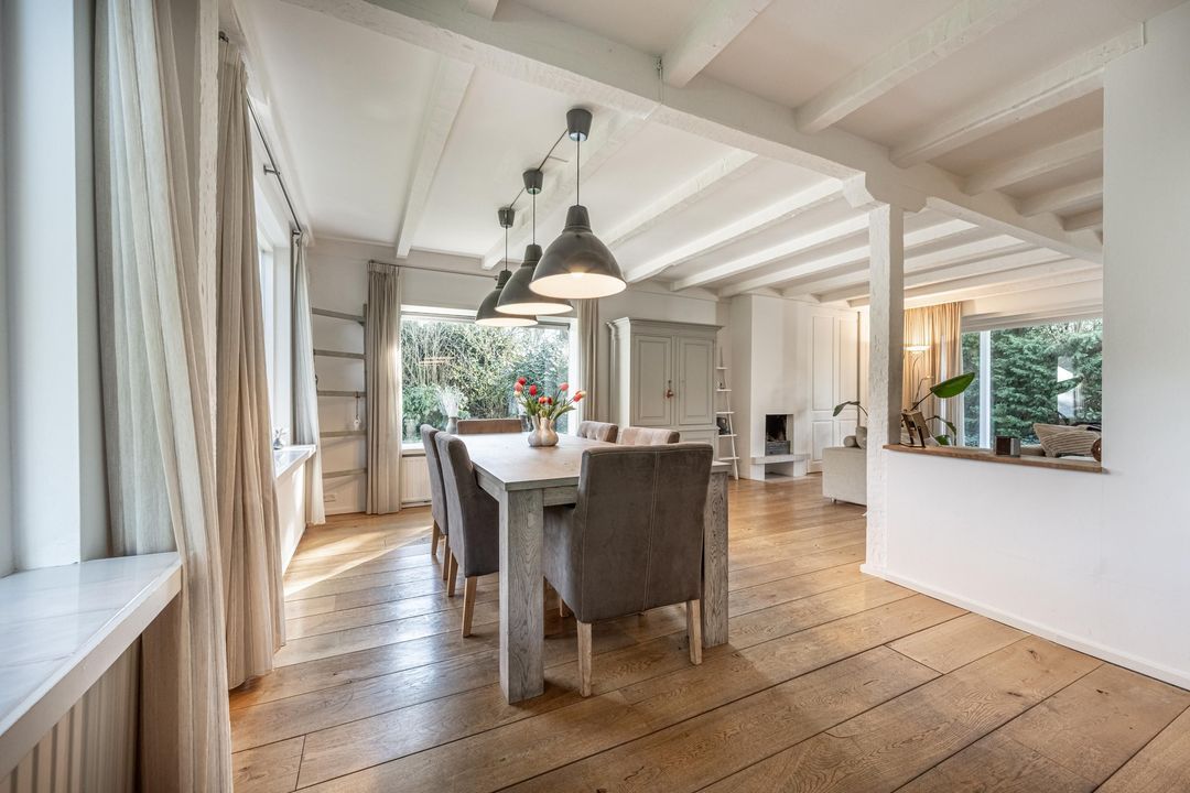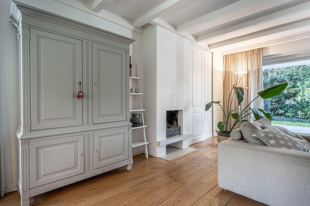 De woonkamer is een heerlijke verblijfsruimte. De maatvoering is mooi groot en vrijwel vierkant, wat zorgt voor rust en een prettige indeling. Het balkenplafond, de massief houten vloer en de glaspartijen aan drie zijden geven de ruimte veel sfeer en licht. Aan de achterzijde verbindt een schuifpui de woonkamer direct met de royale veranda. De open haard is nog aanwezig en draagt bij aan de uitstraling, maar is niet meer in gebruik. Vanuit de comfortabele entree, met garderobe, vide en prettig daglicht via een dakraam, zijn alle overige ruimtes op de begane grond goed bereikbaar.