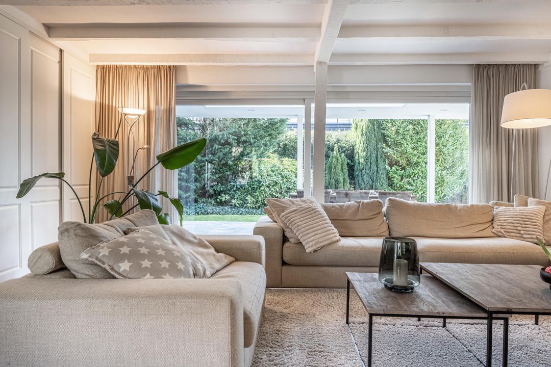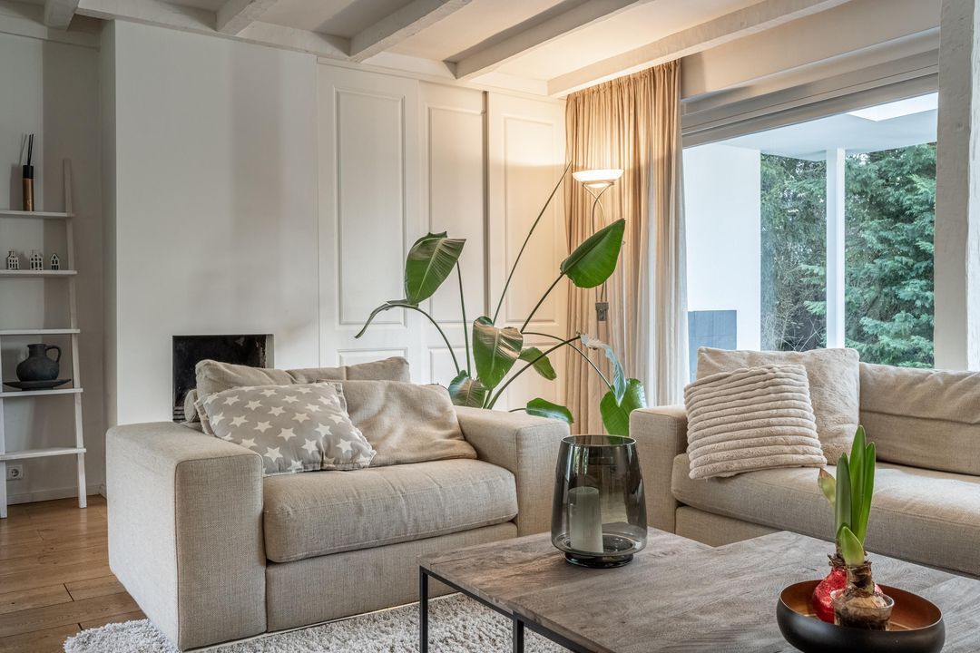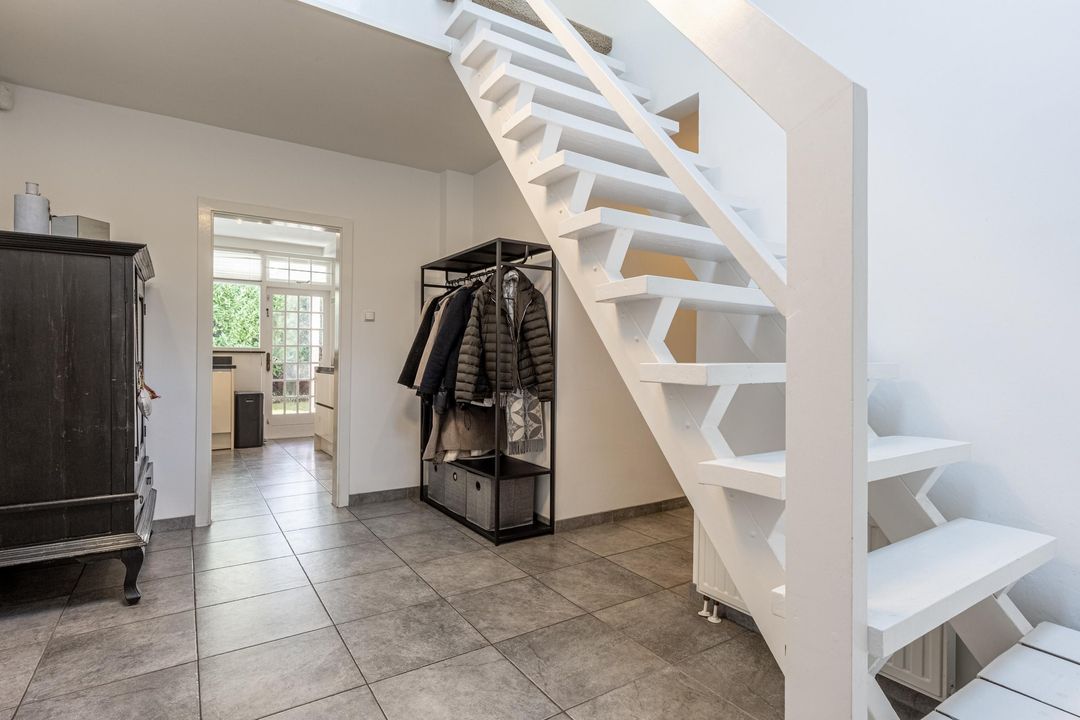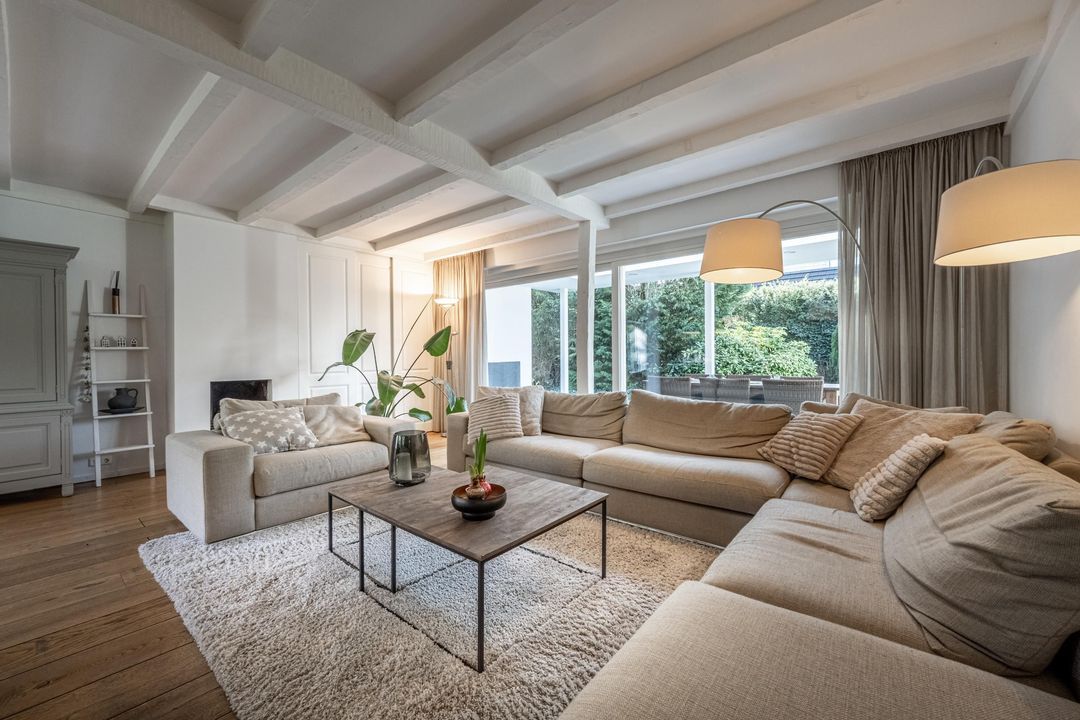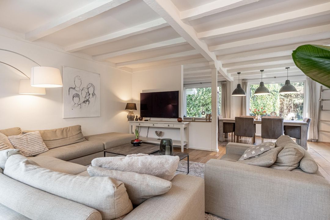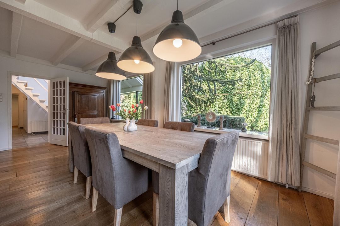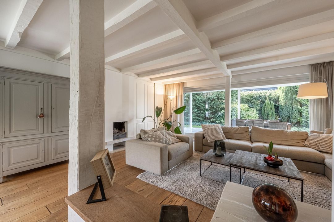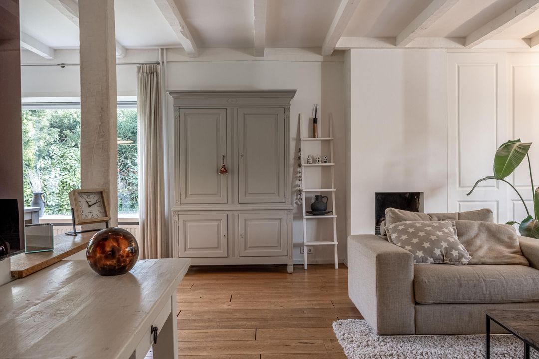 De woonkamer is een heerlijke verblijfsruimte. De maatvoering is mooi groot en vrijwel vierkant, wat zorgt voor rust en een prettige indeling. Het balkenplafond, de massief houten vloer en de glaspartijen aan drie zijden geven de ruimte veel sfeer en licht. Aan de achterzijde verbindt een schuifpui de woonkamer direct met de royale veranda. De open haard is nog aanwezig en draagt bij aan de uitstraling, maar is niet meer in gebruik. Vanuit de comfortabele entree, met garderobe, vide en prettig daglicht via een dakraam, zijn alle overige ruimtes op de begane grond goed bereikbaar.