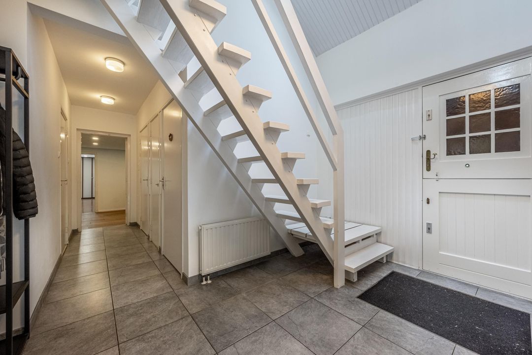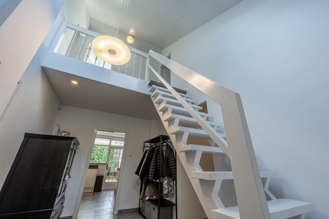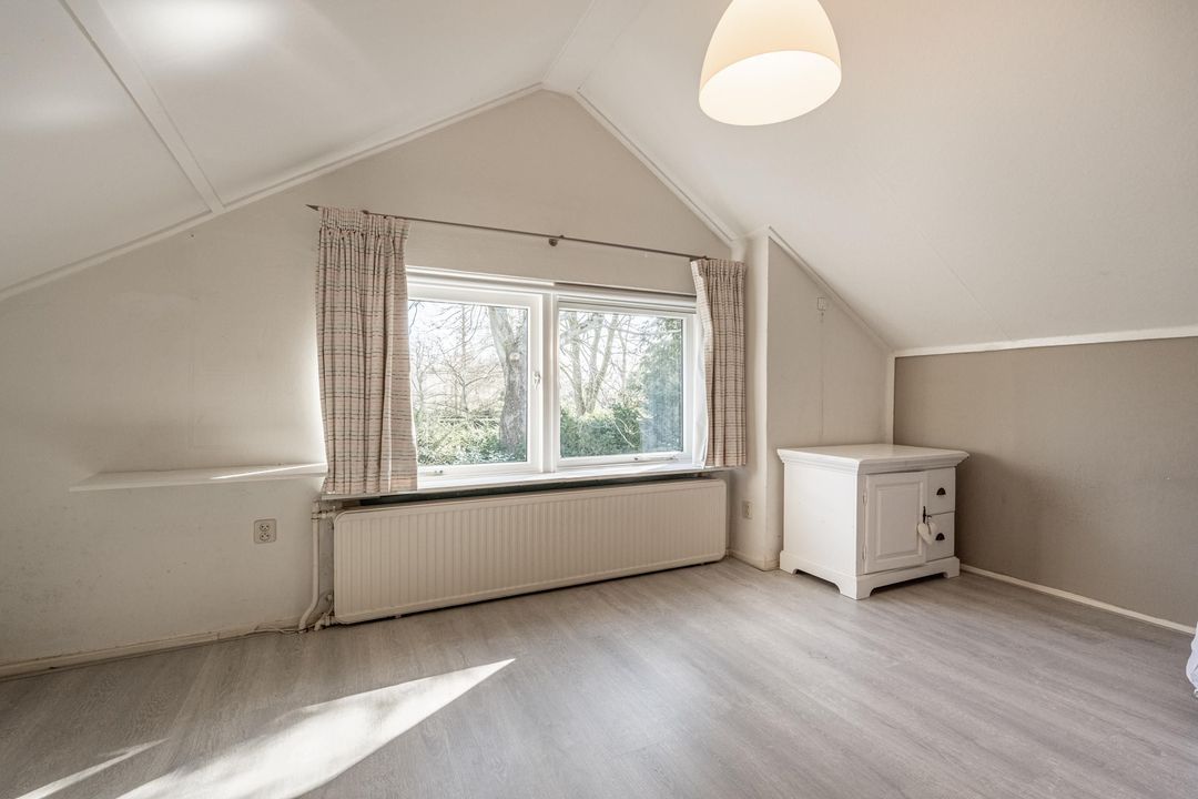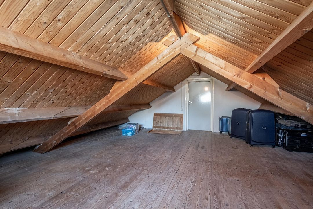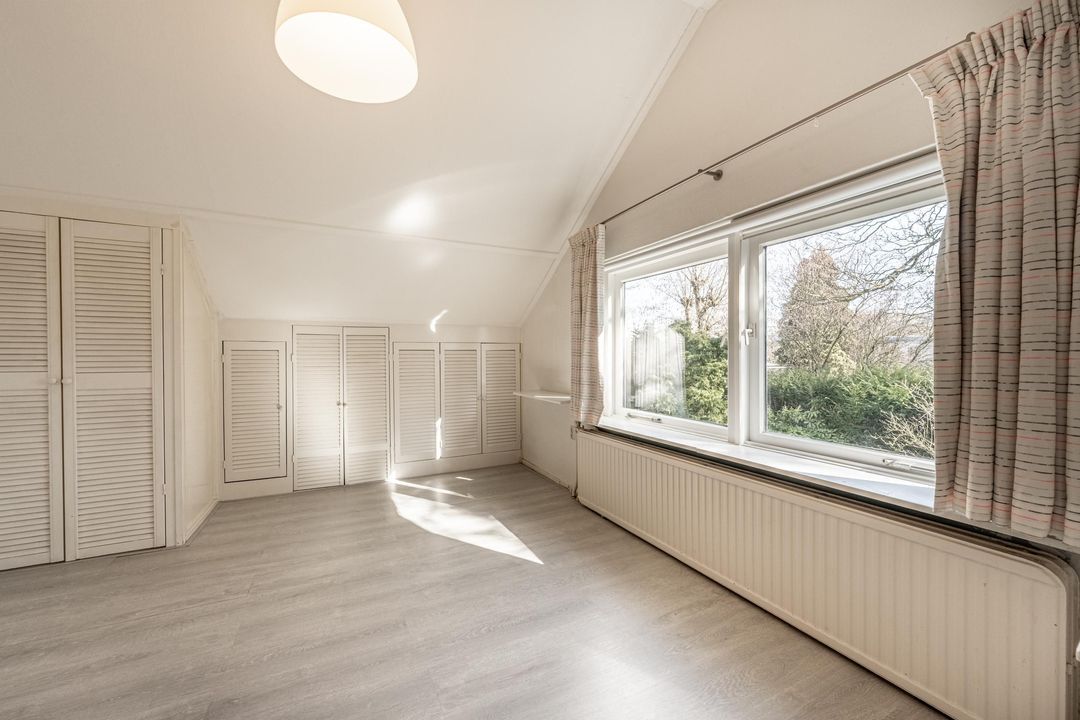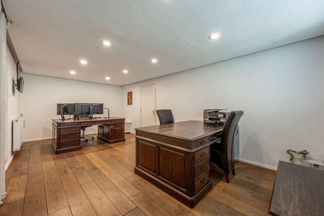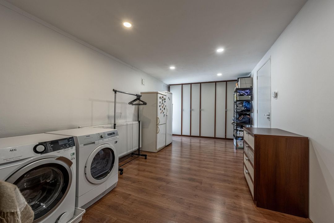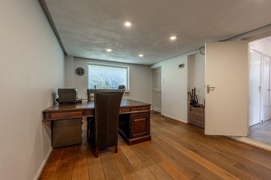 Vanuit de hal bereik je ook de grote kantoorruimte op de begane grond. Dit is een fijne plek om rustig te werken, maar deze ruimte kan natuurlijk ook uitstekend dienst doen als tweede slaapkamer op de begane grond. Aansluitend kom je in de voormalige dubbele garage, die nu is opgedeeld in drie praktische ruimtes: een bergruimte met vaste trap naar de vliering, een berging met elektrische roldeur die nu wordt gebruikt voor de fietsen, en een derde, grotere ruimte die in gebruik is als wasruimte en berging. Wie weer een echte garage wenst, kan deze ruimtes relatief eenvoudig anders indelen. Op de vliering is volop bergruimte op stahoogte aanwezig. Daarnaast is hier een separate technische ruimte met de cv-ketel, de verdeelkast van de vloerverwarming in de badkamer en de omvormer van de zonnepanelen, die in 2026 is vernieuwd.